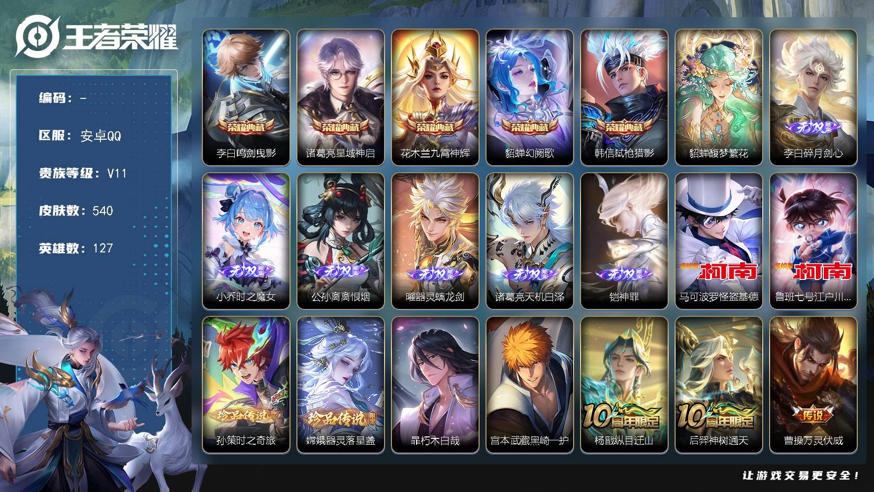 【游戏多多】 【可包人脸】安卓Q V11 最强王者段位 127英雄 540皮肤 5典藏 1珍品无双 6无双 6珍品传说 68传说 178史诗大区:安卓Q,营地:1869790179,贵族等级:11,【热门皮肤】:,【限定皮肤】:张良缤纷绘卷,曹操逐霄之志,少司缘巫礼祀神,杨戬纵目迁山,后羿神树通天,艾琳鹤鸣心笺,兰陵王傩神司,女娲万灵启世,孙权径山谋武,明世隐往忆晖光,莱西奥光弋星穹,亚瑟荣光之誓,张良罗小黑战记,哪吒罗小黑战记,桑启青衿临川,西施织梦人,公孙离涂山容容,鬼谷子克喵,司马懿九山相柳,莱西奥踏浪烽翎,典韦铁甲之心,墨子进击墨子号,高渐离落日弦歌,云中君云械蓝图,孙策百相守梦,周瑜百相守梦,云缨赞萌露比,庄周锦麟游梦,空空儿戏梦巡演,甄姬逆浪荇歌,白起死霸装,暃朽木白哉,宫本武藏黑崎一护,后羿石田雨龙,姬小满小满鸭,露娜命运加冕,雅典娜潮玩士官长,蒙犽狂想玩偶喵,裴擒虎祥瑞亨通,狂铁龙之律动,刘禅鸭鸭历险记,沈梦溪鸭鸭历险记,阿古朵布丁狗之约,钟馗虚灵犬护,刘备浪漫序章,马可波罗暗影游猎,阿轲化蝶舞,戈娅玫蓝誓约,明世隐景韶洛都,姬小满零食大作战,赵怀真器灵·浮梦炉,嫦娥器灵·落星盏,少司缘灵卦秘语,达摩爆裂喵拳,女娲愿照·千秋盛,蔡文姬愿照·福禄聚,虞姬愿照·岁时盈,妲己愿照·众生和,澜愿照·九州拓,姜子牙星梦巡礼,东皇太一金福满堂,廉颇无尽征程,西施雪境奇遇,雅典娜黎明之约,孙策时之奇旅,马超访茗客,孙膑茶境仙,影魅影绮裳,典韦铁骨偃魂,太乙真人谧流熔炉,苍苍林狼骑,牛魔星界战将,王昭君映山客,百里守约百相守梦,干将莫邪雾都夜雨,鲁班七号江户川柯南,吕布逐霄战戟,马可波罗怪盗基德,老夫子百相守梦,米莱狄怪诞之夜【荣耀典藏】:韩信弑枪猎影,花木兰九霄神辉,貂蝉幻阙歌,李白鸣剑·曳影,诸葛亮星域神启【截图或标题展示段位不代表实际段位,赛季更新等不可抗拒因素发生变化、时限道具不保证所剩时间,详情请看截图哦~】