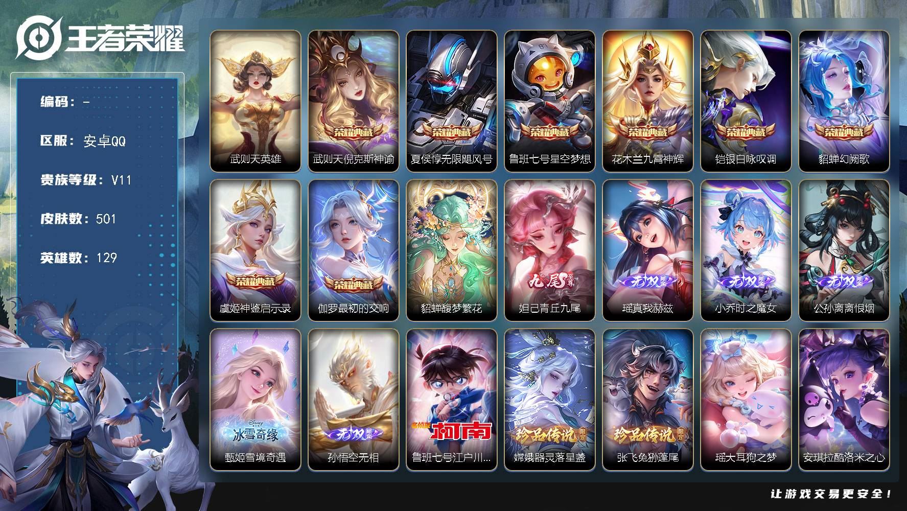 【游戏多多】 【可包人脸】安卓Q V11 最强王者段位 128英雄 748皮肤 18典藏 1珍品无双 12无双 9珍品传说 131传说 265史诗大区:安卓Q,营地:77469913,贵族等级:11,【热门皮肤】:,【限定皮肤】:蚩奼极光幻客,曹操逐霄之志,百里玄策罗小黑战记,杨戬纵目迁山,干将莫邪胡桃夹子,后羿神树通天,少司缘巫礼祀神,艾琳鹤鸣心笺,女娲万灵启世,兰陵王傩神司,莱西奥光弋星穹,明世隐往忆晖光,孙权径山谋武,张良罗小黑战记,亚瑟荣光之誓,哪吒罗小黑战记,桑启青衿临川,西施织梦人,干将莫邪千山共赴,公孙离涂山容容,元歌诡秘之主,鬼谷子克喵,大司命死亡执政官,弈星守夜人,莱西奥踏浪烽翎,司马懿九山相柳,朵莉亚幻珠鲛人,高渐离落日弦歌,周瑜百相守梦,孙策百相守梦,云缨赞萌露比,云中君云械蓝图,庄周锦麟游梦,空空儿戏梦巡演,甄姬逆浪荇歌,白起死霸装,暃朽木白哉,宫本武藏黑崎一护,后羿石田雨龙,姬小满小满鸭,牛魔小牛鸭,雅典娜潮玩士官长,露娜命运加冕,亚瑟布丁狗之誓,安琪拉酷洛米之心,瑶大耳狗之梦,阿古朵布丁狗之约,老夫子藏狐·褐绒,张良灵野札记,张飞兔狲·蓬尾,百里守约雪豹·霜爪,苏烈春野闲踪,公孙离云诺千山,小乔秘证寻踪,狂铁龙之律动,沈梦溪鸭鸭历险记,刘禅鸭鸭历险记,钟馗虚灵犬护,刘备浪漫序章,阿轲化蝶舞,戈娅玫蓝誓约,明世隐景韶洛都,西施续相思,杨玉环星之鸣奏,嫦娥器灵·落星盏,赵怀真器灵·浮梦炉,弈星万物之道,后羿千劫归真,少司缘灵卦秘语,达摩爆裂喵拳,女娲愿照·千秋盛,司空震愿照·山河定,虞姬愿照·岁时盈,蔡文姬愿照·福禄聚,妲己愿照·众生和,澜愿照·九州拓,裴擒虎祥瑞亨通,姜子牙星梦巡礼,东皇太一金福满堂,西施雪境奇遇【荣耀典藏】:武则天,伽罗最初的交响,瑶拾光映像,虞姬神鉴启示录,韩信弑枪猎影,诸葛亮星域神启,李白鸣剑·曳影,武则天倪克斯神谕,孙尚香杀手不太冷,小乔天鹅之梦,铠银白咏叹调,关羽赤影疾锋,孙悟空全息碎影,貂蝉幻阙歌,夏侯惇无限飓风号,程咬金活力突击,花木兰九霄神辉,鲁班七号星空梦想,芈月大秦宣太后【截图或标题展示段位不代表实际段位,赛季更新等不可抗拒因素发生变化、时限道具不保证所剩时间,详情请看截图哦~】