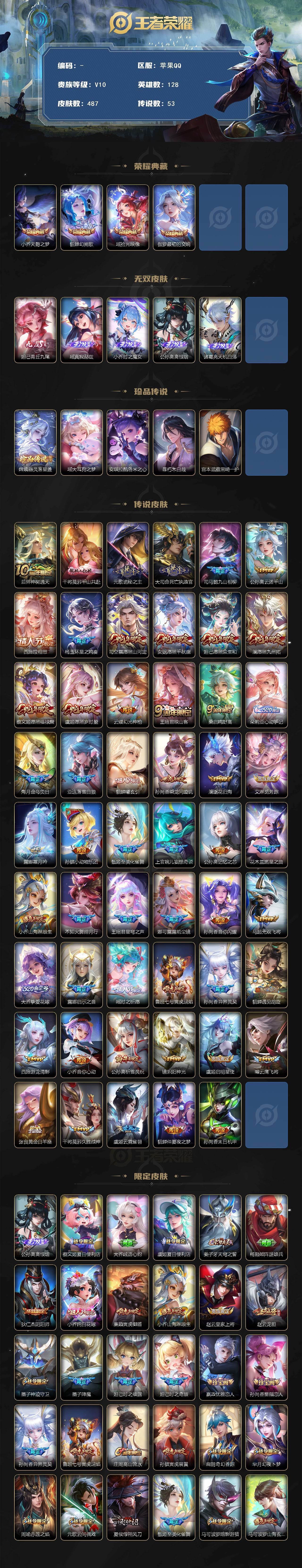 【游戏多多】 【可包人脸】苹果Q V10 至尊星耀III段位 128英雄 487皮肤 4典藏 0珍品无双 5无双 5珍品传说 53传说 152史诗大区:苹果Q,营地:2113757337,贵族等级:10,【热门皮肤】:,【限定皮肤】:鲁班七号班班快跑,桑启线条小狗,项羽九幽镇关,虞姬溯影追猎,蚩奼极光幻客,曹操逐霄之志,亚瑟荣光之誓,韩信街头霸王,后羿神树通天,艾琳女武神,少司缘巫礼祀神,艾琳鹤鸣心笺,女娲万灵启世,孙权径山谋武,哪吒罗小黑战记,张良罗小黑战记,桑启青衿临川,妲己时之奇旅,干将莫邪千山共赴,公孙离涂山容容,西施织梦人,元歌云间偶戏,花木兰燃星之曲,元歌诡秘之主,鬼谷子克喵,墨子降魔,弈星守夜人,大司命死亡执政官,莱西奥踏浪烽翎,艾琳觅芳踪,马超无双飞将,露娜霜月吟,澜逐花归海,阿轲爱心护理,云中君云械蓝图,海月王牌新星,典韦铁甲之心,司马懿九山相柳,朵莉亚幻珠鲛人,镜炽阳神光,盘古重装意志,高渐离落日弦歌,扁鹊救世之瞳,暃朽木白哉,宫本武藏黑崎一护,庄周锦麟游梦,云缨赞萌露比,甄姬逆浪荇歌,空空儿戏梦巡演,孙策百相守梦,周瑜百相守梦,鲁班七号寅虎·瑞焰,甄姬至美·化雀舞,白起死霸装,牛魔星界战将,姬小满小满鸭,牛魔小牛鸭,露娜命运加冕,雅典娜潮玩士官长,阿古朵布丁狗之约,安琪拉酷洛米之心,瑶大耳狗之梦,芈月红桃皇后,亚瑟布丁狗之誓,刘备汉昭烈帝,张良灵野札记,狂铁龙之律动,百里守约雪豹·霜爪,苏烈春野闲踪,沈梦溪鸭鸭历险记,刘禅鸭鸭历险记,小乔秘证寻踪,公孙离云诺千山,钟馗虚灵犬护,戈娅玫蓝誓约,阿轲化蝶舞,宫本武藏万象初新,西施续相思,上官婉儿妄想奇谈,杨玉环星之鸣奏【荣耀典藏】:伽罗最初的交响,瑶拾光映像,小乔天鹅之梦,貂蝉幻阙歌【截图或标题展示段位不代表实际段位,赛季更新等不可抗拒因素发生变化、时限道具不保证所剩时间,详情请看截图哦~】
