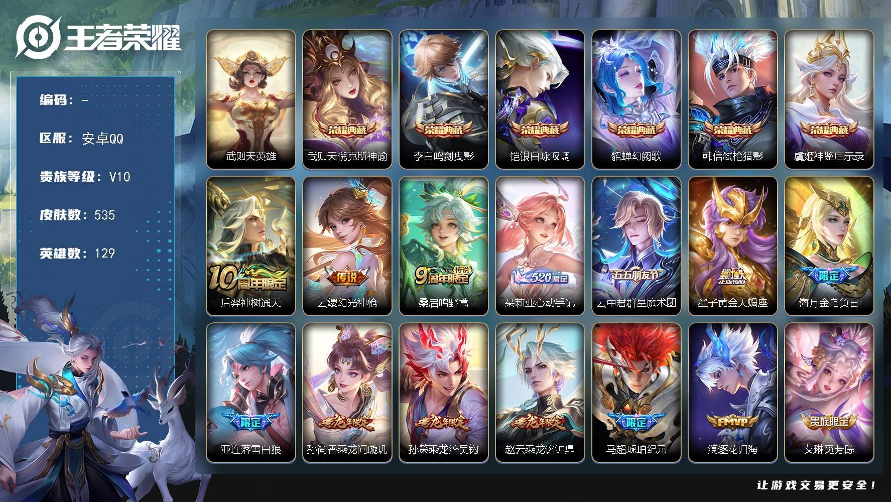 【游戏多多】 【可包人脸】安卓Q V10 最强王者段位 129英雄 535皮肤 6典藏 0珍品无双 0无双 0珍品传说 62传说 174史诗大区:安卓Q,营地:357240618,贵族等级:10,【热门皮肤】:,【限定皮肤】:周瑜线条小狗,项羽九幽镇关,桑启线条小狗,鬼谷子谜偶窥秘,虞姬溯影追猎,蚩奼极光幻客,百里玄策罗小黑战记,蔡文姬夏日便利店,明世隐往忆晖光,莱西奥光弋星穹,少司缘巫礼祀神,后羿神树通天,弈星万物之道,艾琳鹤鸣心笺,女娲万灵启世,孙权径山谋武,亚瑟荣光之誓,张良罗小黑战记,哪吒罗小黑战记,公孙离涂山容容,鬼谷子克喵,莱西奥踏浪烽翎,孙策百相守梦,周瑜百相守梦,朵莉亚幻珠鲛人,高渐离落日弦歌,甄姬逆浪荇歌,云中君云械蓝图,云缨赞萌露比,庄周锦麟游梦,空空儿戏梦巡演,白起死霸装,后羿石田雨龙,姬小满小满鸭,露娜命运加冕,雅典娜潮玩士官长,阿古朵布丁狗之约,刘禅鸭鸭历险记,沈梦溪鸭鸭历险记,狂铁龙之律动,张良灵野札记,苏烈春野闲踪,小乔秘证寻踪,钟馗虚灵犬护,刘备浪漫序章,阿轲化蝶舞,戈娅玫蓝誓约,姜子牙星梦巡礼,达摩爆裂喵拳,少司缘灵卦秘语,赵怀真器灵·浮梦炉,牛魔星界战将,西施雪境奇遇,影魅影绮裳,典韦铁骨偃魂,苍苍林狼骑,太乙真人谧流熔炉,武则天东方不败,干将莫邪雾都夜雨,米莱狄怪诞之夜,桑启鸣野蒿,亚瑟动物派对,东皇太一噬灭天穹,蒙犽顽岩魄,姬小满妄想食味,暃埋骨钱,大乔绒语心约,姜子牙天穹之誓,周瑜熔金海岸,西施游龙清影,安琪拉魔法小厨娘,杨戬破阵·退雄兵,貂蝉长夏之忆,朵莉亚心动手记,海诺心动手记,吕布天魔缭乱,刘备异域游侠,大司命暗都幽影,镜青焰无极,关羽决胜骁骑【荣耀典藏】:武则天,武则天倪克斯神谕,貂蝉幻阙歌,虞姬神鉴启示录,韩信弑枪猎影,铠银白咏叹调,李白鸣剑·曳影【截图或标题展示段位不代表实际段位,赛季更新等不可抗拒因素发生变化、时限道具不保证所剩时间,详情请看截图哦~】