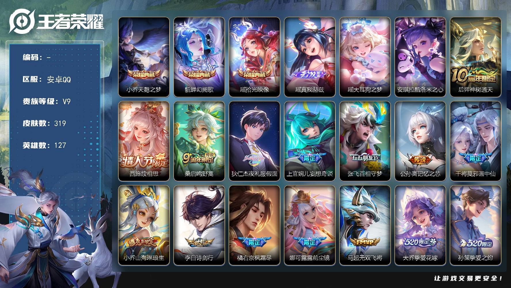 【游戏多多】 【可包人脸】安卓Q V9 至尊星耀III段位 127英雄 319皮肤 3典藏 0珍品无双 1无双 2珍品传说 33传说 99史诗大区:安卓Q,营地:2131587016,贵族等级:9,【热门皮肤】:,【限定皮肤】:西施雪境奇遇,少司缘灵卦秘语,周瑜线条小狗,项羽九幽镇关,沈梦溪龙舞盛年,戈娅危途狂花,女娲万灵启世,少司缘巫礼祀神,后羿神树通天,艾琳鹤鸣心笺,程咬金无双福将,姜子牙星梦巡礼,海诺时空谍影,百里玄策原初追逐者,亚瑟荣光之誓,张良罗小黑战记,影魅影绮裳,西施织梦人,鬼谷子克喵,程咬金星际陆战队,莱西奥踏浪烽翎,弈星万物之道,甄姬逆浪荇歌,朵莉亚幻珠鲛人,云中君云械蓝图,庄周锦麟游梦,空空儿戏梦巡演,白起死霸装,后羿石田雨龙,姬小满小满鸭,戈娅玫蓝誓约,哪吒次元突破,明世隐景韶洛都,西施续相思,赵怀真器灵·浮梦炉,白起白色死神,宫本武藏未来纪元,姜子牙时尚教父,太乙真人谧流熔炉,苍苍林狼骑,吕布逐霄战戟,干将莫邪雾都夜雨,东皇太一噬灭天穹,亚瑟心灵战警,桑启鸣野蒿,廉颇功夫炙烤,狄仁杰夜礼服假面,司空震地狱燃心,妲己时之奇旅,西施至美·乘鲤谣,阿古朵江河有灵,貂蝉逐梦之音,海月王牌新星,张良古海寻踪,艾琳流音漫舞,上官婉儿妄想奇谈,鬼谷子幻乐之宴,戈娅驭风魔法,西施玲珑珍味,吕布野性能量,鲁班大师探海日志,姬小满零食大作战,李白凤求凰,扁鹊奇幻香踪,王昭君幻想奇妙夜,刘备万事如意,杨戬潮玩骑兵,沈梦溪匿光破解者,莱西奥西部游侠,刘备时之恋人,太乙真人劲辣红锅,达摩拳王,张飞百相守梦,庄周云端筑梦师,裴擒虎擒涛扼浪,赵怀真太极少年,马可波罗山海·玄木吟,暃星界游侠,嫦娥暖冬·兔眠,干将莫邪画中仙【荣耀典藏】:貂蝉幻阙歌,小乔天鹅之梦,瑶拾光映像【截图或标题展示段位不代表实际段位,赛季更新等不可抗拒因素发生变化、时限道具不保证所剩时间,详情请看截图哦~】