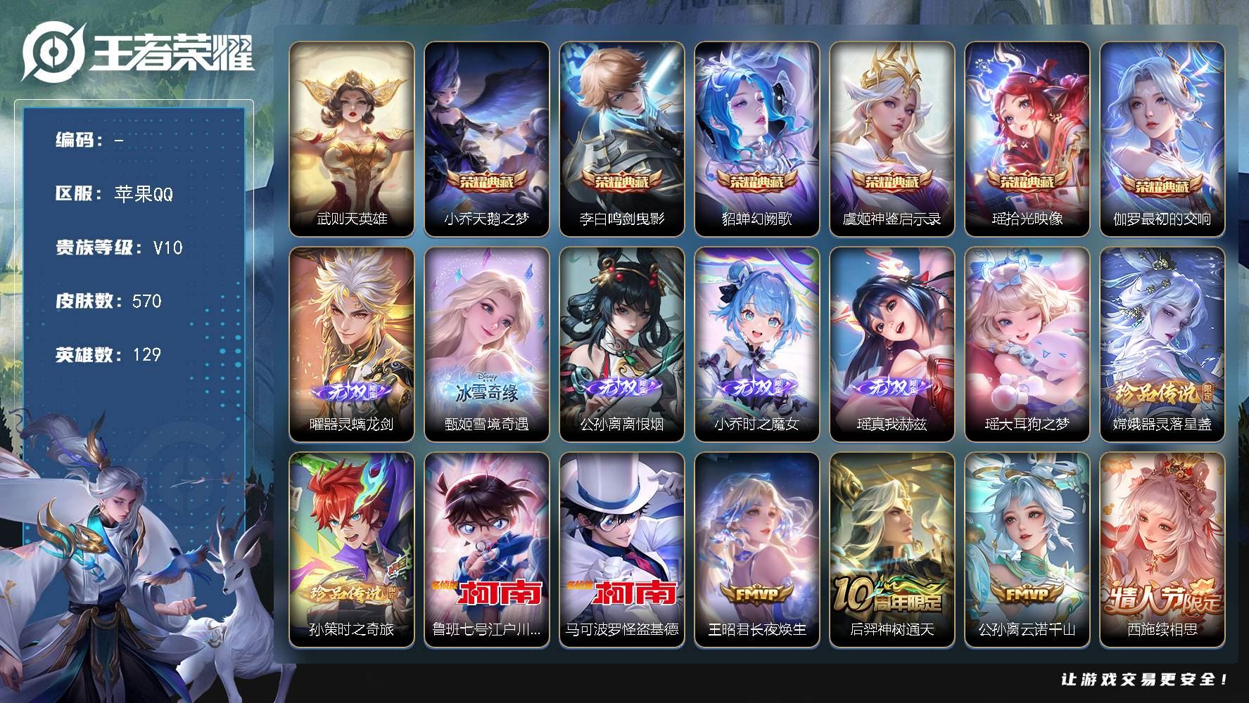【游戏多多】 【可包人脸】苹果Q V10 至尊星耀I段位 129英雄 570皮肤 6典藏 0珍品无双 5无双 5珍品传说 88传说 202史诗大区:苹果Q,营地:1889124990,贵族等级:10,【热门皮肤】:,【限定皮肤】:吕布舞狮寰,敖隐赤刃凌霄,明世隐百晓客,钟馗锁墨魂,兰陵王雾影缉谜,空空儿戏梦巡演,王昭君长夜焕生,狂铁龙之律动,小乔线条小狗,蚩奼极光幻客,虞姬溯影追猎,鬼谷子谜偶窥秘,周瑜线条小狗,鲁班七号班班快跑,桑启线条小狗,孙权径山谋武,项羽九幽镇关,后羿神树通天,艾琳鹤鸣心笺,亚瑟荣光之誓,鬼谷子克喵,莱西奥踏浪烽翎,甄姬逆浪荇歌,云中君云械蓝图,后羿石田雨龙,白起死霸装,姬小满小满鸭,露娜命运加冕,阿古朵布丁狗之约,蒙犽狂想玩偶喵,瑶大耳狗之梦,盘古冰霜神祇,张良灵野札记,钟馗虚灵犬护,公孙离云诺千山,沈梦溪鸭鸭历险记,刘禅鸭鸭历险记,小乔秘证寻踪,刘备浪漫序章,太乙真人谧流熔炉,戈娅玫蓝誓约,阿轲化蝶舞,明世隐景韶洛都,西施续相思,马可波罗暗影游猎,杨玉环星之鸣奏,嫦娥器灵·落星盏,后羿千劫归真,裴擒虎祥瑞亨通,虞姬愿照·岁时盈,女娲愿照·千秋盛,蔡文姬愿照·福禄聚,司空震愿照·山河定,澜愿照·九州拓,妲己愿照·众生和,达摩爆裂喵拳,少司缘灵卦秘语,弈星万物之道,姜子牙星梦巡礼,东皇太一金福满堂,西施雪境奇遇,典韦铁骨偃魂,孙策时之奇旅,苍苍林狼骑,影魅影绮裳,嬴政玄雷天君,马超访茗客,孙膑茶境仙,牛魔星界战将,阿轲迷踪丽影,干将莫邪雾都夜雨,百里守约百相守梦,吕布逐霄战戟,鲁班七号江户川柯南,马可波罗怪盗基德,老夫子百相守梦,米莱狄怪诞之夜,桑启鸣野蒿,甄姬游园惊梦,王昭君映山客【荣耀典藏】:武则天,伽罗最初的交响,瑶拾光映像,虞姬神鉴启示录,貂蝉幻阙歌,李白鸣剑·曳影,小乔天鹅之梦【截图或标题展示段位不代表实际段位,赛季更新等不可抗拒因素发生变化、时限道具不保证所剩时间,详情请看截图哦~】