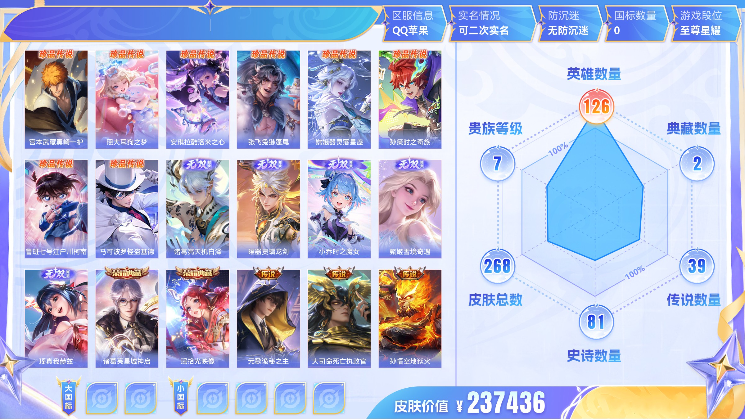 【游戏多多】 【可二次实名】【69sjv1e22】 珍品传说8 无双5 典藏2 传说39 史诗81 限定103 英雄126 皮肤268 稀有英雄9 贵族7级 总场次2689 皮肤价值:237436 【珍品传说8】 宫本武藏黑崎一护 瑶大耳狗之梦 安琪拉酷洛米之心 张飞兔狲蓬尾 嫦娥器灵落星盏 孙策时之奇旅 鲁班七号江户川柯南 马可波罗怪盗基德【无双皮肤5】 诸葛亮天机白泽 曜器灵螭龙剑 小乔时之魔女 甄姬雪境奇遇 瑶真我赫兹【荣耀典藏2】 诸葛亮星域神启 瑶拾光映像【传说皮肤39】 元歌诡秘之主 大司命死亡执政官 孙悟空地狱火 艾琳觅芳踪 公孙离云诺千山 上官婉儿妄想奇谈 西施续相思 杨玉环星之鸣奏 公孙离祈雪灵祝 镜炽阳神光 后羿千劫归真 云缨幻光神呛 不知火舞绯月行 张飞百相守梦 女娲愿照千秋盛 司空震愿照山河定 虞姬愿照岁时盈 蔡文姬愿照福禄聚 澜愿照九州拓 妲己愿照众生和 裴擒虎祥瑞亨通 夏洛特浮生妄 鲁班七号时之奇旅 嬴政玄雷天君 花木兰燃星之曲 貂蝉仲夏夜之梦 干将莫邪画中仙 虞姬启明星使 公孙离记忆之芯 李信山海炽霜斩 孙尚香音你闪耀 小乔山海琳琅生 桑启鸣野蒿 王昭君映山客 典韦战鼓燎原 露娜霜月吟 澜逐花归海 貂蝉猫影幻舞 庄周牧神诗旅【史诗皮肤81】 西施织梦人 公孙离涂山容容 孙悟空至尊宝 少司缘涂山红红 嬴政暗夜贵公子 弈星守夜人 黄忠百相守梦 大乔白鹤梁神女 朵莉亚幻珠鲛人 程咬金功夫厨神 后羿石田雨龙 牛魔小牛鸭 上官婉儿神器万象笔 牛魔星界战将 李白千年之狐 关羽百相守梦 百里玄策热力回旋 亚瑟布丁狗之誓 老夫子藏狐褐绒 百里守约雪豹霜爪 狂铁龙之律动 鲁班七号蔬乡物语 刘禅鸭鸭历险记 阿轲化蝶舞 芈月瑰影绮梦 狄仁杰绮世丹青 海月浮梦罗烟 蒙犽龙鼓争鸣 弈星滕王阁序 哪吒雪上飞焰 赵云引擎之心 钟馗乐园奇幻夜 亚连糖绘人间 刘备百相守梦 孙尚香蔷薇恋人 马可波罗暗影游猎 赵怀真器灵浮梦炉 王昭君偶像歌手 墨子降魔 白起苍鳞隐世 马超神威 吕布末日机甲 张飞乱世虎臣 貂蝉圣诞恋歌 姬小满飞车小橘子 孙膑茶境仙 阿轲节奏热浪 墨子金属风暴 花木兰水晶猎龙者 明世隐夜落电台 露娜紫霞仙子 狄仁杰鹰眼统帅 韩信白龙吟 马可波罗星界特工 弈星炽弈燎原 李元芳逐浪之夏 曹操幽灵船长 白起星夜王子 百里守约百相守梦 小乔缤纷独角兽 大乔猫狗日记 西施至美乘鲤谣 安琪拉心灵骇客 艾琳陌上桑 瑶遇见神鹿 妲己女仆咖啡 李白谪仙醉月 杨玉环银翎春语 蔡文姬舞动绿茵 宫本武藏鬼剑武藏 大乔白蛇 廉颇撼地雄心 亚连破空之剑 狄仁杰魔术师 刘禅天才门将 雅典娜冰冠公主 赵云皇家上将 刘禅绅士熊喵 孙尚香水果甜心 安琪拉时之奇旅 妲己魅力维加斯【年限皮肤9】 公孙离祈雪灵祝 女娲愿照千秋盛 司空震愿照山河定 虞姬愿照岁时盈 蔡文姬愿照福禄聚 澜愿照九州拓 妲己愿照众生和 李信山海炽霜斩 小乔山海琳琅生【内测皮肤1】 孙尚香蔷薇恋人【限定皮肤103】 亚瑟荣光之誓 张良罗小黑战记 哪吒罗小黑战记 鬼谷子克喵 西施织梦人 公孙离涂山容容 孙悟空至尊宝 少司缘涂山红红 元歌诡秘之主 弈星守夜人 大司命死亡执政官 大乔白鹤梁神女 诸葛亮天机白泽 朵莉亚幻珠鲛人 甄姬逆浪荇歌 白起死霸装 后羿石田雨龙 宫本武藏黑崎一护 姬小满小满鸭 牛魔小牛鸭 上官婉儿神器万象笔 牛魔星界战将 关羽百相守梦 艾琳觅芳踪 瑶大耳狗之梦 阿古朵布丁狗之约 钟馗虚灵犬护 安琪拉酷洛米之心 亚瑟布丁狗之誓 老夫子藏狐褐绒 雅典娜单词大作战 百里守约雪豹霜爪 张飞兔狲蓬尾 狂铁龙之律动 苏烈春野闲踪 鲁班七号蔬乡物语 杨戬潮玩骑兵 刘禅鸭鸭历险记 沈梦溪鸭鸭历险记 阿轲化蝶舞 上官婉儿妄想奇谈 西施续相思 赵云引擎之心 杨玉环星之鸣奏 刘备百相守梦 公孙离祈雪灵祝 孙尚香蔷薇恋人 马可波罗暗影游猎 后羿千劫归真 赵怀真器灵浮梦炉 嫦娥器灵落星盏 曜器灵螭龙剑 不知火舞绯月行 张飞百相守梦 女娲愿照千秋盛 司空震愿照山河定 虞姬愿照岁时盈 蔡文姬愿照福禄聚 澜愿照九州拓 妲己愿照众生和 墨子降魔 夏洛特浮生妄 西施雪境奇遇 甄姬雪境奇遇 嫦娥暖冬兔眠 瑶真我赫兹 马超神威 孙策时之奇旅 鲁班七号时之奇旅 嬴政玄雷天君 妲己灵卜魔法 孙膑茶境仙 马超访茗客 太乙真人谧流熔炉 花木兰燃星之曲 干将莫邪画中仙 狄仁杰阴阳师 吕布逐霄战戟 鲁班七号江户川柯南 马可波罗怪盗基德 弈星炽弈燎原 虞姬启明星使 李信山海炽霜斩 甄姬落雪兰心 老夫子百相守梦 百里守约百相守梦 小乔山海琳琅生 桑启鸣野蒿 王昭君映山客 西施至美乘鲤谣 艾琳陌上桑 沈梦溪龙舞盛年 李白谪仙醉月 东皇太一噬灭天穹 廉颇撼地雄心 亚连破空之剑 孙悟空神迹守卫 盘古敬我三分 狄仁杰魔术师 赵云皇家上将 项羽海滩派对 姜子牙天穹之誓 周瑜熔金海岸【其他104】 孙权径山谋武 妲己紫罗兰之誓 宫本武藏万象初新 桑启青衿临川 典韦铁甲之心 莱西奥踏浪烽翎 白起白色死神 盘古重装意志 云中君云械蓝图 海月幻泉雾影 高渐离落日弦歌 典韦黄金武士 露娜命运加冕 雅典娜潮玩士官长 马可波罗潮玩牛仔 曜归虚梦演 周瑜海军大将 赵云白执事 百里玄策威尼斯狂欢 钟无艳生化警戒 关羽龙腾万里 司马懿魇语军师 张良灵野札记 鬼谷子阿摩司公爵 云缨赤焰之缨 兰陵王隐刃 黄忠芝