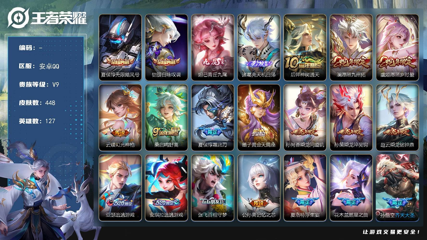 【游戏多多】 【可包人脸】安卓Q V9 永恒钻石III段位 127英雄 448皮肤 2典藏 0珍品无双 2无双 0珍品传说 45传说 140史诗大区:安卓Q,营地:410219134,贵族等级:9,【热门皮肤】:,【限定皮肤】:莱西奥光弋星穹,明世隐往忆晖光,兰陵王傩神司,少司缘巫礼祀神,夏侯惇霜北刀,嬴政优雅恋人,后羿神树通天,艾琳鹤鸣心笺,女娲万灵启世,孙权径山谋武,张良罗小黑战记,亚瑟荣光之誓,哪吒罗小黑战记,桑启青衿临川,镜青焰无极,孙策百相守梦,周瑜百相守梦,王昭君幻想奇妙夜,芈月白晶晶,公孙离涂山容容,西施织梦人,鬼谷子克喵,莱西奥踏浪烽翎,高渐离落日弦歌,甄姬逆浪荇歌,云中君云械蓝图,云缨赞萌露比,庄周锦麟游梦,空空儿戏梦巡演,白起死霸装,后羿石田雨龙,干将莫邪雾都夜雨,米莱狄怪诞之夜,大乔猫狗日记,桑启鸣野蒿,东皇太一噬灭天穹,李白谪仙醉月,小乔丁香结,廉颇撼地雄心,孙悟空神迹守卫,亚连破空之剑,鲁班七号黑桃队长,盘古敬我三分,亚瑟心灵战警,大乔绒语心约,姜子牙天穹之誓,周瑜熔金海岸,杨戬破阵·退雄兵,貂蝉长夏之忆,刘备异域游侠,曜云鹰飞将,大司命暗都幽影,程咬金群星魔术团,赵云白执事,墨子黄金天蝎座,刘备潮玩造梦师,刘邦剑破天穹,盘古经纬探寻者,鲁班七号蔬乡物语,钟无艳春野之旅,沈梦溪龙舞盛年,李元芳蔬乡物语,廉颇功夫炙烤,安琪拉乘龙·聚宝船,大乔乘龙·忆丹青,孙策乘龙·淬吴钩,孙尚香乘龙·问璇玑,赵云乘龙·铭钟鼎,嫦娥漠中幻影,鬼谷子天穹祈灯,程咬金暖冬絮语,张良古海寻踪,高渐离玩趣恶龙,阿古朵江河有灵,戈娅驭风魔法,西施玲珑珍味,哪吒热血海滩,李元芳妄想特派,鲁班大师探海日志,李白敏锐之力【荣耀典藏】:夏侯惇无限飓风号,铠银白咏叹调【截图或标题展示段位不代表实际段位,赛季更新等不可抗拒因素发生变化、时限道具不保证所剩时间,详情请看截图哦~】