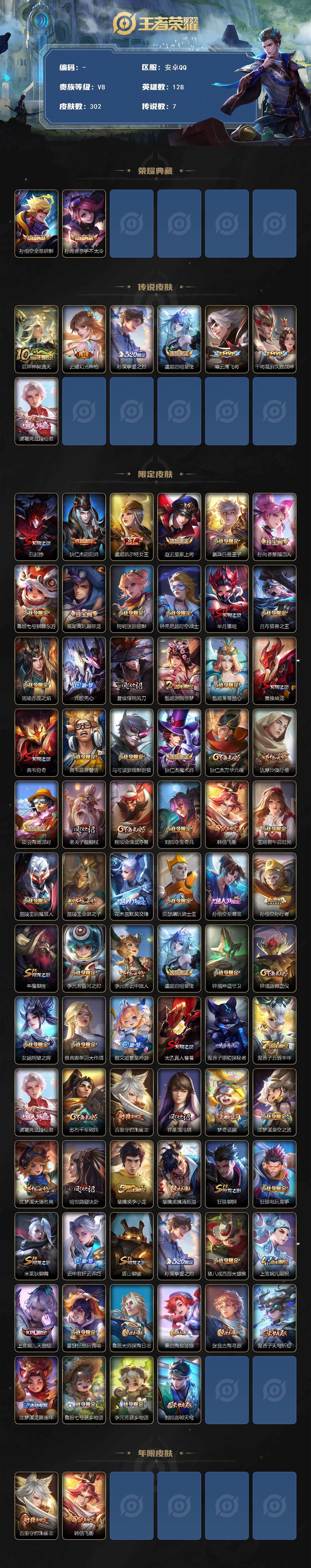 【游戏多多】 【可包人脸】安卓Q V8 至尊星耀III段位 128英雄 302皮肤 2典藏 0珍品无双 0无双 0珍品传说 7传说 71史诗大区:安卓Q,营地:236861278,贵族等级:8,【热门皮肤】:,【限定皮肤】:妲己线条小狗,孙权径山谋武,梦奇顽趣,虞姬溯影追猎,周瑜线条小狗,典韦黄金武士,亚瑟荣光之誓,赵云白执事,后羿神树通天,艾琳鹤鸣心笺,张良罗小黑战记,李白敏锐之力,哪吒罗小黑战记,小乔丁香结,赵云忍·炎影,莱西奥踏浪烽翎,盘古重装意志,庄周锦麟游梦,甄姬逆浪荇歌,空空儿戏梦巡演,孙策百相守梦,周瑜百相守梦,狂铁龙之律动,海诺时空谍影,牛魔西部大镖客,刘禅鸭鸭历险记,沈梦溪鸭鸭历险记,白起死霸装,后羿石田雨龙,刘邦剑破天穹,盘古经纬探寻者,鲁班七号蔬乡物语,张良缤纷绘卷,李元芳蔬乡物语,扁鹊无尽旅途,钟无艳春野之旅,沈梦溪龙舞盛年,鬼谷子天穹祈灯,廉颇功夫炙烤,张良古海寻踪,李元芳妄想特派,高渐离玩趣恶龙,鲁班大师探海日志,姬小满零食大作战,裴擒虎擒涛扼浪,赵怀真太极少年,猪八戒潮玩探月行,海月幻泉雾影,桑启海盐诗旅,元歌无心,钟无艳超时空战士,甄姬落雪兰心,孙悟空孙行者,鬼谷子五谷丰年,刘备潮玩造梦师,李元芳云中旅人,戈娅危途狂花,吕布圣诞狂欢,狂铁电玩高手,宫本武藏未来纪元,安琪拉玩偶对对碰,王昭君午后时光,蒙恬蔚蓝守将,蒙犽胡桃狂想曲,沈梦溪大漠名商,狂铁特工战影,孙策挚爱之约,米莱狄契约魔法,刘禅唤灵魔甲,诸葛亮武陵仙君,孙尚香蔷薇恋人,兰陵王金庭之子,吕布野性能量,程咬金无双福将,刘邦虎啸剑宗,达摩沙漠行僧,芈月红桃皇后,苏烈千军破阵,达摩大发明家,钟馗驱傩正仪【荣耀典藏】:孙悟空全息碎影,孙尚香杀手不太冷【截图或标题展示段位不代表实际段位,赛季更新等不可抗拒因素发生变化、时限道具不保证所剩时间,详情请看截图哦~】