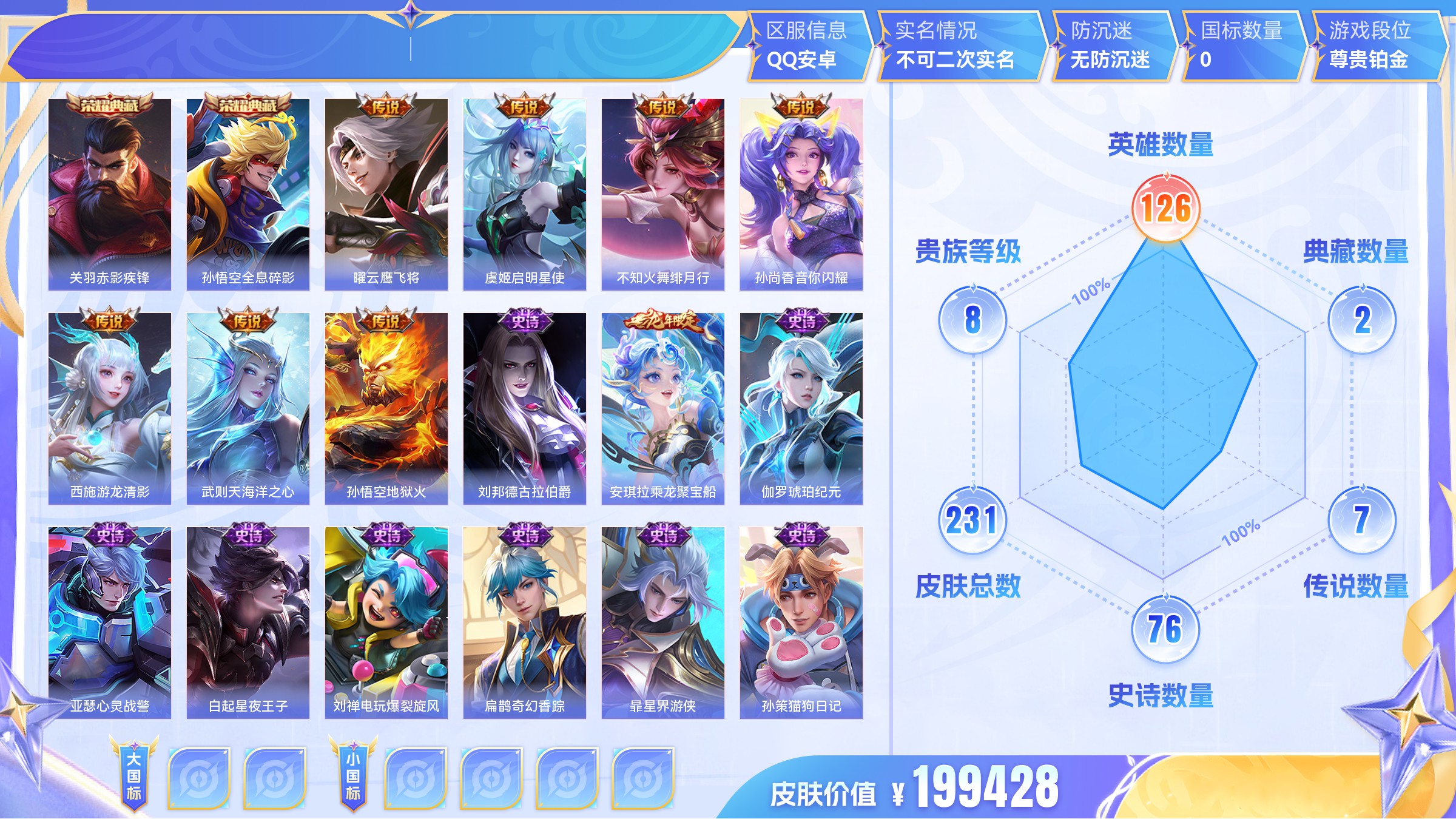 【游戏多多】 【可二次实名】ljh【找回包赔】ak009408 安卓q 营地id217413486 【v7】 【 121英雄 223皮肤】 【典藏1 传说7 史诗71 限定86 星传说1】 【荣耀典藏 关羽 -赤影疾锋】 【星传说 未来机甲】 【传说皮肤 女娲 -补天 桑启 -鸣野蒿 貂蝉 -遇见胡旋 孙尚香 -末日机甲 干将莫邪 -久胜战神 女娲 -愿照·千秋盛 后羿 -黄金射手座】 【史诗 史诗皮肤 吕布 -圣诞狂欢 橘右京 -修罗 甄姬 -冰雪圆舞曲 项羽 -苍穹之光 百里守约 -特工魅影 赵云 -未来纪元 宫本武藏 -鬼剑武藏 鲁班七号 -电玩小子 墨子 -金属风暴 廉颇 -地狱岩魂 妲己 -魅力维加斯 小乔 -青蛇 曹操 -幽灵船长 夏侯惇 -乘风破浪 孙尚香 -蔷薇恋人 元歌 -无心 妲己 -女仆咖啡 不知火舞 -魅语 王昭君 -偶像歌手 貂蝉 -圣诞恋歌 诸葛亮 -黄金分割率 安琪拉 -心灵骇客 李元芳 -逐浪之夏 嬴政 -优雅恋人 亚瑟 -心灵战警 孙尚香 -水果甜心 伽罗 -箭羽风息 孙策 -猫狗日记 刘禅 -天才门将 小乔 -缤纷独角兽 李白 -千年之狐 白起 -星夜王子 刘禅 -电玩·爆裂旋风 蒙犽 -百解令 妲己 -灵卜魔法 高渐离 -燃音魔法 蒙恬 -荣光圣徽】 ----更多炫彩背包/光效/名片/武器具体看图!截图展示段位不代实际段位,赛季更新等不可抗拒因素发生变化、时限道具不保证所剩时间、标题未写送点卷默认不送】【主播担保+安全至上+性价比 买号卖号只选金牌商家一左友】