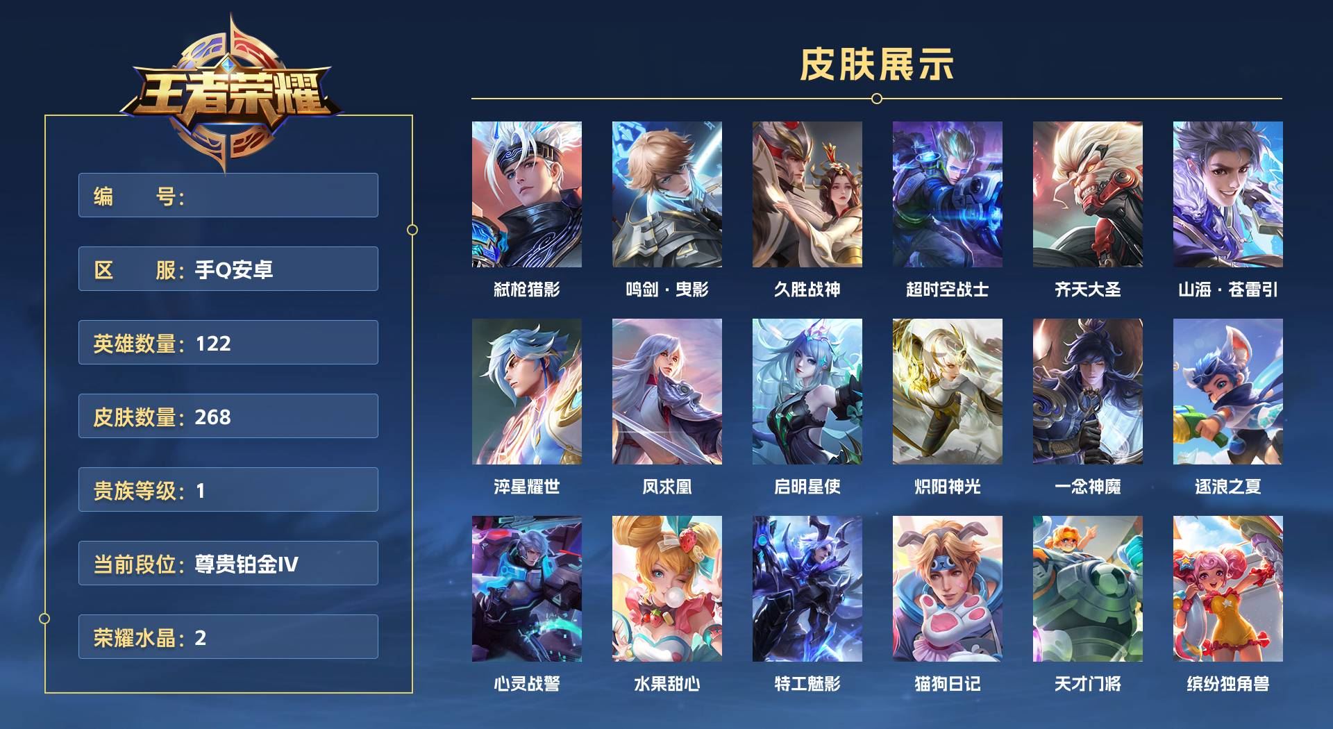 【游戏多多】 【可二次实名】手Q安卓 122英雄 268皮肤 贵族等级1 已兑换荣耀水晶数2 弑枪猎影 鸣剑·曳影 久胜战神 超时空战士 齐天大圣 山海·苍雷引 淬星耀世 凤求凰 启明星使 炽阳神光 一念神魔 逐浪之夏 心灵战警 水果甜心 特工魅影 猫狗日记 天才门将 缤纷独角兽 冰冠公主 玩趣恶龙 千年之狐 紫霞仙子 星夜王子 江河有灵 冰雪圆舞曲 圣诞狂欢 末日机甲 暗隐猎兽者 赏金猎手 苍穹之光 暗渊魔法 白龙吟 幽灵船长 龙骑士 修罗 未来纪元 无心 晚萤 女仆咖啡 鬼剑武藏 魅语 金属风暴 德古拉伯爵 地狱岩魂 偶像歌手 摇滚巨星 圣诞恋歌 霸王丸 飞衡 阴阳师 魔术师 白昼王子 暖冬·兔眠 云间偶戏 蓝屏警告 华丽摇滚 单词大作战 胡桃异想国 火炮千金 暗影游猎 华尔街大亨 银河之约 水晶猎龙者 游园惊梦 遇见飞天 神迹守卫 圣弓游侠 乓乓大师 海滩派对 梁祝 赤莲之焰 迷踪丽影 潮玩骑士王 纤云弄巧 李小龙 皇家上将 繁星吟游 真爱魔法 狮舞东方 驯魔猎人 猎兽之王 朔望之晖 神迹守卫 火炮绅士 西部大镖客 时之祈愿 黎明之约 航海奇遇记 夺宝奇兵 高山流水 沉稳之力 星际陆战队 死亡摇滚 星界游侠 幻夜卜梦 星空之诺 狂想玩偶喵 玲珑珍味 驭风魔法 死亡骑士 白色死神 爱心护理 忍·炎影 潮玩探月行 化身博士 牛运亨通 幽兰居士 紫罗兰之誓 丁香结 大发明家 守护之力 海滩丽影 如懿 白执事 女武神 黑桃队长 红桃皇后 瓷语鉴心 破局者 妄想特派 零食大作战 无双福将 坚韧之力 阿尔法小队 无尽征程 教廷特使 特工战影 敏锐之力 兔女郎 缤纷绘卷 掌控之力 纽约教父 爱与正义 秘密基地 未来纪元 虹云星官 次元傲视 功夫老勺 次元突破 西部大镖客 炽热元素使 玩偶对对碰 嘻哈天王 黄金武士 万象初新 圆桌骑士 哥特玫瑰 少女阿狸 乐园追猎者 拳王 街头霸王 归虚梦演 胡桃夹子 野性能量 幻乐之宴 科学大爆炸 龙腾万里 万事如意 鲨炮海盗猫 汉昭烈帝 制霸全明星 唤灵魔甲 花好人间 五福同心 天穹祈灯 沙漠行僧 古海寻踪 御狮 朔风刀 探海日志 无畏之灵·狰 混沌棋 万华元夜 顽趣 疑决卦 原初追逐者 驱傩正仪 谧流熔炉 金庭之子 醍醐杖 御銮 御霄 重明 御旌 云中旅人 凯尔特女王 原初探秘者 穷奇 千军破阵 海盐诗旅 烛龙 擒涛扼浪 大漠名商 演武夺筹