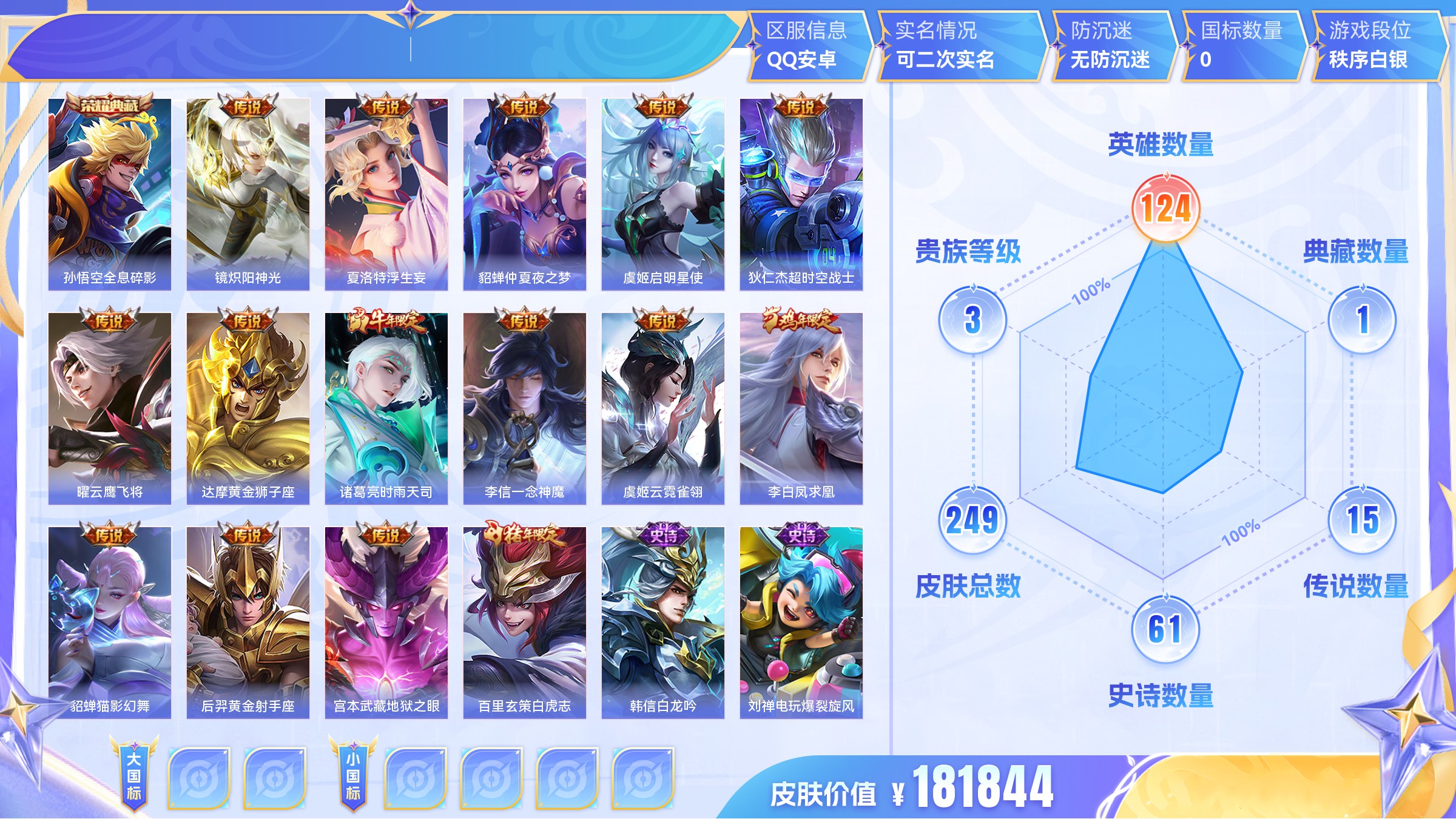 【游戏多多】 【可二次实名】【wz2274】安卓Q-V0-秩序白银I段位-121英雄-133皮肤-0典藏-0珍品无双-0无双-0珍品传说-2传说-31史诗 【传说皮肤】:桑启鸣野蒿,西施游龙清影 【限定皮肤】:姜子牙天穹之誓,狄仁杰阴阳师,赵云皇家上将,孙尚香蔷薇恋人,庄周高山流水,夏侯惇朔风刀,狄仁杰万华元夜,达摩沙漠行僧,项羽海滩派对,老夫子醍醐杖,兰陵王金庭之子,亚瑟潮玩骑士王,李元芳云中旅人,蔡文姬繁星吟游,鬼谷子原初探秘者,鬼谷子五谷丰年,弈星混沌棋,沈梦溪大漠名商,裴擒虎李小龙,裴擒虎擒涛扼浪,上官婉儿梁祝,鲁班大师探海日志,桑启海盐诗旅,阿古朵江河有灵,张良古海寻踪,鬼谷子天穹祈灯,沈梦溪龙舞盛年,刘邦剑破天穹,程咬金群星魔术团,周瑜熔金海岸 【赛季限定】:夏侯惇朔风刀,狄仁杰万华元夜,达摩沙漠行僧,老夫子醍醐杖,兰陵王金庭之子,张良古海寻踪,李元芳云中旅人,鬼谷子原初探秘者,弈星混沌棋,沈梦溪大漠名商,裴擒虎擒涛扼浪,鲁班大师探海日志,桑启海盐诗旅,鬼谷子天穹祈灯,刘邦剑破天穹,姜子牙天穹之誓 【战令限定】:亚瑟潮玩骑士王 【史诗皮肤】:赵云皇家上将,貂蝉圣诞恋歌,甄姬冰雪圆舞曲,宫本武藏鬼剑武藏,孙尚香蔷薇恋人,孙尚香水果甜心,嬴政摇滚巨星,妲己魅力维加斯,墨子金属风暴,曹操幽灵船长,张飞乱世虎臣,夏侯惇乘风破浪,小乔缤纷独角兽,兰陵王暗隐猎兽者,安琪拉心灵骇客,百里守约特工魅影,铠曙光守护者,白起星夜王子,阿轲节奏热浪,孙策猫狗日记,伽罗箭羽风息,狄仁杰鹰眼统帅,上官婉儿梁祝,蔡文姬繁星吟游,裴擒虎李小龙,庄周高山流水,鬼谷子五谷丰年,刘禅电玩爆裂旋风,阿古朵江河有灵,亚连破空之剑,马可波罗星界特工 【其他皮肤】:项羽海滩派对,韩信教廷特使,韩信街头霸王,达摩大发明家,赵云白执事,赵云忍炎影,白起白色死神,扁鹊化身博士,安琪拉玩偶对对碰,妲己少女阿狸,典韦黄金武士,达摩拳王,花木兰兔女郎,甄姬花好人间,刘备万事如意,宫本武藏万象初新,狄仁杰阴阳师,刘备汉昭烈帝,关羽龙腾万里,墨子进击墨子号,钟无艳海滩丽影,老夫子功夫老勺,孙尚香沉稳之力,诸葛亮掌控之力,李白敏锐之力,鬼谷子幻乐之宴,大乔守护之力,明世隐虹云星官,小乔丁香结,吕布野性能量,孙膑归虚梦演,沈梦溪鲨炮海盗猫,夏侯惇朔风刀,弈星混沌棋,哪吒次元突破,老夫子醍醐杖,狂铁特工战影,鬼谷子原初探秘者,狄仁杰万华元夜,亚瑟潮玩骑士王,刘禅秘密基地,杨戬次元傲视,鲁班大师乓乓大师,达摩沙漠行僧,程咬金无双福将,兰陵王金庭之子,沈梦溪大漠名商,蒙恬蔚蓝守将,李元芳云中旅人,桑启海盐诗旅,猪八戒潮玩探月行,裴擒虎擒涛扼浪,太乙真人劲辣红锅,鲁班大师探海日志,李元芳妄想特派,张良古海寻踪,钟无艳聚星闪耀,鬼谷子天穹祈灯,廉颇功夫炙烤,沈梦溪龙舞盛年,刘邦剑破天穹,程咬金群星魔术团,姜子牙天穹之誓,周瑜熔金海岸,孙悟空神迹守卫,盘古敬我三分,老夫子百相守梦,吕布逐霄战戟,鲁班七号福禄兄弟,鲁班七号木偶奇遇记,貂蝉异域舞娘,狄仁杰锦衣卫,孙膑未来旅行,孙悟空西部大镖客,兰陵王隐刃,钟馗地府判官,李元芳特种部队,虞姬加勒比小姐,马可波罗激情绿茵,杨戬埃及法老,哪吒三太子,大乔伊势巫女,铠龙域领主,百里守约绝影神枪,明世隐占星师,裴擒虎街头旋风,弈星踏雪寻梅,米莱狄精准探案法,元歌午夜歌剧院,司马懿魇语军师,李信灼热之刃,上官婉儿修竹墨客,嫦娥露花倒影,瑶森,曜归虚梦演,马超幸存者,鲁班大师归虚梦演,蒙犽归虚梦演,暃碧珀绯影,桑启画中游 【内测皮肤】:孙尚香蔷薇恋人,狂铁特工战影 【营地ID】:1749596475