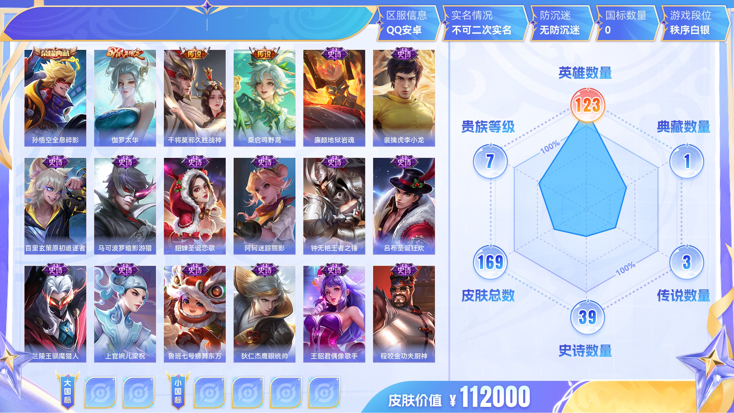 【游戏多多】 【可二次实名】【wz1025】【商品标题】:安卓Q-V0-秩序白银II段位-102英雄-81皮肤-0典藏-0珍品无双-0无双-0珍品传说-4传说-13史诗 【传说皮肤】:诸葛亮武陵仙君,孙尚香末日机甲,宫本武藏地狱之眼,孙悟空地狱火 【限定皮肤】:狄仁杰阴阳师,赵云皇家上将,鲁班七号狮舞东方,芈月重明,夏侯惇朔风刀,曹操烛龙,典韦穷奇,狄仁杰魔术师,狄仁杰万华元夜,达摩沙漠行僧,项羽海滩派对,老夫子醍醐杖,兰陵王金庭之子,孙悟空美猴王,钟馗神迹守卫,钟馗驱傩正仪,蔡文姬繁星吟游,鬼谷子原初探秘者,诸葛亮武陵仙君,弈星混沌棋,明世隐疑决卦,裴擒虎李小龙,狂铁御狮,上官婉儿梁祝,鲁班大师探海日志,桑启海盐诗旅 【年限皮肤】:孙悟空美猴王 【赛季限定】:芈月重明,夏侯惇朔风刀,曹操烛龙,典韦穷奇,狄仁杰万华元夜,达摩沙漠行僧,老夫子醍醐杖,兰陵王金庭之子,钟馗驱傩正仪,鬼谷子原初探秘者,弈星混沌棋,明世隐疑决卦,狂铁御狮,鲁班大师探海日志,桑启海盐诗旅 【战令限定】:鲁班七号狮舞东方,钟馗神迹守卫 【史诗皮肤】:赵云皇家上将,王昭君偶像歌手,狄仁杰魔术师,吕布圣诞狂欢,韩信白龙吟,兰陵王暗隐猎兽者,诸葛亮黄金分割率,百里守约特工魅影,鲁班七号狮舞东方,狄仁杰鹰眼统帅,上官婉儿梁祝,蔡文姬繁星吟游,裴擒虎李小龙 【其他皮肤】:项羽海滩派对,韩信教廷特使,韩信街头霸王,露娜哥特玫瑰,芈月红桃皇后,白起白色死神,扁鹊化身博士,安琪拉玩偶对对碰,妲己少女阿狸,典韦黄金武士,亚瑟死亡骑士,达摩拳王,孙悟空美猴王,花木兰兔女郎,宫本武藏万象初新,狄仁杰阴阳师,刘备汉昭烈帝,关羽龙腾万里,钟无艳海滩丽影,宫本武藏霸王丸,曹操烛龙,王昭君幻想奇妙夜,芈月重明,老夫子功夫老勺,典韦穷奇,狂铁御狮,项羽科学大爆炸,明世隐虹云星官,钟馗神迹守卫,沈梦溪鲨炮海盗猫,夏侯惇朔风刀,弈星混沌棋,明世隐疑决卦,老夫子醍醐杖,鬼谷子原初探秘者,狄仁杰万华元夜,钟馗驱傩正仪,达摩沙漠行僧,兰陵王金庭之子,桑启海盐诗旅,鲁班大师探海日志,鲁班七号木偶奇遇记,花木兰剑舞者,程咬金华尔街大亨,曹操超能战警,孙悟空西部大镖客,钟馗地府判官,夏侯惇战争骑士,雅典娜战争女神,马可波罗激情绿茵,苍维京掠夺者,哪吒三太子,干将莫邪第七人偶,铠龙域领主,百里守约绝影神枪,百里玄策威尼斯狂欢,公孙离花间舞,裴擒虎街头旋风,元歌午夜歌剧院,孙策海之征途,伽罗花见巫女,李信灼热之刃,曜归虚梦演 【营地ID】:424341554