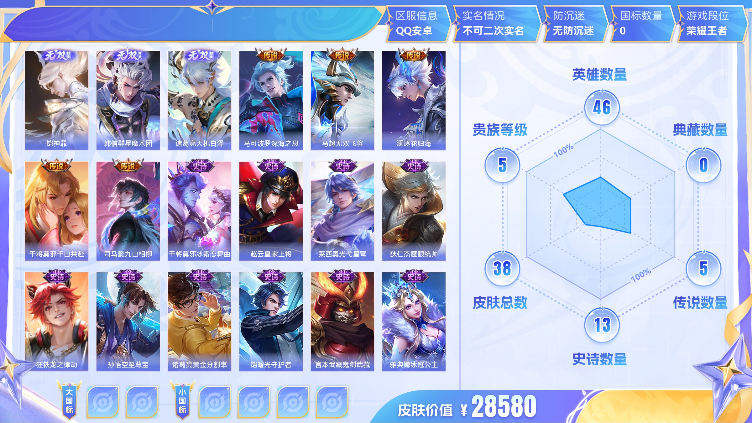【游戏多多】 【67l4i1eda】 无双3 传说5 史诗13 限定20 英雄46 皮肤38 稀有英雄2 贵族5级 总场次637 皮肤价值:28580 【无双皮肤3】 铠神罪 韩信群星魔术团 诸葛亮天机白泽【传说皮肤5】 马可波罗深海之息 马超无双飞将 澜逐花归海 干将莫邪千山共赴 司马懿九山相柳【史诗皮肤13】 干将莫邪冰霜恋舞曲 赵云皇家上将 莱西奥光弋星穹 狄仁杰鹰眼统帅 狂铁龙之律动 孙悟空至尊宝 诸葛亮黄金分割率 铠曙光守护者 宫本武藏鬼剑武藏 雅典娜冰冠公主 周瑜百相守梦 黄忠百相守梦 妲己魅力维加斯【限定皮肤20】 马可波罗深海之息 干将莫邪冰霜恋舞曲 赵云皇家上将 张良罗小黑战记 亚瑟荣光之誓 铠神罪 明世隐往忆晖光 莱西奥光弋星穹 狂铁龙之律动 哪吒罗小黑战记 孙悟空至尊宝 干将莫邪千山共赴 项羽海滩派对 鬼谷子克喵 孙策百相守梦 周瑜百相守梦 司马懿九山相柳 狄仁杰阴阳师 甄姬逆浪荇歌 诸葛亮天机白泽【其他8】 关羽龙腾万里 马可波罗激情绿茵 典韦黄金武士 曜归虚梦演 莱西奥踏浪烽翎 赵云忍炎影 司马懿魇语军师 亚瑟死亡骑士【稀有英雄2】 _韩信 _橘右京【手q524区】【不可二次实名】【qq安卓】【荣耀王者】【国标拥有情况为卖家自主勾选,详情以真实验号为准】