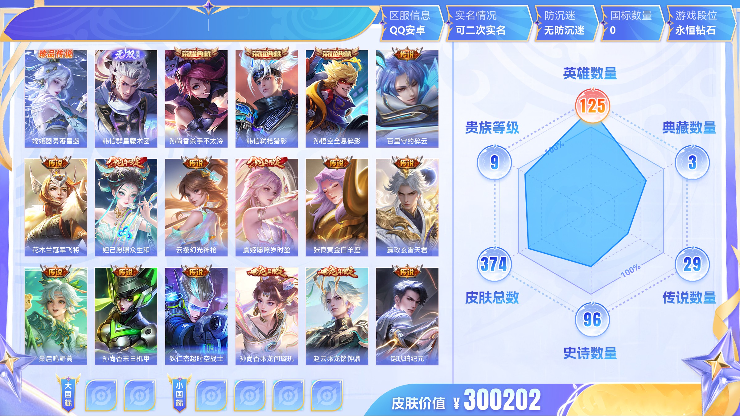【游戏多多】 【可二次实名】【69sjvdh1b】 珍品传说1 无双1 典藏3 传说29 史诗96 限定126 英雄125 皮肤374 稀有英雄10 贵族9级 总场次9039 皮肤价值:300202 【珍品传说1】 嫦娥器灵落星盏【无双皮肤1】 韩信群星魔术团【荣耀典藏3】 孙尚香杀手不太冷 韩信弑呛猎影 孙悟空全息碎影【传说皮肤29】 百里守约碎云 花木兰冠军飞将 妲己愿照众生和 云缨幻光神呛 虞姬愿照岁时盈 张良黄金白羊座 嬴政玄雷天君 桑启鸣野蒿 孙尚香末日机甲 狄仁杰超时空战士 孙尚香乘龙问璇玑 赵云乘龙铭钟鼎 铠琥珀纪元 澜逐花归海 吕布遇见神鼓 宫本武藏惊梅引 诸葛亮鹤羽星尊 赵云淬星耀世 虞姬启明星使 后羿黄金射手座 曜山海苍雷引 孙悟空齐天大圣 李信山海炽霜斩 孙悟空地狱火 李信一念神魔 干将莫邪久胜战神 铠绛天战甲 孙悟空零号赤焰 关羽武圣【史诗皮肤96】 吕布末日机甲 公孙离涂山容容 梦奇顽趣 扁鹊灵蛊蚀心 蔡文姬舞动绿茵 黄忠百相守梦 周瑜百相守梦 张飞乱世虎臣 花木兰水晶猎龙者 小乔青蛇 狂铁龙之律动 刘禅鸭鸭历险记 貂蝉圣诞恋歌 赵怀真器灵浮梦炉 廉颇地狱岩魂 钟馗乐园奇幻夜 孙膑茶境仙 白起苍鳞隐世 刘禅绅士熊喵 牛魔星界战将 白起星夜王子 伽罗箭羽风息 百里守约百相守梦 甄姬游园惊梦 露娜紫霞仙子 亚瑟心灵战警 刘邦德古拉伯爵 李元芳银河之约 廉颇撼地雄心 亚连破空之剑 百里玄策原初追逐者 孙策猫狗日记 蒙犽顽岩魄 蔡文姬夏日便利店 嬴政优雅恋人 铠曙光守护者 杨戬天秀启明 黄忠怒海争锋 镜青焰无极 马超神威 妲己女仆咖啡 吕布圣诞狂欢 典韦蓝屏警告 鲁班七号蔬乡物语 伽罗琥珀纪元 高渐离燃音魔法 夏侯惇乘风破浪 蒙恬荣光圣徽 安琪拉心灵骇客 阿古朵江河有灵 司空震地狱燃心 嬴政摇滚巨星 甄姬冰雪圆舞曲 李元芳匿光侦查者 李白千年之狐 雅典娜黎明之约 戈娅驭风魔法 刘禅电玩爆裂旋风 孙悟空至尊宝 扁鹊奇幻香踪 刘禅天才门将 夏洛特永昼 澜赏金猎手 赵云龙胆 宫本武藏鬼剑武藏 赵云未来纪元 鲁班七号电玩小子 暃星界游侠 阿轲节奏热浪 李元芳逐浪之夏 曹操幽灵船长 老夫子航海奇遇记 韩信逐梦之影 小乔缤纷独角兽 米莱狄胡桃异想国 墨子金属风暴 元歌云间偶戏 孙尚香水果甜心 干将莫邪冰霜恋舞曲 芈月白晶晶 狄仁杰魔术师 孙尚香时之恋人 云中君纤云弄巧 蒙犽狂想玩偶喵 孙悟空大圣娶亲 裴擒虎李小龙 橘右京修罗 马可波罗暗影游猎 蔡文姬繁星吟游 赵云皇家上将 狄仁杰鹰眼统帅 兰陵王暗隐猎兽者 韩信飞衡 上官婉儿梁祝 王昭君偶像歌手 妲己魅力维加斯【年限皮肤7】 妲己愿照众生和 虞姬愿照岁时盈 孙尚香乘龙问璇玑 赵云乘龙铭钟鼎 曜山海苍雷引 李信山海炽霜斩 韩信飞衡【内测皮肤2】 嬴政优雅恋人 高渐离玩趣恶龙【限定皮肤126】 亚瑟荣光之誓 张良罗小黑战记 公孙离涂山容容 梦奇顽趣 鬼谷子克喵 甄姬逆浪荇歌 孙策百相守梦 周瑜百相守梦 白起死霸装 姬小满小满鸭 阿古朵布丁狗之约 苏烈春野闲踪 狂铁龙之律动 沈梦溪鸭鸭历险记 刘禅鸭鸭历险记 钟馗虚灵犬护 赵怀真器灵浮梦炉 嫦娥器灵落星盏 妲己愿照众生和 虞姬愿照岁时盈 孙膑茶境仙 马超访茗客 西施雪境奇遇 太乙真人谧流熔炉 嬴政玄雷天君 牛魔星界战将 老夫子百相守梦 百里守约百相守梦 甄姬游园惊梦 桑启鸣野蒿 东皇太一噬灭天穹 李元芳银河之约 廉颇撼地雄心 亚连破空之剑 盘古敬我三分 百里玄策原初追逐者 孙悟空神迹守卫 蒙犽顽岩魄 蔡文姬夏日便利店 嬴政优雅恋人 姜子牙天穹之誓 虞姬夏日便利店 周瑜熔金海岸 镜青焰无极 项羽苍威无极 马超神威 典韦蓝屏警告 刘邦剑破天穹 鲁班七号蔬乡物语 李元芳蔬乡物语 沈梦溪龙舞盛年 孙尚香乘龙问璇玑 赵云乘龙铭钟鼎 伽罗琥珀纪元 铠琥珀纪元 高渐离燃音魔法 嫦娥漠中幻影 妲己灵卜魔法 鬼谷子天穹祈灯 蒙恬荣光圣徽 阿古朵江河有灵 司空震地狱燃心 吕布遇见神鼓 李元芳匿光侦查者 艾琳流音漫舞 张良古海寻踪 王昭君午后时光 雅典娜黎明之约 戈娅驭风魔法 西施玲珑珍味 鲁班大师探海日志 诸葛亮鹤羽星尊 孙悟空至尊宝 扁鹊奇幻香踪 杨戬潮玩骑兵 裴擒虎擒涛扼浪 虞姬启明星使 赵云龙胆 暃星界游侠 嫦娥暖冬兔眠 曜山海苍雷引 孙悟空齐天大圣 李信山海炽霜斩 高渐离玩趣恶龙 桑启海盐诗旅 李元芳云中旅人 兰陵王金庭之子 达摩沙漠行僧 老夫子航海奇遇记 墨子神迹守卫 韩信逐梦之影 钟馗驱傩正仪 米莱狄胡桃异想国 达摩星际陆战队 程咬金演武夺筹 元歌云间偶戏 亚瑟潮玩骑士王 干将莫邪冰霜恋舞曲 芈月白晶晶 狄仁杰万华元夜 狄仁杰魔术师 孙悟空零号赤焰 云中君纤云弄巧 蒙犽狂想玩偶喵 雅典娜单词大作战 孙悟空大圣娶亲 裴擒虎李小龙 关羽武圣 鬼谷子原初探秘者 马可波罗暗影游猎 蔡文姬繁星吟游 猪八戒西部大镖客 老夫子醍醐杖 赵云皇家上将 韩信飞衡 弈星混沌棋 上官婉儿梁祝 夏侯惇朔风刀 盾山御銮 狄仁杰阴阳师 项羽海滩派对 牛魔御旌 米莱狄御霄 狂铁御狮 典韦穷奇 曹操烛龙【其他183】 盘古重装意志 莱西奥踏浪烽翎 云中君云械蓝图 庄周锦麟游梦 露娜命运加冕 雅典娜潮玩士官长 赵怀真太极少年 戈娅危途狂花 张良灵野札记 李白敏锐之力 刘备浪漫序章 戈娅玫蓝誓约 明世隐景韶洛都 姬小满零食大作