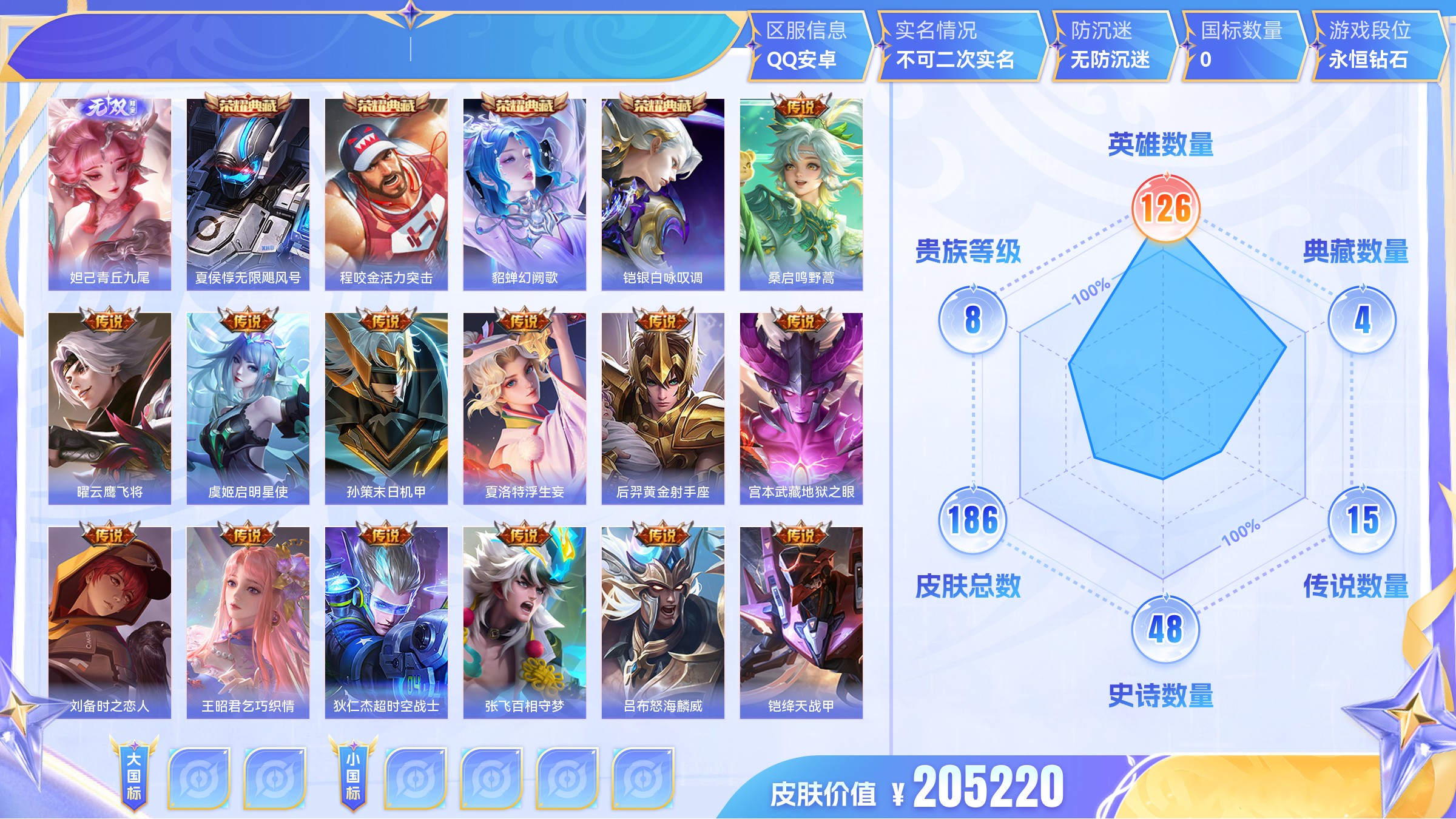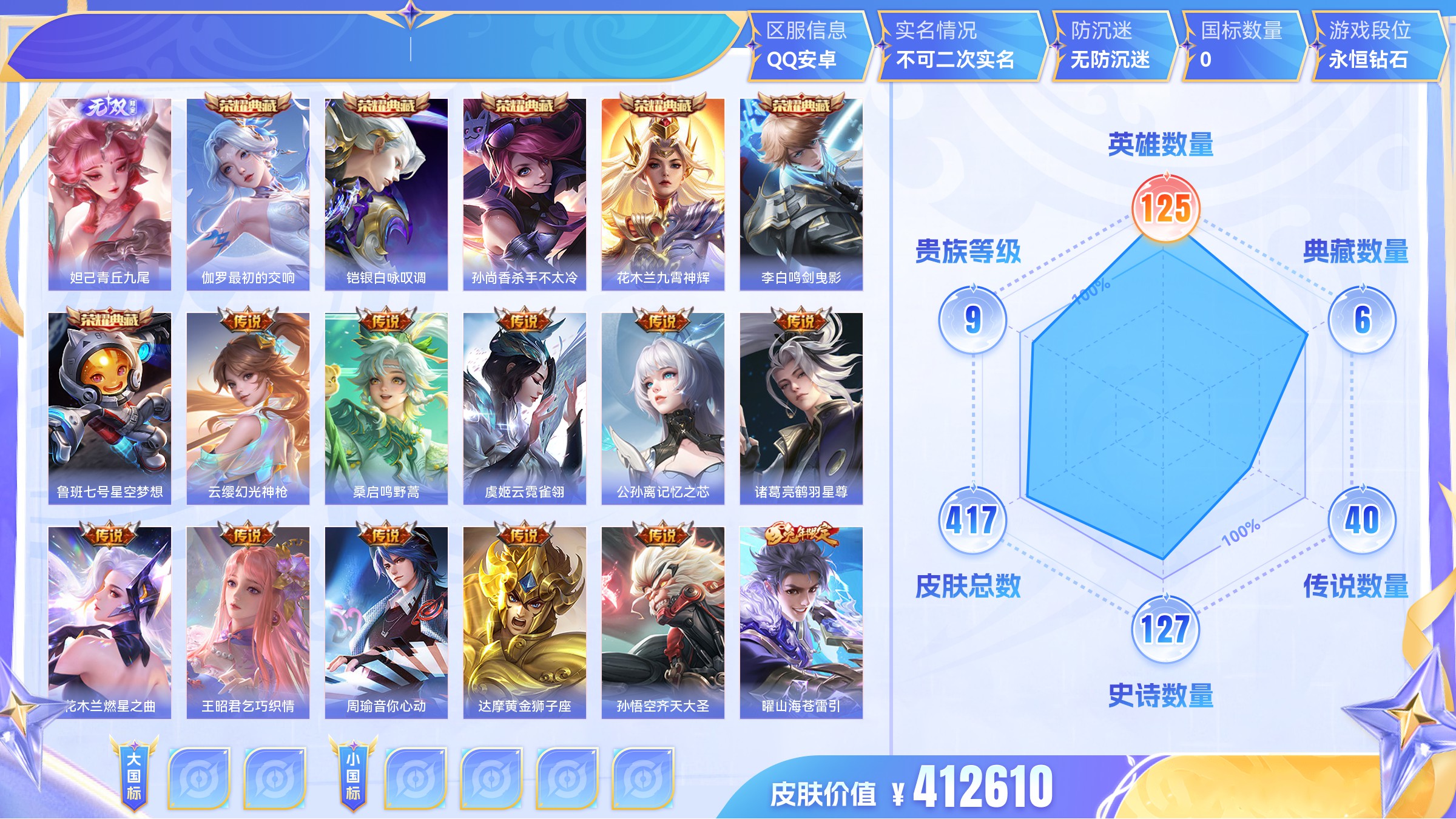 【游戏多多】 【67l4iegdg】 无双1 典藏4 传说15 史诗48 限定41 英雄126 皮肤186 稀有英雄9 贵族8级 总场次2708 皮肤价值:205220 【无双皮肤1】 妲己青丘九尾【荣耀典藏4】 夏侯惇无限飓风号 程咬金活力突击 貂蝉幻阙歌 铠银白咏叹调【传说皮肤15】 桑启鸣野蒿 曜云鹰飞将 虞姬启明星使 孙策末日机甲 夏洛特浮生妄 后羿黄金射手座 宫本武藏地狱之眼 刘备时之恋人 王昭君乞巧织情 狄仁杰超时空战士 张飞百相守梦 吕布怒海麟威 铠绛天战甲 孙悟空地狱火 李信一念神魔【史诗皮肤48】 西施织梦人 黄忠百相守梦 白起星夜王子 刘禅天才门将 百里守约特工魅影 狄仁杰鹰眼统帅 小乔青蛇 甄姬冰雪圆舞曲 狂铁龙之律动 老夫子藏狐褐绒 刘禅鸭鸭历险记 阿轲节奏热浪 兰陵王暗隐猎兽者 张飞乱世虎臣 妲己女仆咖啡 亚瑟心灵战警 娜可露露晚萤 廉颇地狱岩魂 嬴政摇滚巨星 夏侯惇乘风破浪 墨子龙骑士 鲁班七号电玩小子 宫本武藏鬼剑武藏 赵云未来纪元 王昭君偶像歌手 司马懿暗渊魔法 沈梦溪匿光破解者 韩信白龙吟 貂蝉圣诞恋歌 澜赏金猎手 墨子金属风暴 铠曙光守护者 扁鹊奇幻香踪 阿轲暗夜猫娘 铠青龙志 伽罗箭羽风息 苏烈玄武志 孙悟空至尊宝 高渐离天秀音浪 关羽百相守梦 刘备百相守梦 狄仁杰魔术师 貂蝉唤灵魅影 赵云皇家上将 露娜紫霞仙子 孙尚香水果甜心 孙策猫狗日记 妲己魅力维加斯【年限皮肤2】 铠青龙志 苏烈玄武志【限定皮肤41】 西施织梦人 鬼谷子克喵 白起死霸装 姬小满小满鸭 钟馗虚灵犬护 阿古朵布丁狗之约 狂铁龙之律动 老夫子藏狐褐绒 刘禅鸭鸭历险记 沈梦溪鸭鸭历险记 太乙真人谧流熔炉 桑启鸣野蒿 东皇太一噬灭天穹 沈梦溪龙舞盛年 姜子牙天穹之誓 盘古敬我三分 刘邦剑破天穹 鬼谷子天穹祈灯 张良古海寻踪 沈梦溪匿光破解者 妲己青丘九尾 虞姬启明星使 扁鹊奇幻香踪 夏洛特浮生妄 铠青龙志 苏烈玄武志 孙悟空至尊宝 杨戬潮玩骑兵 狄仁杰阴阳师 关羽百相守梦 张飞百相守梦 刘备百相守梦 狄仁杰魔术师 赵云皇家上将 项羽海滩派对 裴擒虎擒涛扼浪 桑启海盐诗旅 李元芳云中旅人 沈梦溪大漠名商 兰陵王金庭之子 甄姬逆浪荇歌【其他96】 影魅影绮裳 张飞五福同心 莱西奥踏浪烽翎 妲己少女阿狸 公孙离花间舞 李白敏锐之力 马可波罗潮玩牛仔 露娜命运加冕 露娜哥特玫瑰 廉颇功夫炙烤 甄姬花好人间 刘禅英喵野望 张良灵野札记 赵云白执事 刘备浪漫序章 芈月红桃皇后 亚连破局者 鲁班七号福禄兄弟 白起白色死神 后羿阿尔法小队 武则天东方不败 苏烈爱与和平 小乔丁香结 鲁班大师乓乓大师 大司命暗都幽影 狂铁特工战影 安琪拉玩偶对对碰 桑启画中游 赵云忍炎影 东皇太一东海龙王 李元芳妄想特派 哪吒三太子 后羿完美运算 曹操超能战警 刘备纽约教父 钟无艳海滩丽影 刘备万事如意 王昭君幻想奇妙夜 吕布野性能量 弈星踏雪寻梅 司马懿魇语军师 韩信街头霸王 王昭君精灵公主 盾山极冰防御线 瑶森 项羽帝国元帅 夏侯惇战争骑士 孙尚香沉稳之力 花木兰剑舞者 庄周鲤鱼之梦 莱西奥西部游侠 钟馗地府判官 小乔万圣前夜 达摩拳王 典韦黄金武士 老夫子潮流仙人 澜孤猎 大乔守护之力 元歌午夜歌剧院 孙策海之征途 猪八戒年年有余 虞姬加勒比小姐 诸葛亮星航指挥官 刘备汉昭烈帝 扁鹊救世之瞳 裴擒虎街头旋风 露娜绯红之刃 盘古创世神祝 苍维京掠夺者 暃碧珀绯影 云缨赤焰之缨 王昭君乞巧织情 宫本武藏万象初新 程咬金星际陆战队 梦奇美梦成真 蒙犽归虚梦演 阿轲爱心护理 阿古朵熊喵少女 李白范海辛 杨玉环霓裳曲 关羽天启骑士 太乙真人劲辣红锅 苏烈坚韧之力 猪八戒潮玩探月行 云中君荷鲁斯之眼 狂铁命运角斗场 赵怀真太极少年 司空震启蛰 李信灼热之刃 牛魔牛运亨通 铠龙域领主 曜归虚梦演 亚瑟死亡骑士 空空儿戏梦巡演 庄周锦麟游梦 明世隐虹云星官【稀有英雄9】 _夏洛特 _赵云 _橘右京 _嬴政 _敖隐 _韩信 _娜可露露 _金蝉 _艾琳【手q522区】【不可二次实名】【qq安卓】【永恒钻石】【国标拥有情况为卖家自主勾选,详情以真实验号为准】
