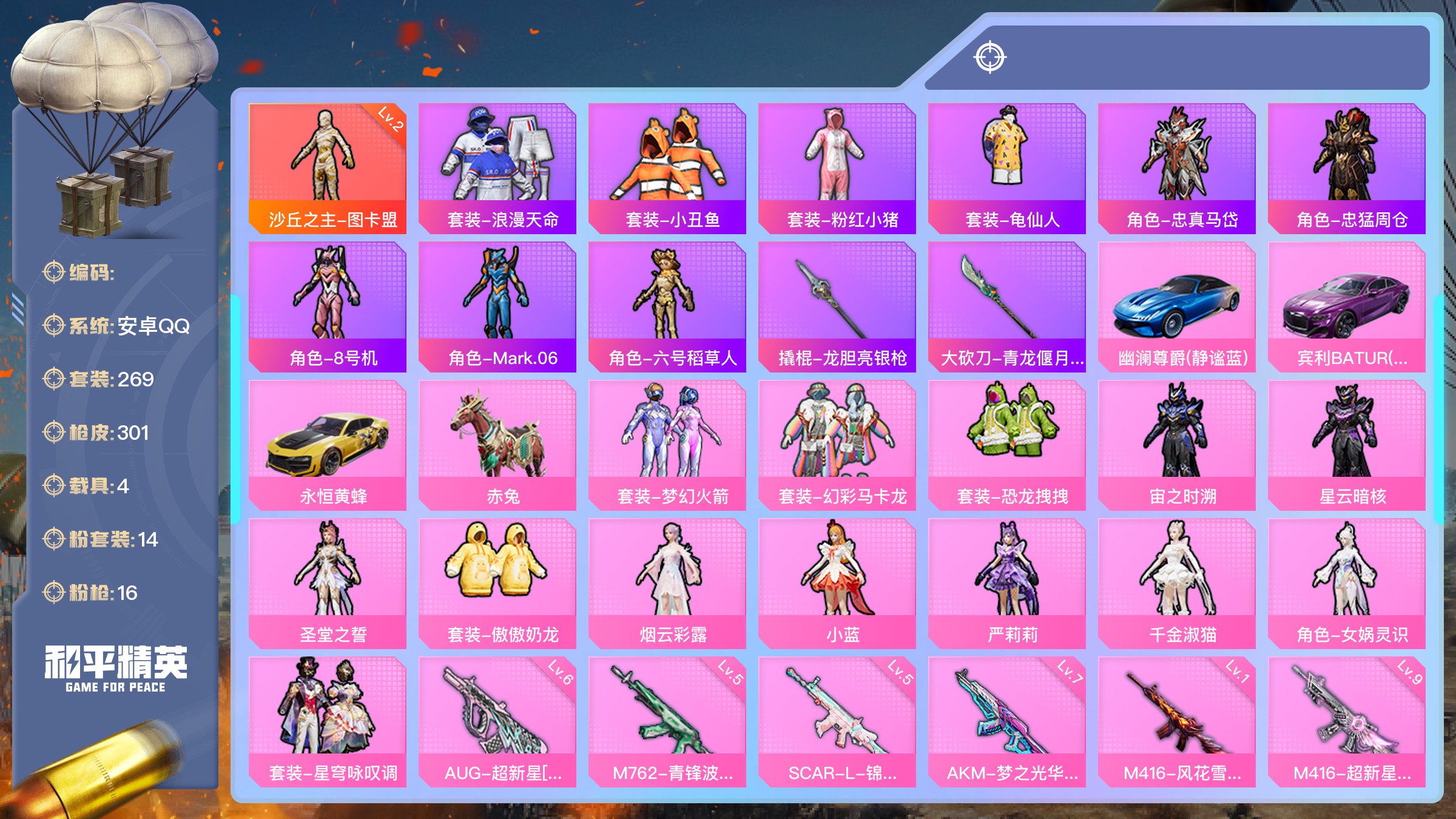 【游戏多多】 【0p395afde】热力值:114483,14粉装,16粉呛,4载具,42粉色战备,269套装,301呛械,452装备,20滑翔尾翼,111降落伞;等级:lv.69 历史最高段位:传奇王牌15星 当前段位:荣耀.皇冠ⅲ;王牌印记20次 卓越印记7次 传奇印记2次; 【热门套装】:沙丘之主-图卡盟[2级],套装-浪漫天命,套装-小丑鱼,套装-粉红小猪,套装-龟仙人,角色-忠真马岱,角色-忠猛周仓,角色-8号机,角色-mark.06,角色-六号稻草人,撬棍-龙胆亮银呛,大砍刀-青龙偃月刀;【红色套装】:沙丘之主-图卡盟[2级];【粉色套装】:粉装-梦幻火箭,粉装-幻彩马卡龙,粉装-恐龙拽拽,粉装-宙之时溯,粉装-星云暗核,粉装-圣堂之誓,粉装-傲傲奶龙,粉装-烟云彩露,粉装-小蓝,粉装-严莉莉,角色-千金淑猫,角色-女娲灵识,粉装-星穹咏叹调;【粉色呛械】:aug-超新星[6级],m762-青锋波束[5级],scar-l-锦绣绵绵[5级],akm-梦之光华[7级],m416-风花雪月[1级],m416-超新星[9级],groza-精灵之光[3级],amr-炫光之旅[4级],kar98k-巳巳如意[5级],m24-镜域双华[3级],mk14-盛世惊鸿[3级],mk12-雪月幻音[3级],ump45-量子极限[5级],p90-沙丘之主[3级],dp-28-豹影疾电[5级],破片手留单-秋玉花灯[6级];【粉色载具】:幽澜尊爵(静谧蓝),宾利batur(极速紫),永恒黄蜂,赤兔;【粉色滑翔尾翼】:龙翔九天飞行器[1级],绝色倾城飞行器,幽焰列车飞行器[1级],赛博古神飞行器,萌物绒绒飞行器,镜域双华-灵镜之阶,万古烈焰飞行器,沙丘之主天马[1级],深渊漩涡飞行器,凤舞九天飞行器,超新星飞行器[2级],脆鲨七海飞行器,酣梦熊熊飞行器;【粉色降落伞】:金丰海韵降落伞,千金淑猫降落伞,彩虹独角兽降落伞,墨龙九天降落伞,星之彼岸降落伞,甜梦小狐降落伞,精灵梦叶罗丽降落伞,幽焰骑士降落伞,梦幻火箭降落伞,莲影清波降落伞,巴啦啦小魔仙降落伞,至尊龙雀降落伞,炫光之旅降落伞,月下星之子降落伞,月影灵韵降落伞,第五大道降落伞,江南烟雨降落伞,星穹咏叹调降落伞,星梦奇缘降落伞,沙丘之主降落伞,圣堂之誓降落伞,镜域双华降落伞,拳皇狂花道降落伞,萌物绒绒降落伞,蜜语绒猫降落伞,古堡领主降落伞,甜蜜誓约降落伞,暗夜鎏金降落伞,精灵迷巫降落伞;【其他套装】:套装-特训学院,套装-猎鹰,套装-青年教官,套装-橘黑制服,套装-红色运动,套装-黄色运动,套装-蓝色运动,套装-黄色伏地魔,套装-白色伏地魔,套装-黑色伏地魔,套装-骑行爱好者,套装-竞技名士,套装-深蓝色名流,套装-酒红色名流,套装-湖蓝色名流,套装-黄色名流,套装-猛禽,套装-长空猛禽,套装-竞技勇士朋克,套装-黎明保卫者,套装-蓝色守护者,套装-海岛探路者,套装-雨林探路者,套装-旭日情侣,套装-六六大吉,套装-冷焰舞者,套装-灼焰舞者,套装-特战装甲,套装-浪漫假日,套装-贵族骑装,套装-战地督导,套装-特殊使命,套装-突袭者,套装-黄色格斗者,套装-灰色格斗者,套装-活力之心,套装-甜蜜告白,套装-迎春赐吉,套装-春日漫步,套装-龙腾端午,套装-燃烧卡路里,套装-沙漠毒蛇,套装-鹰眼刺客,套装-完美偶像,套装-人气偶像,套装-幻影武者,套装-街头潮人,套装-暗金炫舞,套装-蓝彩潮人,套装-千禧之恋,套装-神秘领域,套装-魅力单车,套装-绮丽涂鸦,套装-狂战萌兔,套装-雪山征服者,套装-坚韧舞者,套装-竞技达人朋克,套装-夜莺强袭者,套装-野性战心,套装-狂沙舞者,套装-破晓战魂,套装-都市魅力,套装-荣耀,套装-风行保卫者,套装-热血青春,套装-沙漠兵团,套装-丛林猎人,套装-火舞潮人,套装-雪山精英,套装-酷潮明星,套装-传奇侦探,套装-极地朋克,套装-幻世战舞者,套装-金耀舞者,套装-蓝调潮人,套装-迅捷狂鲨,套装-青涩时光,套装-缤纷果语,套装-滨海厨神,套装-龙魂突击队,套装-元素星魂,套装-极速红龙,套装-格斗先锋,套装-海上生明月,套装-麻辣教官,套装-破蛋小黄鸡,套装-疯狂小兔子,套装-阳光火鸡,套装-ss5特训,套装-圣诞大吉,套装-冰原使者,套装-凛冬战士,套装-好奇恐龙,套装-金鼠迎春,套装-军械专家,套装-北国孤狼,套装-ss6特训,套装-拳皇97草薙京,套装-炽焰拳师,套装-格斗专家,套装-奇迹天团,套装-跃动心情,套装-ss7特训,套装-黑色刀锋,套装-核芯基因,套装-精神漫游,套装-鹤鸣,套装-霓虹街区,套装-纯白誓言,套装-五号元素,套装-ss10特训,套装-ss8特训,套装-萌黄之夏,套装-隐空刺,套装-夏日音浪,套装-丝绸行者,套装-探宝勇士,套装-粉甜马卡龙,套装-牛气满满,套装-ss11特训,套装-玄武圣者,套装-原初圣火,套装-逆风勇士,套装-萌趣颜团子,套装-战术大师,套装-ss12特训,套装-牛气冲天,套装-ss18特训,套装-耀粉歌者,套装-飞行日记,套装-ss13特训,套装-曼妙人鱼,套装-热情海星,套装-纯真浪花,套装-冰爽海盐,套装-浪漫樱花,套装-ss14特训,套装-电音精灵,套装-吉莉礼服,套装-ss15特训,套装-ss16特训,套装-ss17特训,套装-冰爽风暴,套装-福星高照,套装-ss19特训,套装-炫蓝之夏,套装-ss20特训,套装-粉团憨憨,套装-软羊咩咩,套装-奶芙汪汪,套装-ss21特训,套装-暖心熊熊,套装-萌趣咩咩,套装-娇憨猪猪,套装-玉兔迎春,套装-ss22特训,套装-和煦暖阳,套装-田园牧歌,套装-轻风白浪,套装-光之冒险,套装-绯格组合,套装-ss23特训,套装-摩登艾咪,套装-甜梦熊熊,套装-神气柴柴,套装-懵萌河马,套装-灵蜜圈圈,套装-妙红点点,套装-幻彩翩翩,套装-王牌教练,套装-柠萌假日,套装-青玉碎影,套装-ss24特训,套装-绚紫流光,角色-究极悟饭,套装-涂山之恋,套装-ss25特训,套装-惊鸿侠骨,套装-锦衣飞扬,