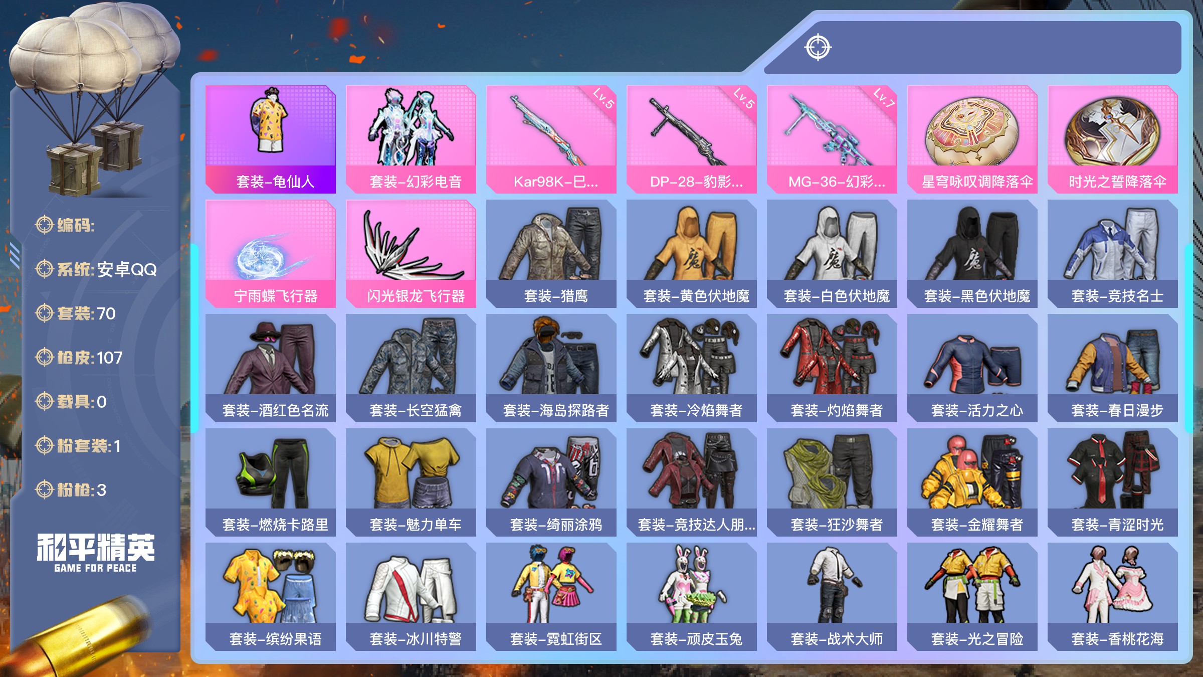 【游戏多多】 【0p395ddga】热力值:43024,9粉装,4粉呛,13粉色战备,108套装,133呛械,166装备,4滑翔尾翼,43降落伞;等级:lv.59 历史最高段位:超级王牌10星 当前段位:不朽.星钻ⅰ;王牌印记4次 卓越印记1次; 【热门套装】:套装-金羽特工,套装-暗影哥特,套装-小丑鱼,套装-粉红小猪,套装-龟仙人;【粉色套装】:粉装-缤纷油彩,粉装-冰霜白皇,粉装-童趣迷兔,粉装-洛天依,粉装-橘柚倾心,粉装-小可学妹,粉装-呆萌星弥,粉装-飒粉甜心,粉装-炫光之旅;【粉色呛械】:m416-心之恋语[6级],kar98k-巳巳如意[3级],dp-28-豹影疾电[3级],mg3-洛神天依[6级];【粉色滑翔尾翼】:童趣迷兔飞行器,黄族统领飞行器;【粉色降落伞】:金风玉露降落伞,洛神天依降落伞,海螺星光降落伞,彩虹甜喵降落伞,垂柳戏鸭降落伞,炫光之旅降落伞,暗星紫秘降落伞,香水柠檬降落伞,童趣迷兔降落伞,喜羊羊与灰太狼降落伞,第五大道降落伞;【其他套装】:套装-白色伏地魔,套装-黑色伏地魔,套装-骑行爱好者,套装-竞技名士,套装-湖蓝色名流,套装-黄色名流,套装-长空猛禽,套装-漫步者,套装-黎明保卫者,套装-海岛探路者,套装-缤纷假日,套装-甜蜜告白,套装-鹰眼刺客,套装-完美偶像,套装-魅力单车,套装-耀眼新星,套装-坚韧舞者,套装-荣耀,套装-沙漠兵团,套装-幻世战舞者,套装-青涩时光,套装-缤纷果语,套装-耀动青春,套装-麻辣教官,套装-疯狂小兔子,套装-鹤鸣,套装-暗夜契约,套装-纯白誓言,套装-萌黄之夏,套装-影双刃,套装-人鱼之吻,套装-顽皮玉兔,套装-牛气满满,套装-萌趣颜团子,套装-战术大师,套装-牛气冲天,套装-ss18特训,套装-耀粉歌者,套装-飞行日记,套装-天籁歌者,套装-电音精灵,套装-极乐追光,套装-异彩先驱,套装-霓虹极客,套装-ss19特训,套装-飞驰魅影,套装-音速流光,套装-炫蓝之夏,套装-ss20特训,套装-猎梦纪元,套装-甜心亚梦,套装-虚音幻奏,套装-香草威化,套装-ss21特训,套装-萌趣咩咩,套装-娇憨猪猪,套装-玉兔迎春,套装-ss22特训,套装-田园牧歌,套装-轻风白浪,套装-绚烂繁星,套装-绯格组合,套装-ss23特训,套装-莱茵河畔,套装-甜梦熊熊,套装-神气柴柴,套装-懵萌河马,套装-幻彩翩翩,套装-王牌教练,套装-柠萌假日,套装-青玉碎影,套装-ss24特训,套装-荧惑魅影,套装-日照花林,套装-涂山之恋,套装-ss25特训,套装-惊鸿侠骨,套装-锦衣飞扬,套装-深海梦境,套装-果汁能量,套装-龙的传人,套装-ss26特训,套装-空岛之星,套装-ss27特训,角色-情公主,套装-海盐绵绵冰,套装-ss31特训,套装-ss33特训,套装-巳巳如意,套装-ss34特训,套装-ss35特训,套装-午间小调,套装-风迹短诗,套装-萌鸡速递;其他呛械:scar-l-炫彩节奏,scar-l-夜灯,scar-l-玉兔迎春,scar-l-夏日绵绵冰,m762-深海曼妙,m762-绯红前夜,m762-第五大道,m762-天降萌叽,akm-萌趣颜团子,akm-灼热熔岩,akm-环太平洋,akm-霓彩脉冲,akm-龙的传人,akm-破晓战魂,蜜獾-垂柳戏鸭,蜜獾-天降萌叽,蜜獾-风迹短诗,蜜獾-娇憨猪猪,groza-异彩先驱,groza-田园牧歌,groza-懵萌河马,famas-霓彩脉冲,aug-耀粉歌者,ac-val-天降萌叽,ac-val-乌木金纹,ac-val-甜心亚梦,m16a4-甜心亚梦,m16a4-幻世战舞者,g36c-懵萌河马,g36c-炙焰牛王,m416-暗星紫秘,m416-绯红前夜,m416-糯团青竹,qbz-飞驰魅影,qbz-洛神天依,mk47-妙红点点,mk47-洛神天依,mk47-乌木金纹,mk47-炫光之旅,mk47-风迹短诗,莫辛纳甘-风迹短诗,莫辛纳甘-乌木金纹,莫辛纳甘-懵萌河马,m24-乌木金纹,m24-影袭,amr-乌木金纹,amr-妙红点点,kar98k-飞驰魅影,kar98k-洛神天依,kar98k-炫彩节奏,m200-乌木金纹,m200-惊鸿侠骨,awm-庄周梦蝶,win94-乌木金纹,svd-霓彩脉冲,mk14-乌木金纹,mk14-童趣迷兔,mk14-紫晶流影,m417-惊鸿侠骨,mini14-海渊国主,mini14-涂山之恋,mini14-异彩先驱,vss-碧影闪光,vss-粉色回忆,vss-田园牧歌,sks-炫彩节奏,slr-霓彩脉冲,slr-娇憨猪猪,mk12-风迹短诗,ump45-炫光之旅,ump45-涂山之恋,ump45-仲夏莫吉托,aks-74u-乌木金纹,uzi-金风玉露,uzi-娇憨猪猪,uzi-天降萌叽,uzi-啾咪啾咪,uzi-影袭,vect-田园牧歌,vect-彩虹符号,mp5k-乌木金纹,mp5k-异彩先驱,汤姆逊-天降萌叽,汤姆逊-异彩先驱,p90-玩趣呆呆,p90-巳巳如意,p90-乌木金纹,p90-飞驰魅影,野牛-乌木金纹,dbs-彩虹符号,dbs-甜心亚梦,dbs-第五大道,dbs-风迹短诗,spas-12-田园牧歌,s12k-玩趣呆呆,s12k-娇憨猪猪,s12k-霓彩脉冲,s12k-幻世战舞者,s12k-童趣迷兔,s12k-夜灯,s686-巳巳如意,s1897-飞驰魅影,aa12-g-炫光之旅,dp-28-彩虹符号,dp-28-甜心亚梦,mg3-妙红点点,mg3-幻世战舞者,mg3-乌木金纹,mg3-惊鸿侠骨,pkm-懵萌河马,m249-妙红点点,蝎式手呛-闲梦青缨,电击呛-喜羊羊与灰太狼,撬棍-幻世战舞者,平底锅-梦幻舞会,平底锅-甜心亚梦,平底锅-娇憨猪猪,平底锅-田园牧歌,平底锅-飞驰魅影,平底锅-异彩先驱,平底锅-惊鸿侠骨,平底锅-懵萌河马,平底锅-妙红点点,平底锅-空岛之星,破片手留单-拽到爆炸,破片手留单-呆爆全场,破片手留单-巳巳如意,十子怒-异瞳寒姬,爆炸猎弓-惊鸿侠骨;【其他滑翔尾翼】:鸡智如我飞行器,光之冒险尾迹;【其他降落伞】:异彩先驱降落伞,风迹短诗降落伞,惊鸿侠骨降落伞,萌趣颜团子降落伞,ss24王牌降落伞,异域银装降落伞,白昼之火降落伞,涂山之恋降落伞,紫菱降落伞,蝶舞翩翩降落伞,懵萌河马降落伞,田园牧歌降落伞,勇者同行降落伞,娇憨猪猪降落伞,青羽降落伞,元宵华灯降落伞,百战成名降落伞,幻世战舞者降落伞,化学天才降落伞,云上灯宵降落伞,飞驰魅影降落伞,2023祥云降落伞,亚洲精英降落伞,月下萌萌