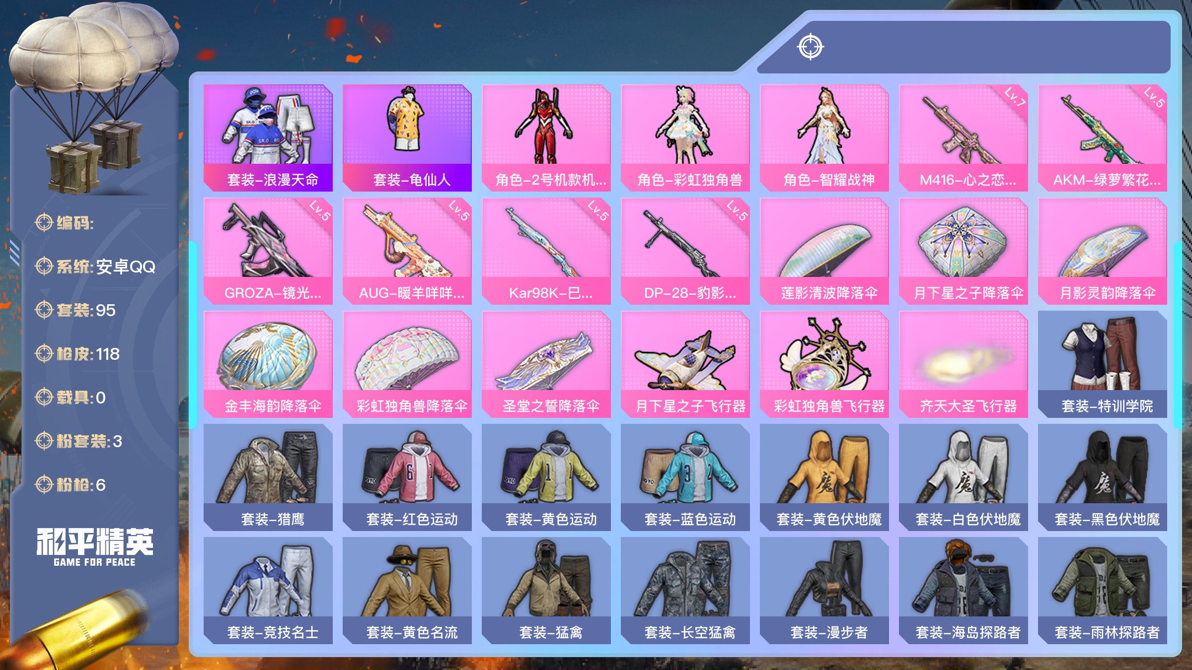 【游戏多多】 【06qoiahaf】热力值:92748,12粉装,14粉呛,30粉色战备,205套装,279呛械,378装备,12滑翔尾翼,98降落伞;等级:lv.64 历史最高段位:卓越王牌13星 当前段位:不朽.星钻ⅲ;王牌印记14次 卓越印记3次 传奇印记2次; 【热门套装】:套装-金羽特工,套装-深海小丑鱼,角色-军刀雅典娜,套装-龟仙人,角色-mark.06;【粉色套装】:粉装-智能音符,粉装-苍蓝魅影,角色-洛天依,粉装-暗夜玫瑰,粉装-垂柳戏鸭,角色-歌者泠鸢,粉装-纯珍童话,粉装-闲梦青缨,角色-电波星,粉装-未来领航者,角色-樱桃泡泡,粉装-幻彩电音;【粉色呛械】:m762-青锋波束[5级],akm-幽焰骑士[3级],m416-五爪金龙[7级],aug-暖羊咩咩[5级],groza-镜光银凌[5级],scar-l-机甲封神[6级],kar98k-巳巳如意[5级],mk14-甜梦熊击[5级],mk12-雪月幻音[5级],vect-最终圣卫者[3级],ump45-量子极限[5级],mg-36-沧焰双生[5级],mg3-洛神天依[7级],dp-28-豹影疾电[5级];【粉色滑翔尾翼】:龙翔九天飞行器[1级],星夜魔法师飞行翼,深渊漩涡飞行器,歌者泠鸢飞行器,终晖之翼飞行器,祥瑞起舞飞行器,齐天大圣飞行器,凤舞九天飞行器;【粉色降落伞】:幽焰骑士降落伞,歌者泠鸢降落伞,香水柠檬降落伞,萌物绒绒降落伞,至尊龙雀降落伞,金蛇镇世降落伞,洛神天依降落伞,精灵梦叶罗丽降落伞,烈焰拳霸降落伞,仲夏莫吉托降落伞,金丰海韵降落伞,镜域双华降落伞,雪月幻音降落伞,初号机觉醒ver.降落伞,春暖花开降落伞,辉耀战甲降落伞,千面幻镜降落伞,王牌四分卫降落伞,四圣焕新降落伞,智耀战神降落伞,绯穹魔姬降落伞,幻彩电音降落伞;【其他套装】:套装-骑行爱好者,套装-竞技名士,套装-湖蓝色名流,套装-野性山猫,套装-长空猛禽,套装-竞技勇士朋克,套装-蓝色守护者,套装-海岛探路者,套装-沙漠探路者,套装-西部风情,套装-旭日情侣,套装-特战装甲,套装-青春校园,套装-活力之心,套装-甜蜜告白,套装-迎春赐吉,套装-龙腾端午,套装-燃烧卡路里,套装-冷酷挑战者,套装-海滨突袭者,套装-蓝彩潮人,套装-怒火燎原,套装-魅力单车,套装-耀眼新星,套装-雪山征服者,套装-竞技达人朋克,套装-朋克治安官,套装-都市漫游者,套装-破晓战魂,套装-森林游猎者,套装-风行保卫者,套装-丛林猎人,套装-雪山精英,套装-酷潮明星,套装-传奇侦探,套装-极地朋克,套装-精密机核,套装-弄潮海豚,套装-呆萌铁蟹,套装-生化防暴队,套装-青涩时光,套装-滨海厨神,套装-龙魂突击队,套装-风暴特警,套装-极速红龙,套装-格斗先锋,套装-旷野奇兵,套装-海上生明月,套装-东方飞龙,套装-万圣娃娃,套装-疯狂小兔子,套装-ss5特训,套装-圣诞大吉,套装-熔岩使者,套装-凛冬战士,套装-北国孤狼,套装-ss6特训,套装-拳皇97草薙京,套装-炽焰拳师,套装-格斗专家,套装-跃动心情,套装-ss7特训,套装-黑色刀锋,套装-新侠客行,套装-鹤鸣,套装-霓虹街区,套装-暗夜契约,套装-ss8特训,套装-萌黄之夏,套装-牛气满满,套装-青春冒险家,套装-潮流游乐家,套装-青龙圣者,套装-诡谋托雷基亚,套装-萌趣颜团子,套装-特种颜团子,套装-战术大师,套装-ss12特训,套装-牛气冲天,套装-ss18特训,套装-耀粉歌者,套装-治愈之星,套装-科技之星,套装-飞行日记,套装-ss13特训,套装-竞技角斗士,套装-热情海星,套装-纯真浪花,套装-冰爽海盐,套装-双棍侠客,套装-ss14特训,套装-天籁歌者,套装-电音精灵,套装-吉莉礼服,套装-ss15特训,套装-ss16特训,套装-暴风机械师,套装-时空追击者,套装-ss17特训,套装-瑞龙福将,套装-团圆交子,套装-福星高照,套装-虎虎生威吉莉,套装-玉兔迎春,套装-ss22特训,套装-田园牧歌,套装-轻风白浪,套装-白啸长虹,套装-绚烂繁星,套装-光之冒险,套装-绯格组合,套装-ss23特训,套装-莱茵河畔,套装-白兰地假日,套装-妙红点点,套装-幻彩翩翩,套装-王牌教练,套装-柠萌假日,套装-青玉碎影,套装-涂山之恋,套装-ss25特训,套装-惊鸿侠骨,套装-锦衣飞扬,套装-香桃花海,套装-龙的传人,套装-冰河战士,套装-ss26特训,套装-漫游都市,套装-空岛之星,套装-焰鹰斗篷,套装-幽夜迷踪,套装-幻羽潜行,套装-ss27特训,套装-恋语绒绒,套装-老实芭蕉,套装-ss28特训,角色-湖雨初晴,玩偶服-卖崽青蛙,角色-白光莹,角色-情公主,套装-海盐绵绵冰,套装-蝶变,套装-创世追猎,套装-ss29特训,套装-虚空漩涡,套装-引力深渊,套装-雏菊兔兔,套装-萝兰蝴蝶,套装-异域银装,角色-摩登魅猫,套装-星途旅人,套装-闪电轻猫,角色-临安公主,套装-ss30特训,套装-青团波波,角色-绛羽幽主,套装-糖糖葫芦,套装-黑曜寓言,套装-ss31特训,套装-鱼渊荷华,套装-燕燕于飞,套装-智谋强哥,角色-风玲,套装-紫幽梦,套装-粉恋花,套装-ss33特训,套装-云朵鹅,套装-巳巳如意,套装-ss32特训,套装-彩虹兔,角色-幽秘之星,套装-蓝冰羽,套装-顶瓜瓜,套装-雪绒豹,套装-大橘大利,套装-星渊小夜曲,套装-霓虹热舞,套装-星影赞美诗,套装-蓝海鲸歌,套装-元气之梦,套装-ss34特训,套装-玄甲羽卫,套装-擎苍青焰,套装-朱霞炽焰,套装-凌霄紫焰,套装-薄荷星砂,套装-ss35特训,套装-萌鸡速递;其他呛械:g36c-星穹咏叹调,g36c-时空追击者,g36c-乌木金纹,qbz-神秘黑猫,qbz-潮汐统领,qbz-纯真浪花,qbz-未来歌姬,qbz-赛罗,qbz-彩虹符号,qbz-洛神天依,m16a4-冰河战士,m16a4-千金淑猫,m16a4-幻世战舞者,蜜獾-绯穹魔姬,蜜獾-乌木金纹,蜜獾-冰澜龙吟,蜜獾-天降萌叽,蜜獾-糖糖葫芦,蜜獾-精灵梦叶罗丽,m762-雏菊兔兔,m762-云朵鹅,m762-拳皇97,m762-牛气冲天,m762-瑞龙福将,m76