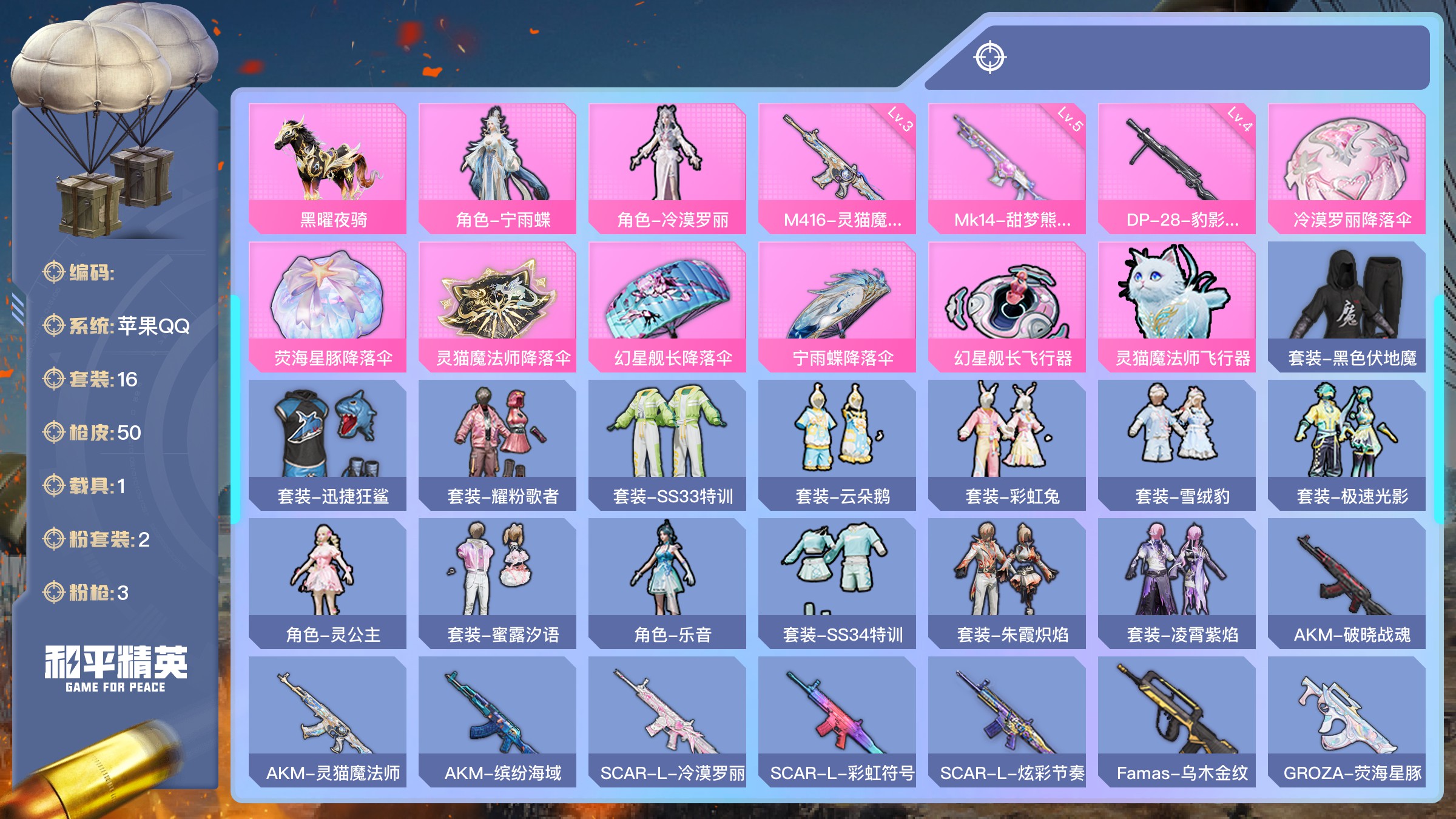 【游戏多多】 【037mngg2b】热力值:13392,2粉装,3粉呛,1载具,7粉色战备,16套装,50呛械,52装备,3滑翔尾翼,13降落伞;等级:lv.47 历史最高段位:绝世王牌22星 当前段位:不朽.星钻ⅳ;王牌印记2次 卓越印记2次 传奇印记2次 绝世印记1次; 【粉色套装】:角色-宁雨蝶,角色-冷漠罗丽;【粉色呛械】:m416-灵猫魔法师[3级],mk14-甜梦熊击[5级],dp-28-豹影疾电[4级];【粉色载具】:黑曜夜骑;【粉色滑翔尾翼】:幻星舰长飞行器,灵猫魔法师飞行器;【粉色降落伞】:冷漠罗丽降落伞,荧海星豚降落伞,灵猫魔法师降落伞,幻星舰长降落伞,宁雨蝶降落伞;【其他套装】:套装-黑色伏地魔,套装-迅捷狂鲨,套装-耀粉歌者,套装-ss33特训,套装-云朵鹅,套装-彩虹兔,套装-雪绒豹,套装-极速光影,角色-灵公主,套装-蜜露汐语,角色-乐音,套装-ss34特训,套装-朱霞炽焰,套装-凌霄紫焰;其他呛械:akm-破晓战魂,akm-灵猫魔法师,akm-缤纷海域,scar-l-冷漠罗丽,scar-l-彩虹符号,scar-l-炫彩节奏,famas-乌木金纹,groza-荧海星豚,arx-凌霄紫焰,m762-云朵鹅,m762-天降萌叽,aug-异域银装,aug-紫晶流影,svd-云朵鹅,svd-冷漠罗丽,amr-鸡智如我,mini14-穿刺龙虾,sks-迅猛狂鲨,mk14-薄荷星砂,m417-玩趣呆呆,aks-74u-鸡智如我,aks-74u-乌木金纹,js9-凌霄紫焰,ump45-夜灯,ump45-绿洲时空,uzi-天降萌叽,汤姆逊-灵猫魔法师,s1897-荧海星豚,dbs-荧海星豚,s12k-夜灯,spas-12-云朵鹅,m249-糯团青竹,m249-绯穹魔姬,mg-36-凌霄紫焰,p92-凌霄紫焰,沙墨之鹦-云朵鹅,电击呛-喜羊羊与灰太狼,r45-幻彩电音,大砍刀-云朵鹅,撬棍-冷漠罗丽,撬棍-灵猫魔法师,平底锅-宁雨蝶,平底锅-凌霄紫焰,盐雾蛋-冰氧夏日,爆炸猎弓-喜羊羊与灰太狼,十子怒-异域银装,破片手留单-咒蚀之裁;【其他滑翔尾翼】:异域银装飞行器;【其他降落伞】:折梦之诗降落伞,ss34王牌降落伞,普通降落伞,云朵鹅降落伞,异域银装降落伞,ss33王牌降落伞,化学天才降落伞,凌霄紫焰降落伞;【伙伴】:伙伴-盔仔,详情看图【实际信息请以最终验号结果为准】【苹果qq】【不可二次实名】【无】