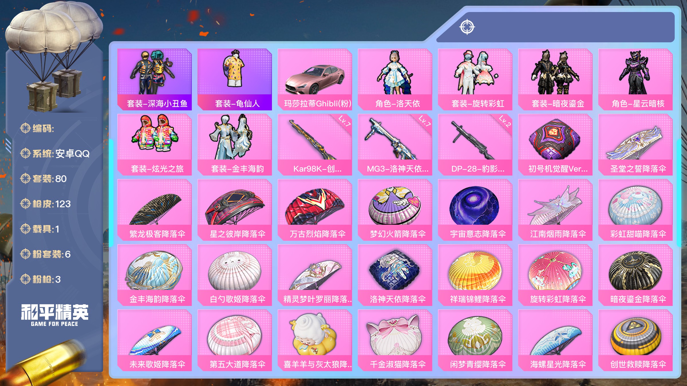 【游戏多多】 【037mndf2c】热力值:85368,13粉装,9粉呛,7载具,27粉色战备,176套装,218呛械,266装备,9滑翔尾翼,70降落伞;等级:lv.69 历史最高段位:卓越王牌16星 当前段位:不朽.星钻ⅳ;王牌印记16次 卓越印记2次; 【热门套装】:套装-金羽特工,套装-暗影哥特,套装-星河浪客,套装-粉红小猪,套装-浪漫波比,套装-龟仙人,角色-8号机,角色-mark.06;【粉色套装】:粉装-梦幻火箭,粉装-桀骜红莲,粉装-彩虹鹿灵,粉装-银龙傲海,粉装-暗夜玫瑰,角色-初号机款机体服,粉装-暗星紫秘,粉装-橘柚倾心,粉装-紫电风暴,粉装-闲梦青缨,角色-星云暗核,角色-罗征,角色-荧海星豚;【粉色呛械】:aug-星梦奇缘[3级],m416-心之恋语[7级],akm-绿萝繁花[5级],kar98k-巳巳如意[5级],awm-焰龙焚天[7级],mk14-闲梦青缨[7级],slr-暗夜玫瑰[4级],ump45-量子极限[5级],dp-28-豹影疾电[5级];【粉色载具】:玛莎拉蒂ghibli(粉),特斯拉roadster(水滴蓝),兰博基尼estoque(银翼灰),兰博基尼aventadsvj(翡翠绿),海龙奔腾,路特斯eletre(花绽灰),星梦玉骢;【粉色滑翔尾翼】:宁雨蝶飞行器,灵猫魔法师飞行器,焰龙焚天飞行器,天之羽翼飞行器;【粉色降落伞】:葫芦兄弟降落伞,天之羽翼降落伞,青空秋雨降落伞,绯穹魔姬降落伞,洛神天依降落伞,灵猫魔法师降落伞,闲梦青缨降落伞,绿意幻情降落伞,机甲封神降落伞,初号机觉醒ver.降落伞,焰龙焚天降落伞,异瞳寒姬降落伞,荧海星豚降落伞,橘柚倾心降落伞,冷漠罗丽降落伞,筑梦精灵降落伞,环太平洋降落伞,暗夜玫瑰降落伞,暗星紫秘降落伞,风花雪月降落伞,星梦奇缘降落伞,星之彼岸降落伞,恐龙拽拽降落伞;【其他套装】:套装-猎鹰,套装-青年教官,套装-黄色运动,套装-蓝色运动,套装-黄色伏地魔,套装-白色伏地魔,套装-黑色伏地魔,套装-竞技名士,套装-深蓝色名流,套装-酒红色名流,套装-湖蓝色名流,套装-黄色名流,套装-猛禽,套装-长空猛禽,套装-黎明保卫者,套装-冷焰舞者,套装-灼焰舞者,套装-特战装甲,套装-战地菁英,套装-战地督导,套装-特殊使命,套装-春日漫步,套装-滨海假日,套装-冰冻风暴,套装-完美偶像,套装-人气偶像,套装-幻影武者,套装-街头潮人,套装-蓝彩潮人,套装-千禧之恋,套装-神秘领域,套装-怒火燎原,套装-魅力单车,套装-绮丽涂鸦,套装-破晓战魂,套装-都市魅力,套装-荣耀,套装-热血青春,套装-沙漠兵团,套装-雪山精英,套装-酷潮明星,套装-幻世战舞者,套装-甜蜜熊情侣,套装-青涩时光,套装-缤纷果语,套装-龙魂突击队,套装-冰川特警,套装-极速红龙,套装-wifi精灵,套装-麻辣教官,套装-破蛋小黄鸡,套装-金鼠迎春,套装-军械专家,套装-霓虹街区,套装-软萌银虎,套装-萌黄之夏,套装-夏日音浪,套装-探宝勇士,套装-牛气满满,套装-特种颜团子,套装-战术大师,套装-ss12特训,套装-牛气冲天,套装-ss18特训,套装-耀粉歌者,套装-飞行日记,套装-热情海星,套装-纯真浪花,套装-天籁歌者,套装-电音精灵,角色-欧布奥特曼,角色-零款战斗服,角色-明日香款战斗服,套装-ss16特训,套装-暴风机械师,套装-时空追击者,套装-暗夜魅影,套装-暗夜傀儡,套装-ss17特训,套装-瑞龙福将,套装-团圆交子,套装-爆裂葡萄,套装-极乐追光,套装-福星高照,套装-豚鼠丹丹,套装-雪兔飞飞,套装-虎虎生威吉莉,套装-缤纷焰火,套装-异彩先驱,套装-霓虹极客,套装-绿翡凌光,套装-月蓝流光,套装-空投萌叽,套装-ss19特训,套装-沁蓝冰爽,套装-极速竞梦,套装-飞驰魅影,套装-音速流光,套装-炫蓝之夏,套装-ss20特训,套装-覆海蛟龙,套装-ss21特训,套装-玉兔迎春,套装-ss22特训,套装-光之冒险,套装-ss23特训,套装-王牌教练,套装-柠萌假日,套装-ss24特训,套装-华灯初上,套装-日照花林,套装-涂山之恋,套装-ss25特训,套装-惊鸿侠骨,套装-锦衣飞扬,套装-香桃花海,套装-龙的传人,套装-冰河战士,套装-ss26特训,套装-空岛之星,套装-ss27特训,套装-ss28特训,角色-极地流光,角色-粉雾星云,套装-街头风暴,套装-海盐绵绵冰,套装-蝶变,套装-ss29特训,套装-异域银装,套装-星途旅人,套装-ss30特训,角色-光矢逐梦,角色-夜瞳黯灵,套装-ss31特训,套装-智谋强哥,套装-ss33特训,套装-云朵鹅,套装-ss32特训,套装-彩虹兔,套装-顶瓜瓜,套装-雪绒豹,套装-大橘大利,套装-蜜露汐语,角色-乐音,角色-黯羽织刑,套装-元气之梦,角色-玫纹锢梦,套装-ss34特训,套装-擎苍青焰,套装-朱霞炽焰,套装-游乐,套装-凌霄紫焰,套装-薄荷星砂,套装-ss35特训,套装-萌鸡速递;其他呛械:aug-天降萌叽,aug-紫晶流影,aug-焰龙焚天,aug-闲梦青缨,aug-异域银装,aug-耀粉歌者,qbz-纯真浪花,qbz-绚金瑰梦,qbz-洛神天依,qbz-彩虹符号,qbz-飞驰魅影,arx-凌霄紫焰,m416-葫芦兄弟,m416-夜灯,m416-糯团青竹,m416-蓝色火焰,mk47-林间仙鹿,mk47-洛神天依,mk47-乌木金纹,mk47-天之羽翼,scar-l-凝视深渊,scar-l-星途旅人,scar-l-冷漠罗丽,scar-l-玉兔迎春,scar-l-暗夜玫瑰,scar-l-海盐豹豹,scar-l-粉锦千层,akm-虎虎生威,akm-彩虹符号,akm-生命誓言,akm-霓虹街区,akm-霓彩脉冲,akm-海渊国主,akm-灵猫魔法师,akm-龙的传人,akm-破晓战魂,akm-星之彼岸,akm-恐龙拽拽,akm-灼热熔岩,akm-涂鸦街区,akm-夜灯,akm-绿洲时空,g36c-乌木金纹,g36c-暗夜玫瑰,g36c-时空追击者,ac-val-乌木金纹,ac-val-天降萌叽,ac-val-闲梦青缨,蜜獾-乌木金纹,蜜獾-绯穹魔姬,蜜獾-鸡智如我,蜜獾-天降萌叽,groza-恐龙拽拽,groza-异彩先驱,groza-林间仙鹿,m16a4-机械英豪,m16a4-幻世战舞者,m16a4-冰河战士,m762-牛气冲天,m762-瑞龙福将,m762-天降萌叽,m762-