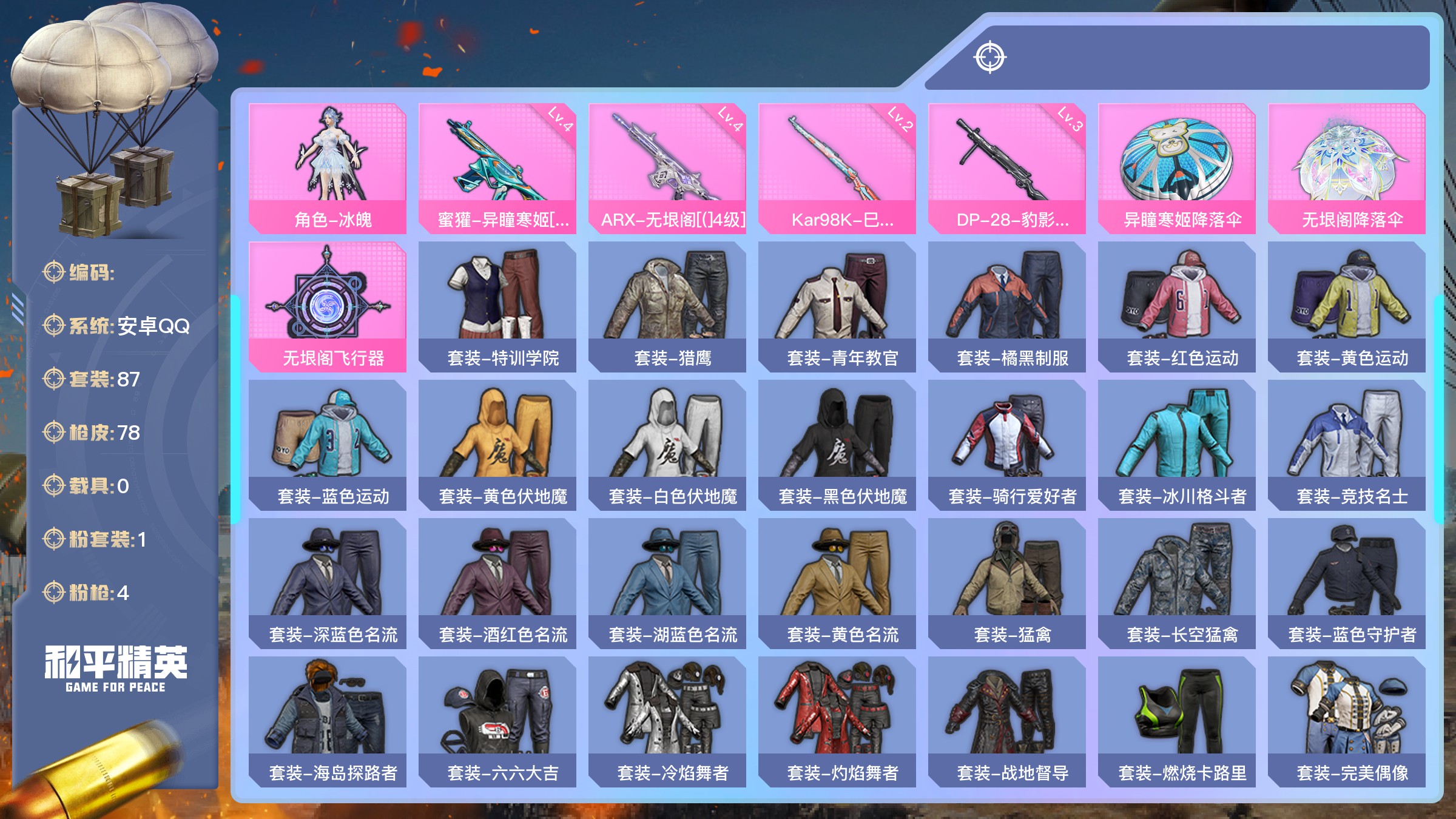 【游戏多多】 【037mnee2f】热力值:23074,1粉装,4粉呛,3粉色战备,87套装,78呛械,55装备,1滑翔尾翼,31降落伞;等级:lv.58 历史最高段位:超级王牌15星 当前段位:不朽.星钻ⅲ;王牌印记8次; 【粉色套装】:角色-冰魄;【粉色呛械】:蜜獾-异瞳寒姬[4级],arx-无垠阁[4级],kar98k-巳巳如意[2级],dp-28-豹影疾电[3级];【粉色滑翔尾翼】:无垠阁飞行器;【粉色降落伞】:异瞳寒姬降落伞,无垠阁降落伞;【其他套装】:套装-特训学院,套装-猎鹰,套装-青年教官,套装-橘黑制服,套装-红色运动,套装-黄色运动,套装-蓝色运动,套装-黄色伏地魔,套装-白色伏地魔,套装-黑色伏地魔,套装-骑行爱好者,套装-冰川格斗者,套装-竞技名士,套装-深蓝色名流,套装-酒红色名流,套装-湖蓝色名流,套装-黄色名流,套装-猛禽,套装-长空猛禽,套装-蓝色守护者,套装-海岛探路者,套装-六六大吉,套装-冷焰舞者,套装-灼焰舞者,套装-战地督导,套装-燃烧卡路里,套装-完美偶像,套装-人气偶像,套装-幻影武者,套装-街头潮人,套装-蓝彩潮人,套装-酷萌兔限定,套装-魅力单车,套装-绮丽涂鸦,套装-竞技达人朋克,套装-野性战心,套装-破晓战魂,套装-都市魅力,套装-潮流炫酷,套装-沙漠兵团,套装-幻世战舞者,套装-缤纷果语,套装-滨海厨神,套装-元素星魂,套装-极速红龙,套装-破蛋小黄鸡,套装-霓虹街区,套装-白熊同盟,套装-夏日音浪,套装-探宝勇士,套装-战术大师,套装-ss18特训,套装-耀粉歌者,套装-竞技角斗士,套装-ss16特训,角色-英勇保护者,套装-ss17特训,套装-空投萌叽,套装-ss19特训,套装-炫蓝之夏,套装-ss20特训,套装-ss21特训,套装-玉兔迎春,套装-ss22特训,套装-光之冒险,套装-绯格组合,套装-ss23特训,套装-柠萌假日,套装-ss25特训,套装-龙的传人,套装-ss26特训,套装-空岛之星,套装-ss27特训,套装-ss28特训,角色-冰公主,套装-海盐绵绵冰,套装-蝶变,套装-ss29特训,套装-星途旅人,套装-ss30特训,套装-ss31特训,角色-风玲,套装-大橘大利,套装-ss35特训,套装-午间小调,套装-风迹短诗;其他呛械:m416-红色方程式,m416-蓝色火焰,m416-糯团青竹,akm-霓虹街区,akm-彩虹符号,akm-破晓战魂,akm-龙的传人,aug-耀粉歌者,scar-l-海盐豹豹,scar-l-红色方程式,scar-l-星途旅人,蜜獾-天降萌叽,蜜獾-风迹短诗,groza-海盐豹豹,groza-春暖花开,m16a4-蓝色火焰,m16a4-幻世战舞者,m16a4-红色方程式,g36c-乌木金纹,m762-天降萌叽,mk47-风迹短诗,莫辛纳甘-乌木金纹,莫辛纳甘-风迹短诗,kar98k-乌木金纹,kar98k-红色方程式,awm-天降萌叽,m24-乌木金纹,win94-乌木金纹,amr-乌木金纹,mk20-h-星途旅人,mk20-h-乌木金纹,mk14-乌木金纹,mk14-薄荷星砂,mini14-耀粉歌者,mini14-炫彩节奏,mini14-香桃花海,slr-霓彩脉冲,mk12-风迹短诗,vss-香桃花海,野牛-乌木金纹,uzi-天降萌叽,uzi-啾咪啾咪,uzi-红色方程式,汤姆逊-天降萌叽,汤姆逊-耀粉歌者,汤姆逊-炫彩节奏,p90-乌木金纹,p90-玩趣呆呆,vect-生命誓言,ump45-蓝色火焰,mp5k-乌木金纹,s1897-春暖花开,s1897-精灵梦叶罗丽,dbs-乌木金纹,dbs-圣堂之誓,dbs-风迹短诗,spas-12-乌木金纹,s12k-幻世战舞者,s12k-破晓战魂,s12k-玩趣呆呆,s686-生命誓言,s686-红色方程式,mg3-幻世战舞者,m249-破晓战魂,m249-糯团青竹,m249-彩虹符号,短管霰弹-星穹咏叹调,平底锅-空岛之星,平底锅-光之冒险,平底锅-精灵梦叶罗丽,平底锅-空投萌叽,撬棍-幻世战舞者,破片手留单-呆爆全场,破片手留单-星途旅人;【其他降落伞】:ss18王牌降落伞,化学天才降落伞,普通降落伞,海盐豹豹降落伞,空岛之星降落伞,ss20王牌降落伞,夏日倾情降落伞,云上灯宵降落伞,霓虹街区降落伞,ss28王牌降落伞,白昼之火降落伞,空投萌叽降落伞,和平使命降落伞,青羽降落伞,光之冒险降落伞,风迹短诗降落伞,星途旅人降落伞,ss29王牌降落伞,月下萌萌兔降落伞,冰河战士降落伞,香桃花海降落伞,ss26王牌降落伞,奇异狩猎者降落伞,ss27王牌降落伞,ss19王牌降落伞,电竞之星降落伞,放飞梦想降落伞,寂夜之火降落伞,幻世战舞者降落伞;【伙伴】:伙伴-鸡哥,伙伴-啾啾,伙伴-盔仔,伙伴-呆呆,详情看图【实际信息请以最终验号结果为准】【安卓qq】【不可二次实名】【无】