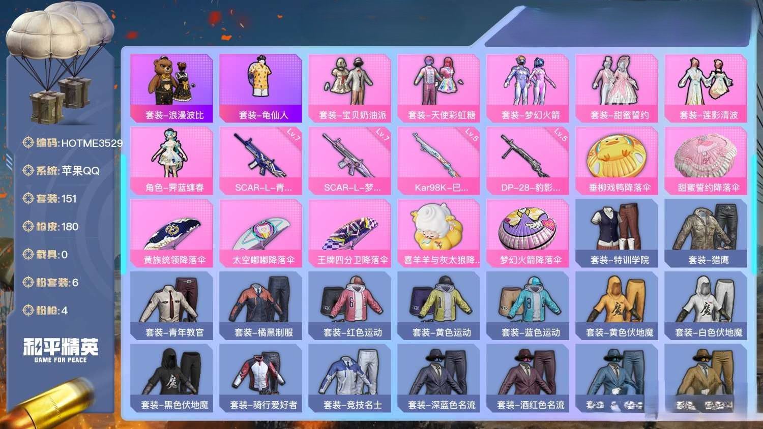【游戏多多】 苹果 手Q 11粉装 7特效枪 1载具 2粉色飞行器 50201热力值 10王牌印记 128套装 157枪皮【粉色套装】:梦幻火箭,金属狂野,缤纷油彩,放客神游,馨动时刻,甜梦小狐,冰川幽秘,闲梦青缨,傲傲奶龙,雪月幻音,荧海星豚【粉色枪皮等级】:M416-超新星(三级),AUG-星梦奇缘(三级),Kar98K-巳巳如意(五级),DP-28-豹影疾电(五级),MG-36-幻彩电音(七级)【粉色载具】:晶梦灵驹【粉色飞行器】:梦幻火箭飞行器,戏水时光飞行器【粉色降落伞】:绝色倾城降落伞,恐龙拽拽降落伞,梦幻火箭降落伞,暖熊萌萌降落伞,深海曼妙降落伞,圣堂之誓降落伞,未来歌姬降落伞,精灵梦叶罗丽降落伞,千金淑猫降落伞,晶梦幻蝶降落伞,暮色玫影降落伞,回旋牧梦使降落伞,虹云熊熊降落伞【稀有套装】:龟仙人,巳巳如意,雪国风尚,摩登魅猫,燕燕于飞,鱼渊荷华,晶灵使者,晶辉守护,粉恋花,紫幽梦,蓝冰羽,朱霞炽焰,凌霄紫焰,玩偶服-懒羊羊,绯色魅影,书海巡游,画境星梦,琴音绮想,杯旋调茶师,云端星象师,红釉青花【稀有枪皮】:AKM-影袭,AKM-恐龙拽拽,AKM-龙的传人,AUG-2P战斗服款,AC-VAL-天降萌叽,AC-VAL-快闪甜心,AWM-圣堂之誓,AWM-恐龙拽拽,爆炸猎弓-惊鸿侠骨,DBS-圣堂之誓,DBS-彩虹符号,DP-28-甜蜜旋律,GROZA-影袭,GROZA-恐龙拽拽,GROZA-懵萌河马,G36C-懵萌河马,M16A4-蓝色火焰,M416-绯红前夜,M762-彩虹符号,M762-暖熊萌萌,M762-深海曼妙,Mk47-炫光之旅,M24-影袭,Mini14-涂山之恋,莫辛纳甘-懵萌河马,M417-惊鸿侠骨,MK20-H-快闪甜心,MK20-H-莲影清波,M200-惊鸿侠骨,M249-彩虹符号【稀有头盔】:梦幻火箭头盔(3级),梦幻火箭头盔(2级)【稀有背包】:梦幻火箭背包(1级),深海曼妙背包(3级)【截图或标题展示段位不代表实际段位,赛季更新等不可抗拒因素发生变化、时限道具不保证所剩时间、标题未写送点卷默认不送】
