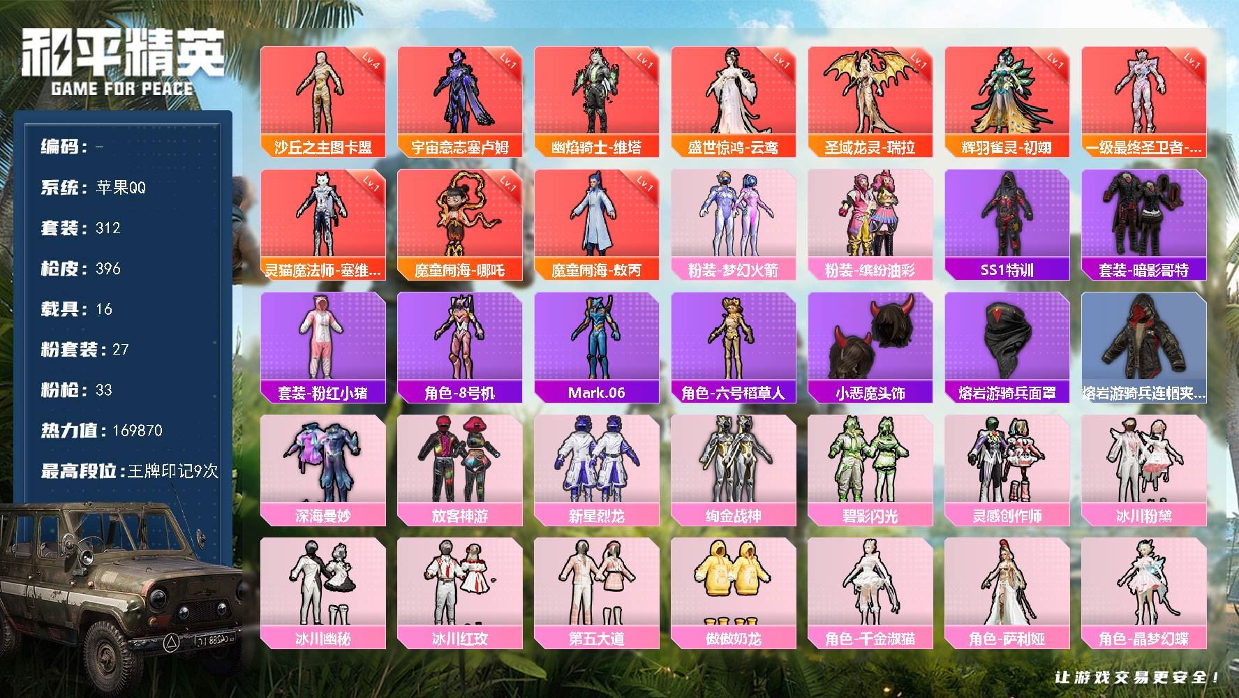 【游戏多多】 苹果 手Q 10神装 27粉装 33特效枪 16载具 23粉色飞行器 169870热力值 9王牌印记 312套装 396枪皮【红色神装等级】:魔童闹海-敖丙(一级),魔童闹海-哪吒(一级),灵猫魔法师-塞维尔(一级),最终圣卫者-帕修斯(一级),辉羽雀灵-初翊(一级),圣域龙灵-瑞拉(一级),盛世惊鸿-云鸾(一级),幽焰骑士-维塔(一级),宇宙意志-塞卢姆(一级),沙丘之主-图卡盟(四级)【粉色套装】:深海曼妙,梦幻火箭,缤纷油彩,放客神游,新星烈龙,绚金战神,碧影闪光,灵感创作师,冰川粉黛,冰川幽秘,冰川红玫,第五大道,傲傲奶龙,千金淑猫,萨利娅,晶梦幻蝶,翎光蝶翼,圣辉之星,天马座 星矢,智慧纱织,星穹咏叹调,狂魅哈莉,狂魇小丑,冷漠罗丽,绯月迷踪,罗征,异瞳寒姬【粉色枪皮等级】:AKM-幽焰骑士(三级),M16A4-晶梦幻蝶(一级),SCAR-L-金蛇镇世(二级),SCAR-L-魔童闹海 哪吒(三级),M416-心之恋语(四级),M416-墨龙九天(三级),M416-灵猫魔法师(六级),GROZA-镜光银凌(五级),GROZA-圣辉之星(二级),AUG-星梦奇缘(三级),AUG-暖羊咩咩(五级),Vector-最终圣卫者(三级),汤姆逊-热量炸弹(五级),野牛-绯月迷踪(二级),P90-沙丘之主(二级),P90-魔童闹海 敖丙(三级),Kar98K-巳巳如意(五级),Kar98K-圣域龙灵(三级),M24-镜域双华(三级),AWM-湮灭星辰(四级),Mk14-盛世惊鸿(三级),Mk14-甜梦熊击(五级),AMR-鸢尾晶梦(四级),M200-伏羲圣卦(四级),DP-28-千金淑猫(四级),DP-28-豹影疾电(五级),MG3-酷泡奶龙(一级),MG3-辉羽雀灵(三级),MG-36-沧焰双生(五级),镰刀-幽影之判(三级)【粉色载具】:宾利欧陆GT敞篷(火焰橘),宝马M4(圣保罗黄),宝马X6 M(曼岛绿),迈凯伦塞纳(冷萃蓝),冰辰御座(神秘蓝),虚妄之影(炫耀紫),疾风龙骑,最终圣卫者摩托车,踏焰逐风摩托车,僚机-圣域龙宝,星梦玉骢,护世瑞兽,晶梦灵驹,黑曜夜骑,冰绡玉鳞,辉羽雀灵自行车【粉色飞行器】:镜域双华-灵镜之阶,梦幻火箭飞行器,沙丘之主天马,星夜魔法师飞行翼,酣梦熊熊飞行器,镜光幻境飞行翼,龙翔九天飞行器,深渊漩涡飞行器,幽焰列车飞行器,凤舞九天飞行器,万象金身飞行器,赛博古神飞行器,星月云朵飞行器,圣域金龙飞行器,雀灵庇佑飞行器,终晖之翼飞行器,宁雨蝶飞行器,灵猫魔法师飞行器,飞天猪飞行器,灵珠游龙飞行器【粉色降落伞】:碧影闪光降落伞,冰川粉黛降落伞,繁花小夜曲降落伞,环太平洋降落伞,精灵迷巫降落伞,橘柚倾心降落伞,镜域双华降落伞,灵感创作师降落伞,梦幻火箭降落伞,沙丘之主降落伞,雪国幻梦降落伞,夏日绵绵冰降落伞,绝对恒星降落伞,墨龙九天降落伞,创世·救赎降落伞,星梦奇缘降落伞,金丰海韵降落伞,幽焰骑士降落伞,千金淑猫降落伞,月影灵韵降落伞,盛世惊鸿降落伞,金蛇镇世降落伞,鬼刀降落伞,晶梦幻蝶降落伞,彩虹独角兽降落伞,月下星之子降落伞,樱桃泡泡降落伞,翎光蝶翼降落伞,圣域龙灵降落伞,圣辉之星降落伞【稀有套装】:炽纹蛇影,航行童话,巳巳如意,圣穹绘梦,小鸟芋圆,乐游熊熊,兰香蝶语,暖暖向日葵,荒原牛仔,云鹰凌岚,雪国风尚,雏菊兔兔,萝兰蝴蝶,小熊娃娃,糖糖葫芦,青团波波,棉花软糖,都市丽猫,摩登魅猫,燕燕于飞,鱼渊荷华,海琴烟,晶灵使者,晶辉守护,旋风灵鼠,蜜桃派对,琉璃花蕾,冰晶湖光,雪夜云雾,晨曦轻云【稀有枪皮】:AKM-冰凉西瓜,AKM-影袭,AKM-春暖花开,AKM-灼热熔岩,AKM-破晓战魂,AKM-虎虎生威,AKM-霓虹街区,AKM-龙的传人,AUG-PEC最牛战神,AUG-冰川粉黛,AUG-凝视深渊,AUG-幻影战神,AUG-耀粉歌者,AC-VAL-灵感创作师,AWM-不夜海上花,AMR-白勺歌姬,DBS-第五大道,DP-28-原初圣火,DP-28-未来战士,DP-28-清新柠檬,DP-28-荒漠赏金,大砍刀-粉色回忆,Famas-镜域双华,GROZA-影袭,GROZA-恐龙拽拽,GROZA-春暖花开,GROZA-生命誓言,GROZA-雷霆特警,GROZA-马卡龙,GROZA-黑色刀锋【稀有头盔】:银河战甲头盔(1级),梦幻火箭头盔(1级),金风玉露头盔(2级),甜蜜誓约头盔(3级)【稀有背包】:九霄背包(2级),精灵迷巫背包(2级),梦幻火箭背包(3级),梦幻火箭背包(2级),梦幻火箭背包(1级),幻影战神背包(2级),幻影战神背包(1级),神秘黑猫背包(3级),古堡领主背包(2级),古堡领主背包(1级),金羽特工背包(3级),甜蜜誓约背包(3级),甜蜜誓约背包(1级),心之恋语背包(3级),心之恋语背包(2级),心之恋语背包(1级),马卡龙背包(2级),花间之火背包(2级),夏日绵绵冰背包(2级)【截图或标题展示段位不代表实际段位,赛季更新等不可抗拒因素发生变化、时限道具不保证所剩时间、标题未写送点卷默认不送】