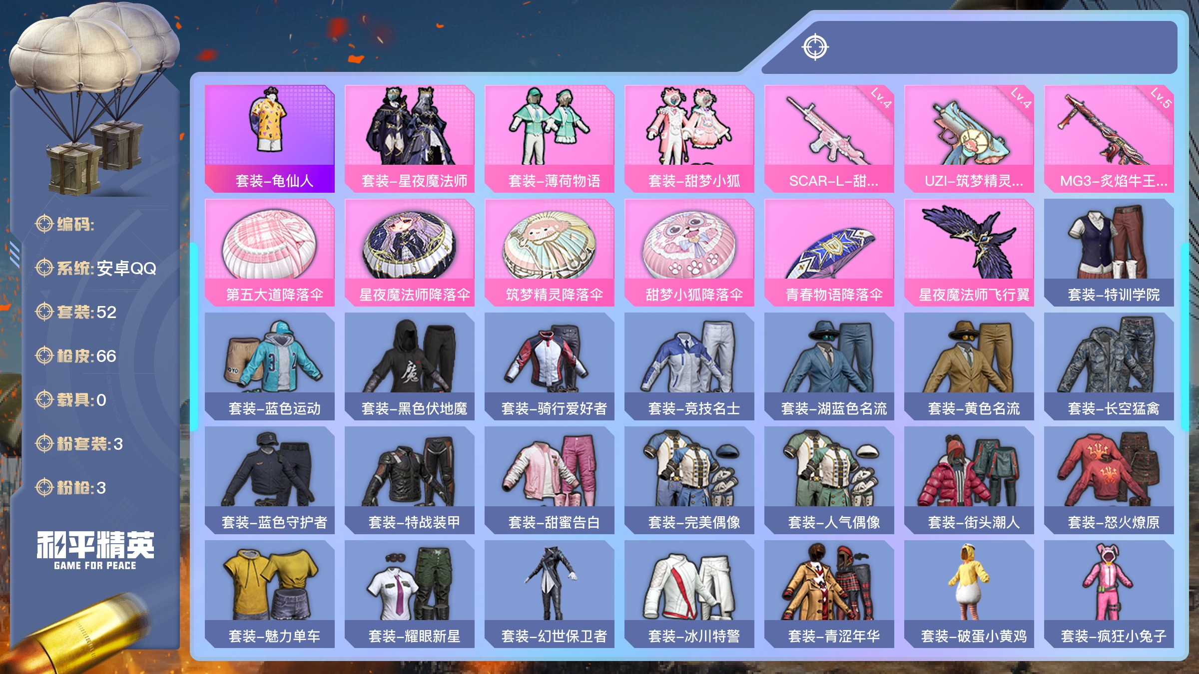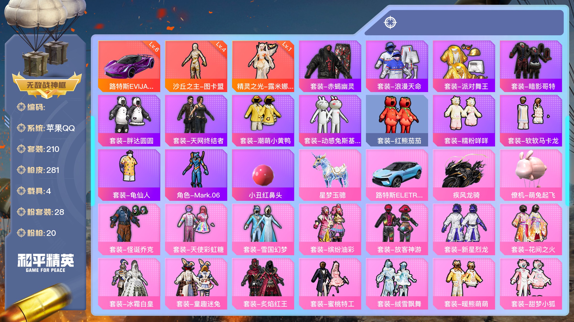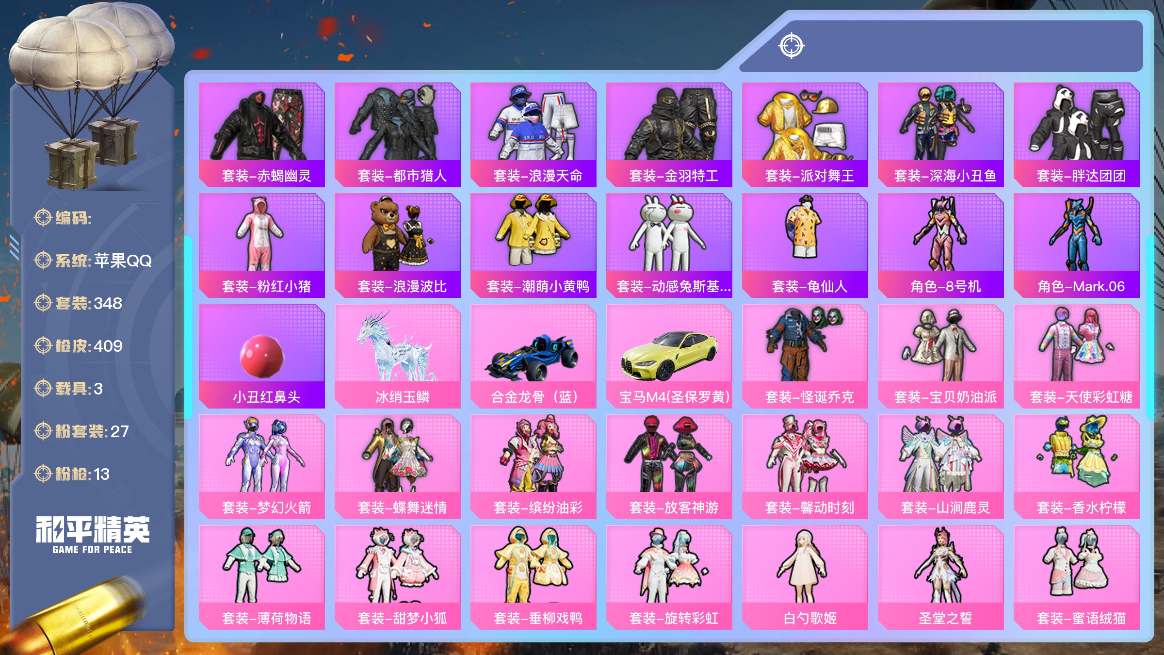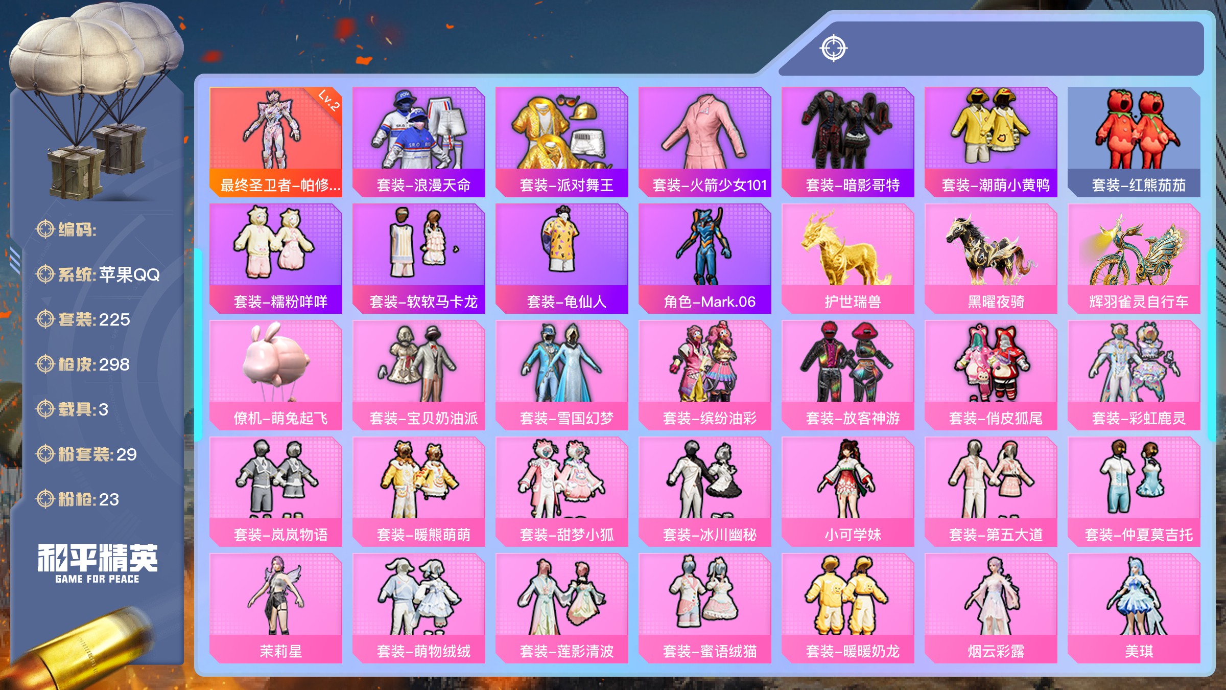 【游戏多多】 【可包人脸】ljh ak002953 苹果q 【套装229 呛皮287 载具1 降落伞101】 【粉装 冰川红玫 旋转彩虹 彩虹甜喵 甜梦小狐 蜜语绒猫 圣堂之誓 敖傲奶龙 未来歌姬 严莉莉 电波星 美雪 美琪 守护天翼 白勺歌姬 呆萌星弥 小可学妹 暖熊萌萌 洛天依 星空之魅 放客神游 旋转彩虹 彩虹甜喵 甜梦小狐 橘柚倾心 海盐物语 精灵娃娃 酣梦娃娃 山涧鹿灵 炙焰红王 极致幻想 独舞天鹅 缤纷油彩 蝶舞迷情 天使彩虹糖 宝贝奶油派】 【呛皮 m416-心之恋语(7级 m416-电玩时刻(5级 akm-炫紫旋律(5级 scar-l-童趣迷兔(6级 groza-巴啦啦小魔仙(5级 groza-旋转彩虹(5级】 【载具 合金龙骨(蓝)】 ----【截图展示段位不代表实际段位,如赛季更 新等不可抗拒因素发生变化、时限道具不保证所剩时间、标题未写送点卷默认不送】买号找【左友】永久包赔