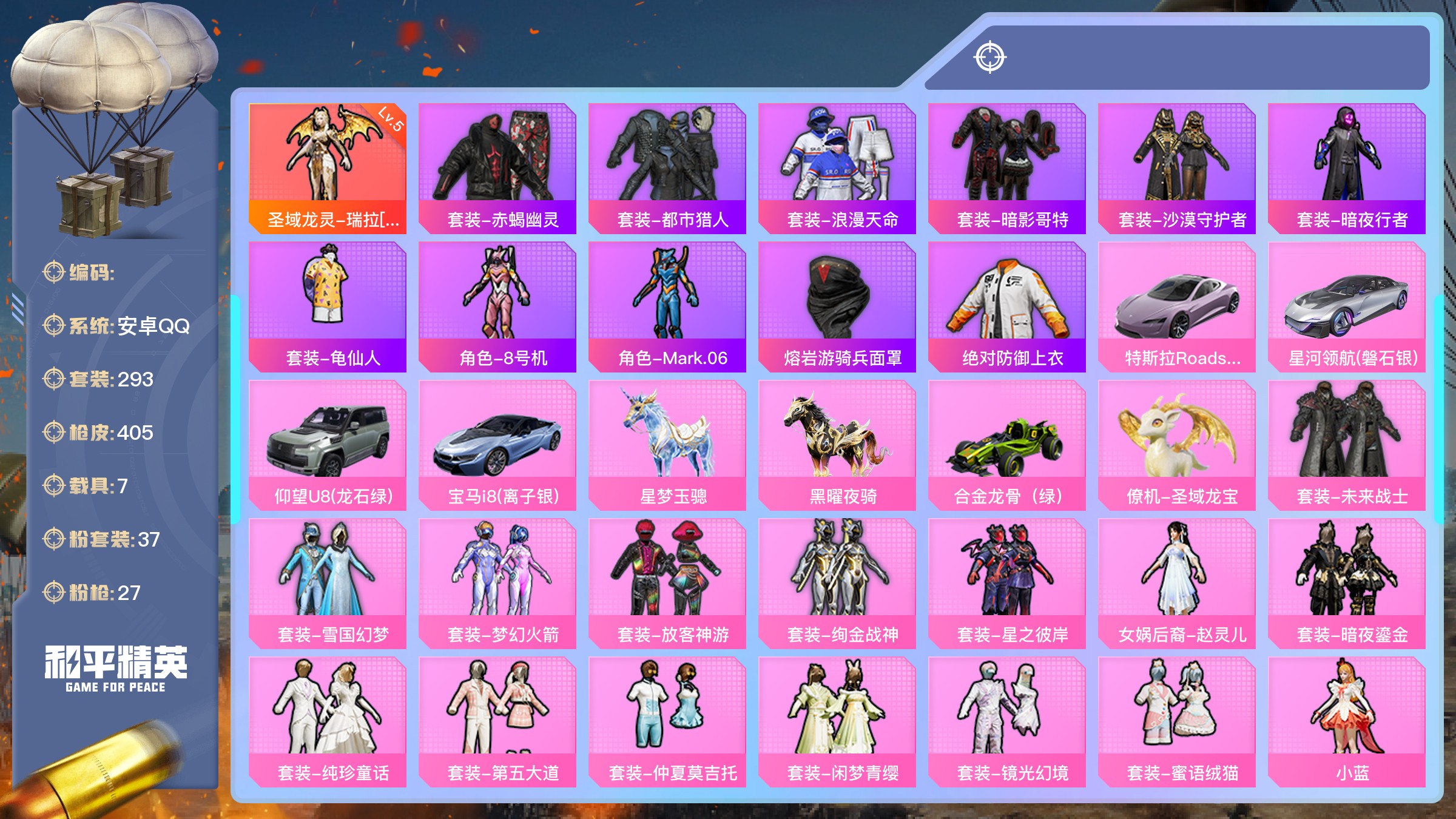 【游戏多多】 【可二次实名】三色螳螂!塞卢姆!梦幻火箭!浪漫波比!小丑鱼!九级至情至圣!照夜玉狮子!7.5w热力值!D10780.iOSQQ.1神装-32粉装-9粉枪-4载具-5珍稀飞行器-182套装-187枪皮 稀有资产】宇宙意志-塞卢姆[1级]/角色-2号机款机体服/角色-初号机款机体服/角色-零号机款机体服/套装-雪国幻梦/角色-明日香款战斗服/角色-零款战斗服/角色-真理款战斗服/角色-薰款战斗服/角色-真嗣款战斗服/套装-奇异狩猎者/套装-胖达圆圆/套装-浪漫天命/套装-雪山精英/套装-暗影哥特/套装-龟仙人/套装-迅捷狂鲨/套装-浪漫波比/套装-兔兔白日梦/玩偶服-卖崽青蛙/角色-2B战斗服款/套装-狂沙舞者/角色-白光莹/套装-西部牛仔/大砍刀-青龙偃月刀/撬棍-龙胆亮银枪 【粉色套装】套装-梦幻火箭/套装-蝶舞迷情/套装-智能音符/套装-放客神游/套装-新星烈龙/套装-天衡星秤/套装-牧神之羯/套装-盖世英雄/套装-绚丽摇曳/套装-闪耀律动/套装-海盐物语/套装-绒雪飘舞/套装-傲雪凌霜/套装-霁雪冰心/套装-灵感创作师/套装-启明星/套装-第五大道/角色-阿尔茜/角色-蔷薇星/角色-茉莉星/角色-星云暗核/套装-莲影清波/套装-镜光幻境/角色-冰炎战车/角色-圣堂之誓/角色-小叽联名款/套装-憨憨奶龙/套装-金丰海韵 【粉色枪皮】M416-心之恋语[2级]/AKM-绿萝繁花[4级]/SCAR-L-青春物语[4级]/M416-至情至圣[9级]/M24-莲影清波[4级]/UMP45-宇宙意志[3级]/P90-能量风暴[4级]/DP-28-圣堂之誓[3级]/破片手榴弹-秋玉花灯[5级] 【载具】合金龙骨(蓝)/路特斯ELETRE(花绽灰)/宾利飞驰(布罗德盖棕双色)/照夜玉狮子