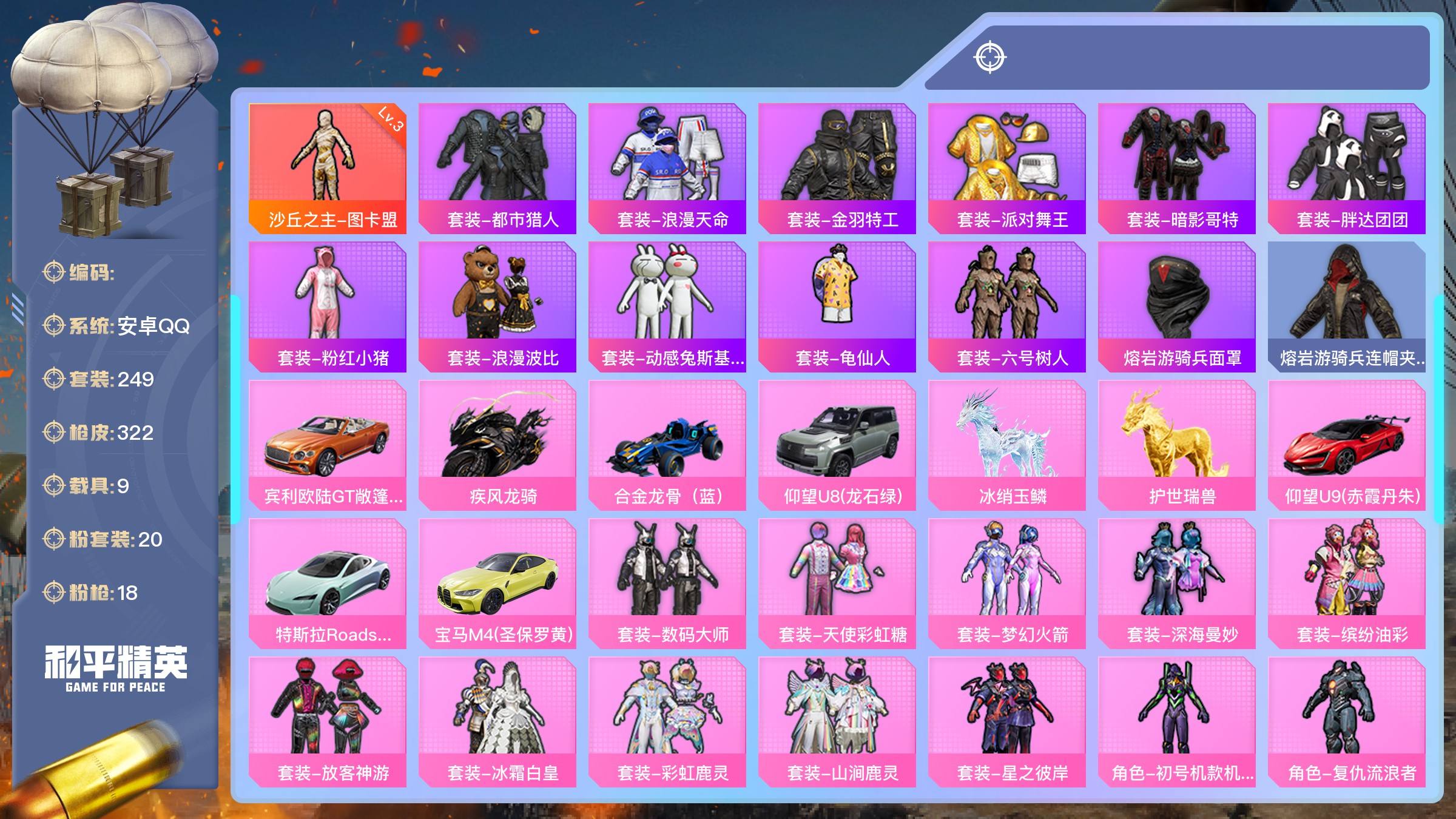 【游戏多多】 【可二次实名】【037mnec2b】热力值:129914,20粉装,18粉呛,9载具,45粉色战备,249套装,322呛械,436装备,21滑翔尾翼,126降落伞;等级:lv.72 历史最高段位:卓越王牌12星 当前段位:不朽.星钻ⅳ;王牌印记15次 卓越印记1次; 【热门套装】:沙丘之主-图卡盟[3级],套装-都市猎人,套装-浪漫天命,套装-金羽特工,套装-派对舞王,套装-暗影哥特,套装-胖达团团,套装-粉红小猪,套装-浪漫波比,套装-动感兔斯基人偶服,套装-龟仙人,套装-六号树人,熔岩游骑兵面罩,熔岩游骑兵连帽夹克;【红色套装】:沙丘之主-图卡盟[3级];【粉色套装】:粉装-数码大师,粉装-天使彩虹糖,粉装-梦幻火箭,粉装-深海曼妙,粉装-缤纷油彩,粉装-放客神游,粉装-冰霜白皇,粉装-彩虹鹿灵,粉装-山涧鹿灵,粉装-星之彼岸,角色-初号机款机体服,角色-复仇流浪者,粉装-千面幻镜,粉装-紫电风暴,粉装-碧穹智者,粉装-音爆索尼克,角色-光极星,粉装-创世救赎,角色-智耀战神;【粉色呛械】:akm-甜心宝贝[7级],akm-梦之光华[1级],groza-玉面桃花[7级],m416-灵猫魔法师[9级],m416-风花雪月[1级],m416-至情至圣[5级],scar-l-天蓬元帅[6级],scar-l-彩装战姬[1级],aug-超新星[5级],aug-星之彼岸[1级],kar98k-巳巳如意[5级],m24-镜域双华[2级],p90-沙丘之主[3级],ump45-相思残雪[7级],mg3-洛神天依[4级],dp-28-豹影疾电[5级],平底锅-林间仙鹿[6级],破片手留单-美味星星糖[6级];【粉色载具】:宾利欧陆gt敞篷(火焰橘),疾风龙骑,合金龙骨(蓝),仰望u8(龙石绿),冰绡玉鳞,护世瑞兽,仰望u9(赤霞丹朱),特斯拉roadster(水滴蓝),宝马m4(圣保罗黄);【粉色滑翔尾翼】:万象金身飞行器,镜域双华-灵镜之阶,梦幻火箭飞行器,超新星飞行器[1级],沙丘之主天马[1级],深渊漩涡飞行器,龙翔九天飞行器[1级],灵珠游龙飞行器,星之彼岸飞行器,酣梦熊熊飞行器,灵猫魔法师飞行器,祥瑞起舞飞行器,齐天大圣飞行器;【粉色降落伞】:童趣迷兔降落伞,林间仙鹿降落伞,鬼刀降落伞,葫芦兄弟降落伞,宁雨蝶降落伞,洛神天依降落伞,百万伏特降落伞,沙丘之主降落伞,海渊国主降落伞,镜光幻境降落伞,墨龙九天降落伞,深海曼妙降落伞,星之彼岸降落伞,金丰海韵降落伞,风花雪月降落伞,创世救赎降落伞,圣堂之誓降落伞,宇宙意志降落伞,千面幻镜降落伞,无垠阁降落伞,梦幻火箭降落伞,暗夜玫瑰降落伞,彩装战姬降落伞,灵猫魔法师降落伞,镜域双华降落伞,绮梦流光降落伞,辉羽雀灵降落伞,江南烟雨降落伞,幻影飞狐降落伞,金蛇镇世降落伞,相思残雪降落伞,幻彩电音降落伞;【其他套装】:套装-特训学院,套装-蓝色运动,套装-黄色伏地魔,套装-白色伏地魔,套装-黑色伏地魔,套装-骑行爱好者,套装-冰川格斗者,套装-深海格斗者,套装-竞技名士,套装-深蓝色名流,套装-湖蓝色名流,套装-黄色名流,套装-猛禽,套装-长空猛禽,套装-漫步者,套装-霸义无双,套装-黎明保卫者,套装-雨林探路者,套装-沙漠探路者,套装-旭日情侣,套装-冷焰舞者,套装-刚毅裁决者,套装-特战装甲,套装-贵族骑装,套装-青春校园,套装-活力之心,套装-甜蜜告白,套装-春日漫步,套装-潮流先锋,套装-龙腾端午,套装-燃烧卡路里,套装-滨海假日,套装-鹰眼刺客,套装-冰冻风暴,套装-幻影武者,套装-街头潮人,套装-暗金炫舞,套装-蓝彩潮人,套装-千禧之恋,套装-怒火燎原,套装-魅力单车,套装-绮丽涂鸦,套装-耀眼新星,套装-坚韧舞者,套装-竞技达人朋克,套装-野性战心,套装-野性战魂,套装-狂沙舞者,套装-森林游猎者,套装-荣耀,套装-热血青春,套装-雪山精英,套装-酷潮明星,套装-极地朋克,套装-幻世战舞者,套装-甜蜜菠萝,套装-血色贵族,套装-迅捷狂鲨,套装-夏日倾情,套装-甜蜜熊情侣,套装-青涩时光,套装-缤纷果语,套装-滨海厨神,套装-alanwalker,套装-龙魂突击队,套装-格斗先锋,套装-冷血极客,套装-wifi精灵,套装-麻辣教官,套装-梦魇先生,套装-万圣娃娃,套装-爱崽白熊,套装-金鼠迎春,套装-黑色刀锋,套装-精神漫游,套装-银河圣歌,套装-鹤鸣,套装-霓虹街区,套装-纯白誓言,套装-激萌罗小黑,套装-白熊同盟,套装-萌黄之夏,套装-人鱼之吻,套装-夏日音浪,套装-探宝勇士,套装-牛气满满,套装-青春冒险家,套装-潮流游乐家,套装-萌趣颜团子,套装-特种颜团子,套装-战术大师,套装-牛气冲天,套装-ss18特训,套装-治愈之星,套装-科技之星,套装-飞行日记,套装-曼妙人鱼,套装-热情海星,套装-纯真浪花,套装-闪银刀客,套装-ss14特训,套装-天籁歌者,套装-电音精灵,套装-吉莉礼服,角色-明日香款战斗服,角色-薰款战斗服,套装-微雨春柳,套装-快乐星愿,套装-星梦畅游,套装-鹤发童颜,套装-ss15特训,套装-ss16特训,套装-暴风机械师,套装-时空追击者,套装-星辰守护者,套装-暗夜魅影,套装-暗夜傀儡,套装-ss17特训,套装-瑞龙福将,套装-团圆交子,套装-焰山流火,套装-冰爽风暴,套装-福星高照,套装-虎虎生威吉莉,套装-空投萌叽,套装-ss19特训,套装-炫蓝之夏,套装-ss20特训,套装-粉团憨憨,套装-ss21特训,套装-萌趣咩咩,套装-娇憨猪猪,套装-荷畔雨呱,套装-俏皮奶喵,套装-玉兔迎春,套装-ss22特训,套装-和煦暖阳,套装-田园牧歌,套装-轻风白浪,套装-星夜迷魅,套装-熠彩粉晶,套装-光之冒险,套装-绯格组合,套装-ss23特训,套装-莱茵河畔,套装-神气柴柴,套装-懵萌河马,套装-灵蜜圈圈,套装-妙红点点,套装-幻彩翩翩,套装-王牌教练,套装-柠萌假日,套装-青玉碎影,套装-ss24特训,套装-源星混沌,角色-短笛,套装-涂山之