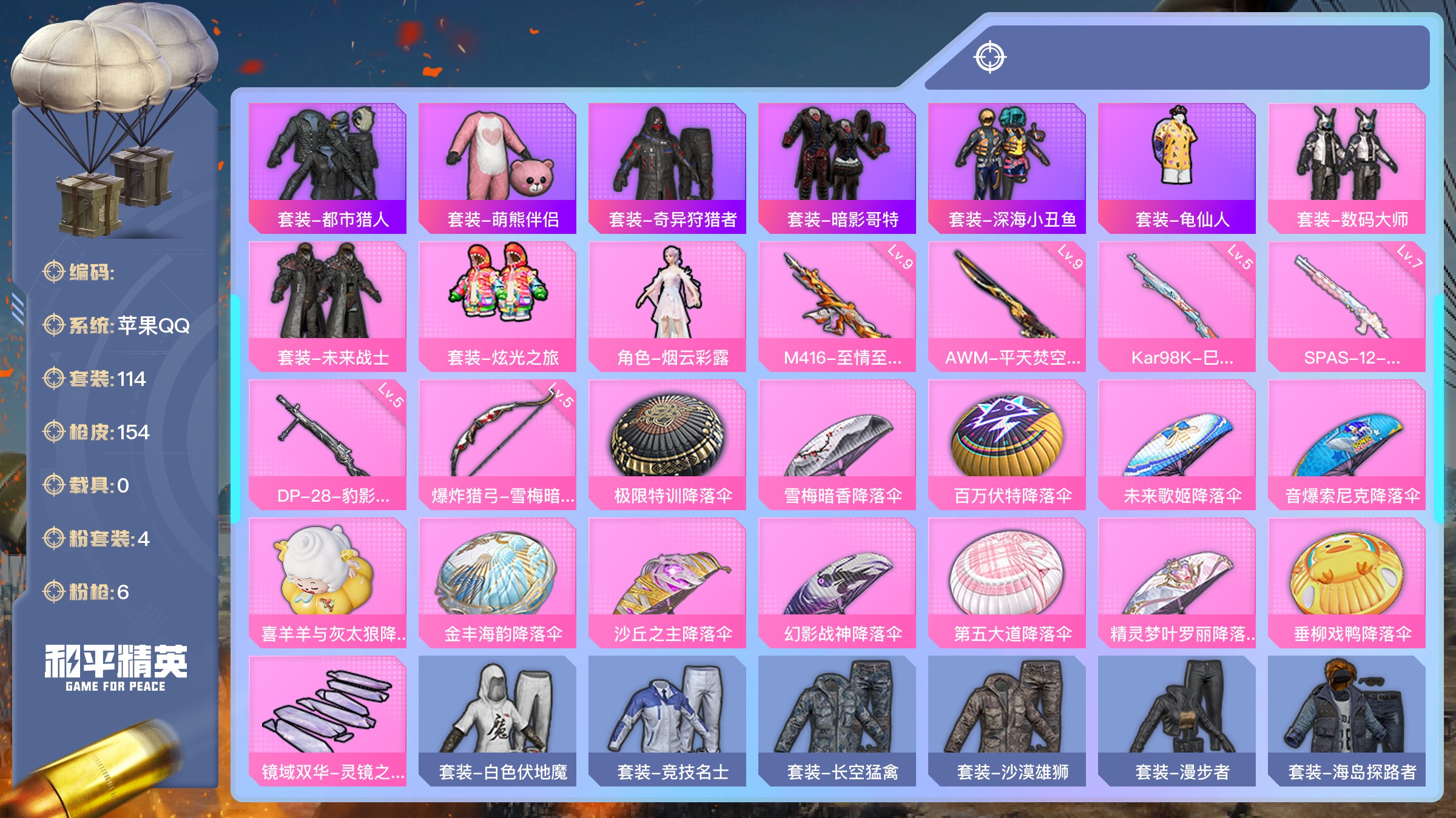 【游戏多多】 【06qoiaeca】热力值:51140,4粉装,6粉呛,13粉色战备,114套装,154呛械,192装备,2滑翔尾翼,61降落伞;等级:lv.59 历史最高段位:超级王牌13星 当前段位:不朽.星钻ⅳ;王牌印记11次 卓越印记2次 传奇印记1次; 【热门套装】:套装-都市猎人,套装-萌熊伴侣,套装-奇异狩猎者,套装-暗影哥特,套装-深海小丑鱼,套装-龟仙人;【粉色套装】:粉装-数码大师,粉装-未来战士,粉装-炫光之旅,角色-烟云彩露;【粉色呛械】:m416-至情至圣[9级],awm-平天焚空[9级],kar98k-巳巳如意[5级],spas-12-蜜语绒猫[7级],dp-28-豹影疾电[5级],爆炸猎弓-雪梅暗香[5级];【粉色滑翔尾翼】:镜域双华-灵镜之阶;【粉色降落伞】:极限特训降落伞,雪梅暗香降落伞,百万伏特降落伞,未来歌姬降落伞,音爆索尼克降落伞,喜羊羊与灰太狼降落伞,金丰海韵降落伞,沙丘之主降落伞,幻影战神降落伞,第五大道降落伞,精灵梦叶罗丽降落伞,垂柳戏鸭降落伞;【其他套装】:套装-白色伏地魔,套装-竞技名士,套装-长空猛禽,套装-沙漠雄狮,套装-漫步者,套装-海岛探路者,套装-水银刺客,套装-贵族骑装,套装-特殊使命,套装-春日漫步,套装-鹰眼刺客,套装-冰冻风暴,套装-冷酷挑战者,套装-摇滚舞王,套装-耀眼新星,套装-坚韧舞者,套装-野性战心,套装-荣耀,套装-热血青春,套装-蓝调潮人,套装-迅捷狂鲨,套装-呆萌铁蟹,套装-青涩时光,套装-缤纷果语,套装-龙魂突击队,套装-幻影公爵,套装-冷血极客,套装-破蛋小黄鸡,套装-疯狂小兔子,套装-淡雅花蕊,套装-银河圣歌,套装-鹤鸣,套装-萌黄之夏,套装-牛气满满,套装-战术大师,套装-飞行日记,套装-热情海星,套装-纯真浪花,套装-ss21特训,套装-玉兔迎春,套装-ss22特训,套装-和煦暖阳,套装-田园牧歌,套装-轻风白浪,套装-光之冒险,套装-绯格组合,套装-ss23特训,套装-摩登艾咪,套装-莱茵河畔,套装-甜梦熊熊,套装-神气柴柴,套装-懵萌河马,套装-灵蜜圈圈,套装-妙红点点,套装-幻彩翩翩,套装-竹华凝韵,套装-王牌教练,套装-柠萌假日,套装-青玉碎影,套装-ss24特训,套装-涂山之恋,套装-ss25特训,套装-金戈铁马,套装-惊鸿侠骨,套装-锦衣飞扬,套装-香桃花海,套装-深海梦境,套装-摩登王国,套装-龙的传人,套装-冰河战士,套装-ss26特训,套装-快闪甜心,套装-春光漫游,套装-贝斯之夜,套装-焰鹰斗篷,套装-幽夜迷踪,套装-幻羽潜行,套装-ss27特训,套装-恋语绒绒,套装-老实芭蕉,套装-ss28特训,角色-情公主,套装-海盐绵绵冰,套装-创世追猎,套装-ss29特训,套装-雏菊兔兔,套装-萝兰蝴蝶,套装-异域银装,角色-蜜桃派对,套装-星途旅人,套装-ss30特训,套装-ss31特训,套装-智谋强哥,套装-ss33特训,套装-巳巳如意,套装-ss32特训,套装-大橘大利,套装-元气之梦,套装-ss34特训,套装-擎苍青焰,套装-朱霞炽焰,角色-申公豹,套装-凌霄紫焰,套装-薄荷星砂;其他呛械:qbz-未来歌姬,qbz-纯真浪花,mk47-妙红点点,mk47-百万伏特,mk47-洛神天依,mk47-乌木金纹,m416-绿野极光,m416-糯团青竹,m762-萌物绒绒,m762-天降萌叽,m762-暗夜鎏金,m762-雏菊兔兔,m762-第五大道,m16a4-冰河战士,aug-闲梦青缨,aug-异域银装,aug-2p战斗服款,aug-幻影战神,aug-天降萌叽,aug-紫晶流影,akm-龙的传人,akm-涂鸦街区,akm-影袭,akm-百万伏特,akm-星之彼岸,scar-l-海盐豹豹,scar-l-彩虹符号,scar-l-玉兔迎春,scar-l-星途旅人,ac-val-乌木金纹,ac-val-天降萌叽,ac-val-快闪甜心,arx-凌霄紫焰,groza-田园牧歌,groza-影袭,groza-懵萌河马,蜜獾-乌木金纹,蜜獾-天降萌叽,蜜獾-垂柳戏鸭,g36c-懵萌河马,awm-纯真浪花,awm-焰鹰斗篷,莫辛纳甘-蜜语绒猫,莫辛纳甘-银碳小老虎,莫辛纳甘-乌木金纹,莫辛纳甘-懵萌河马,amr-鸡智如我,amr-妙红点点,amr-喜羊羊与灰太狼,amr-乌木金纹,kar98k-影袭,kar98k-幻影战神,kar98k-彩虹符号,kar98k-顶峰精英,m200-惊鸿侠骨,m200-乌木金纹,m24-影袭,mk20-h-星途旅人,mk20-h-乌木金纹,mk20-h-快闪甜心,vss-香桃花海,vss-彩虹符号,vss-田园牧歌,mini14-涂山之恋,mini14-香桃花海,mini14-雏菊兔兔,mini14-金玉无双,sks-金玉无双,mk14-冰河战士,m417-惊鸿侠骨,slr-彩虹符号,uzi-天降萌叽,uzi-金玉无双,uzi-幻影战神,uzi-影袭,uzi-冰河战士,uzi-幽秘魅影,汤姆逊-纯真浪花,汤姆逊-炫彩节奏,汤姆逊-天降萌叽,汤姆逊-幻影战神,p90-快闪甜心,p90-乌木金纹,p90-玩趣呆呆,vect-生命誓言,vect-金玉无双,vect-焰鹰斗篷,vect-田园牧歌,js9-凌霄紫焰,ump45-金玉无双,ump45-海盐豹豹,ump45-涂山之恋,aks-74u-乌木金纹,mp5k-乌木金纹,野牛-雏菊兔兔,野牛-沙丘之主,dbs-焰鹰斗篷,dbs-乌木金纹,s12k-智耀战神,s12k-霓彩脉冲,s12k-垂柳戏鸭,s12k-玩趣呆呆,s12k-幻影战神,spas-12-乌木金纹,spas-12-田园牧歌,s1897-精灵梦叶罗丽,s1897-百万伏特,s1897-糯团青竹,aa12-g-纯真浪花,mg3-乌木金纹,mg3-幻世战舞者,mg3-妙红点点,mg3-惊鸿侠骨,pkm-啾咪啾咪,pkm-懵萌河马,m249-妙红点点,m249-百万伏特,m249-沙丘之主,m249-糯团青竹,dp-28-甜蜜旋律,dp-28-焰鹰斗篷,dp-28-彩虹符号,mg-36-凌霄紫焰,p92-凌霄紫焰,r1895-雏菊兔兔,沙墨之鹦-快闪甜心,短管霰弹-星穹咏叹调,p18c-百万伏特,平底锅-快闪甜心,平底锅-惊鸿侠骨,平底锅-凌霄紫焰,平底锅-雏菊兔兔,平底锅-纯真浪花,平底锅-飞行日记,平底锅-焰鹰斗篷,平底锅-光之冒险,平底锅-田园牧歌,平底锅-空岛之星,平底锅-妙红点点,平底锅-懵萌河马,平底锅-无垠阁,大砍刀-雪梅暗香,撬棍-沙丘之主权杖,十子怒-异域银装,破片手留单-呆爆全场,破片手留单-海盐豹豹,破片手留单-星途旅人,爆炸猎弓-惊鸿侠