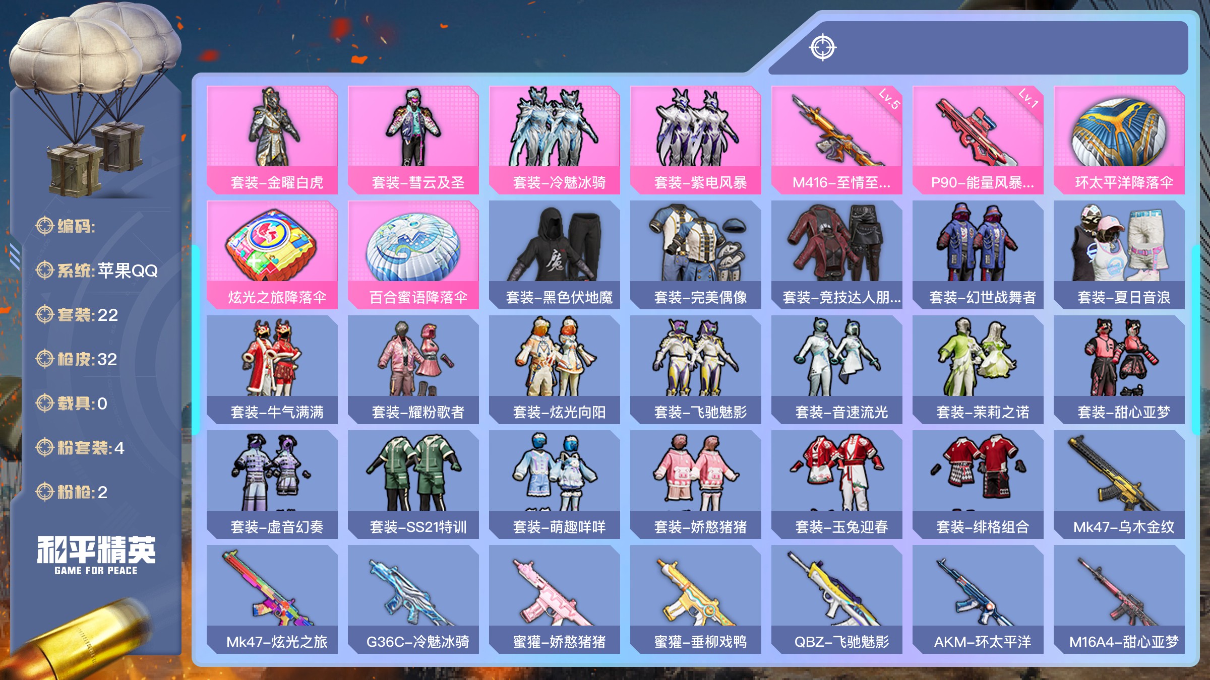 【游戏多多】 【可二次实名】【06qoidhec】热力值:10463,4粉装,2粉呛,3粉色战备,22套装,32呛械,21装备,11降落伞;等级:lv.32 历史最高段位:坚韧铂金ⅳ 当前段位:英勇.黄金ⅲ;; 【粉色套装】:粉装-金曜白虎,粉装-彗云及圣,粉装-冷魅冰骑,粉装-紫电风暴;【粉色呛械】:m416-至情至圣[5级],p90-能量风暴[1级];【粉色降落伞】:环太平洋降落伞,炫光之旅降落伞,百合蜜语降落伞;【其他套装】:套装-黑色伏地魔,套装-完美偶像,套装-竞技达人朋克,套装-幻世战舞者,套装-夏日音浪,套装-牛气满满,套装-耀粉歌者,套装-炫光向阳,套装-飞驰魅影,套装-音速流光,套装-茉莉之诺,套装-甜心亚梦,套装-虚音幻奏,套装-ss21特训,套装-萌趣咩咩,套装-娇憨猪猪,套装-玉兔迎春,套装-绯格组合;其他呛械:mk47-乌木金纹,mk47-炫光之旅,g36c-冷魅冰骑,蜜獾-娇憨猪猪,蜜獾-垂柳戏鸭,qbz-飞驰魅影,akm-环太平洋,m16a4-甜心亚梦,m416-蓝色火焰,m416-紫翼圣骑,scar-l-玉兔迎春,ac-val-甜心亚梦,m24-乌木金纹,kar98k-彩虹符号,kar98k-飞驰魅影,kar98k-炫彩节奏,slr-娇憨猪猪,mk14-乌木金纹,p90-飞驰魅影,uzi-娇憨猪猪,s12k-娇憨猪猪,s12k-幻世战舞者,dbs-甜心亚梦,s1897-飞驰魅影,s1897-炫彩节奏,m249-冷魅冰骑,dp-28-甜心亚梦,平底锅-飞驰魅影,平底锅-娇憨猪猪,平底锅-甜心亚梦;【其他降落伞】:普通降落伞,幻世战舞者降落伞,娇憨猪猪降落伞,青羽降落伞,化学天才降落伞,飞驰魅影降落伞,紫菱降落伞,甜心亚梦降落伞;【伙伴】:伙伴-盔仔,详情看图【实际信息请以最终验号结果为准】【苹果qq】【可二次实名】【无】