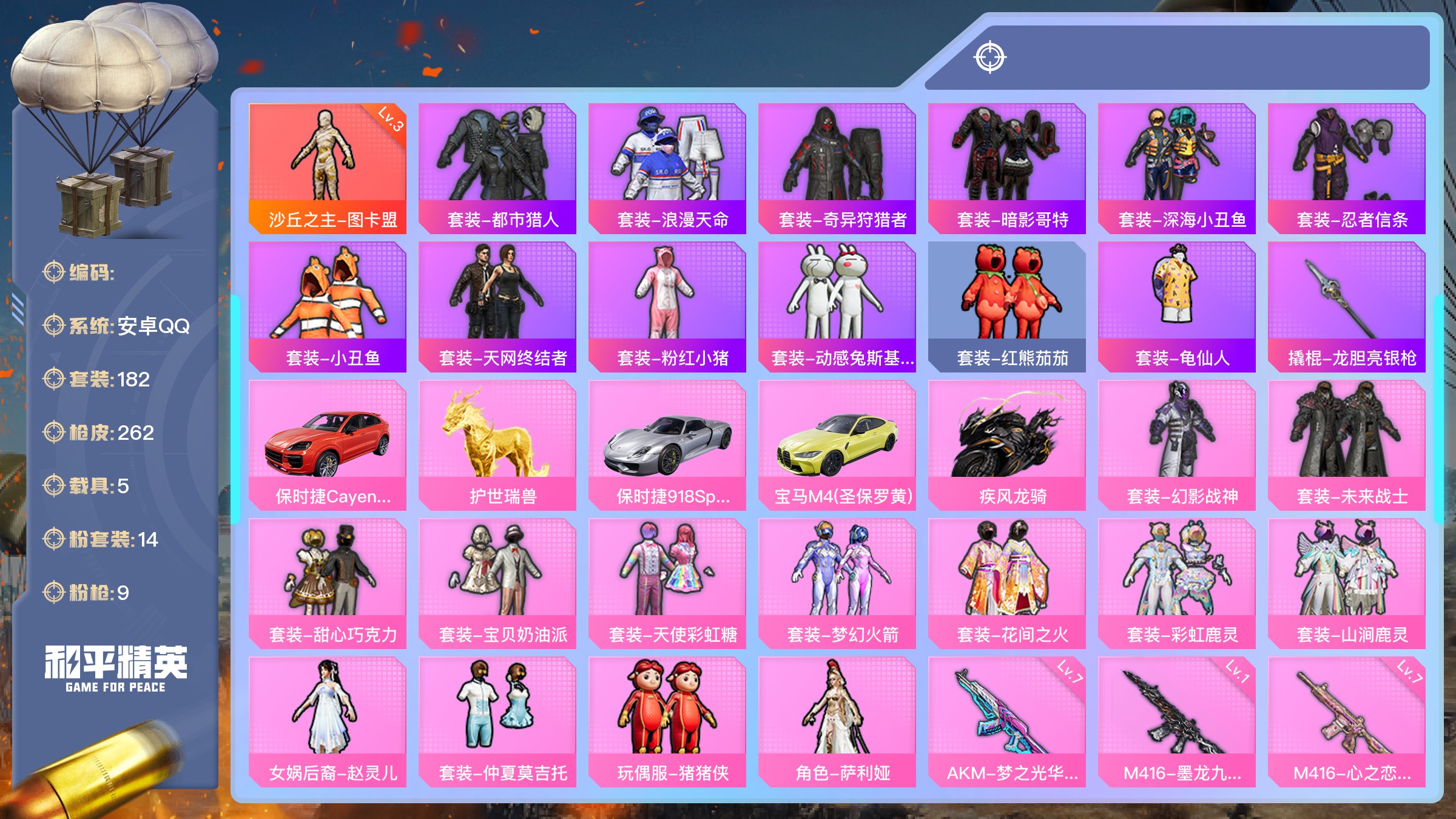 【游戏多多】 【06qoidaca】热力值:91281,11粉装,12粉呛,2载具,23粉色战备,203套装,271呛械,348装备,9滑翔尾翼,79降落伞;等级:lv.66 历史最高段位:超级王牌12星 当前段位:荣耀.皇冠ⅴ;王牌印记10次 卓越印记4次 传奇印记1次; 【热门套装】:套装-赤蝎幽灵,套装-都市猎人,套装-浪漫天命,套装-奇异狩猎者,套装-暗影哥特,套装-深海小丑鱼,套装-小丑鱼,角色-mark.06;【粉色套装】:粉装-未来战士,粉装-甜心巧克力,粉装-天使彩虹糖,粉装-梦幻火箭,粉装-王牌四分卫,粉装-放客神游,粉装-天禅智恒,粉装-炙焰红王,粉装-雪月幻音,角色-冷漠罗丽,角色-荧海星豚;【粉色呛械】:scar-l-魔童闹海哪吒[3级],蜜獾-荧海星豚[5级],akm-梦之光华[4级],m416-超新星[9级],m416-女娲灵识[3级],m416-心之恋语[1级],kar98k-巳巳如意[5级],aks-74u-星穹咏叹调[7级],p90-冷漠罗丽[5级],dp-28-豹影疾电[5级],mg-36-沧焰双生[5级],破片手留单-瓶中星球[7级];【粉色载具】:冰绡玉鳞,黑曜夜骑;【粉色滑翔尾翼】:节奏起飞飞行器,梦幻火箭飞行器,齐天大圣飞行器,灵珠游龙飞行器,镜光幻境飞行翼,灵猫魔法师飞行器,御兔特攻飞行器;【粉色降落伞】:甜心宝贝降落伞,未来战士降落伞,葫芦兄弟降落伞,百万伏特降落伞,湮灭星辰降落伞,幻影战神降落伞,灵猫魔法师降落伞,冷漠罗丽降落伞,荧海星豚降落伞,魔童闹海敖丙降落伞,环太平洋降落伞,辉羽雀灵降落伞,神秘黑猫降落伞,喜羊羊与灰太狼降落伞,星穹咏叹调降落伞,梦幻火箭降落伞;【其他套装】:套装-红色运动,套装-黄色运动,套装-蓝色运动,套装-黄色伏地魔,套装-白色伏地魔,套装-黑色伏地魔,套装-骑行爱好者,套装-深海格斗者,套装-竞技名士,套装-湖蓝色名流,套装-黄色名流,套装-猛禽,套装-野性山猫,套装-长空猛禽,套装-漫步者,套装-竞技勇士朋克,套装-黎明保卫者,套装-雨林探路者,套装-沙漠探路者,套装-六六大吉,套装-冷焰舞者,套装-特战装甲,套装-特殊使命,套装-青春校园,套装-灰色格斗者,套装-甜蜜告白,套装-迎春赐吉,套装-龙腾端午,套装-燃烧卡路里,套装-鹰眼刺客,套装-冰冻风暴,套装-冷酷挑战者,套装-幻影武者,套装-热血骑手,套装-特战英豪,套装-红潮炫舞,套装-蓝彩潮人,套装-魅力单车,套装-耀眼新星,套装-竞技达人朋克,套装-夜莺强袭者,套装-都市漫游者,套装-野性战魂,套装-超能勇士,套装-破晓战魂,套装-风行保卫者,套装-热血青春,套装-沙漠兵团,套装-丛林猎人,套装-雪山精英,套装-传奇侦探,套装-极地朋克,套装-幻世战舞者,套装-甜蜜菠萝,套装-蓝调潮人,套装-弄潮海豚,套装-迅捷狂鲨,套装-呆萌铁蟹,套装-夏日倾情,套装-甜蜜熊情侣,套装-青涩时光,套装-缤纷果语,套装-龙魂突击队,套装-风暴特警,套装-冰川特警,套装-海上生明月,套装-麻辣教官,套装-东方飞龙,套装-迷域探索者,套装-军械专家,套装-北国孤狼,套装-ss6特训,套装-跃动心情,套装-ss7特训,套装-霓虹街区,套装-ss10特训,套装-ss8特训,套装-智慧之神,套装-白熊同盟,套装-萌黄之夏,套装-摇滚狂鲨,套装-夏日音浪,套装-ss9特训,套装-顽皮玉兔,套装-探宝勇士,套装-粉甜马卡龙,套装-牛气满满,套装-ss11特训,套装-潮流游乐家,套装-原初圣火,套装-逆风勇士,套装-萌趣颜团子,套装-特种颜团子,套装-战术大师,套装-ss12特训,套装-牛气冲天,套装-闪金天王,套装-镭射皇者,套装-银白舞王,套装-迅捷之星,套装-治愈之星,套装-科技之星,套装-飞行日记,套装-ss13特训,套装-曼妙人鱼,套装-热情海星,套装-纯真浪花,套装-冰爽海盐,套装-ss14特训,套装-星梦畅游,套装-ss15特训,角色-英勇保护者,套装-ss17特训,套装-福星高照,套装-ss19特训,套装-炫蓝之夏,套装-ss20特训,套装-猎梦纪元,套装-甜心亚梦,套装-虚音幻奏,套装-ss21特训,套装-萌趣咩咩,套装-娇憨猪猪,套装-樱桃黑巧,套装-玉兔迎春,套装-ss22特训,套装-轻风白浪,套装-光之冒险,套装-ss23特训,套装-柠萌假日,套装-青玉碎影,套装-冰河战士,套装-恋语绒绒,套装-ss28特训,套装-蝶变,套装-湖畔霞光,套装-小熊娃娃,套装-ss29特训,套装-虚空漩涡,套装-雏菊兔兔,套装-萝兰蝴蝶,角色-紫俏灵猫,套装-异域银装,角色-摩登魅猫,套装-星途旅人,套装-ss30特训,套装-青团波波,套装-棉花软糖,套装-绒绒粉兔,套装-糖糖葫芦,套装-墨青刃影,套装-ss31特训,套装-鱼渊荷华,套装-燕燕于飞,套装-紫幽梦,套装-粉恋花,套装-ss33特训,套装-云朵鹅,套装-ss32特训,套装-彩虹兔,套装-樱梦幻音,套装-蓝冰羽,套装-顶瓜瓜,套装-雪绒豹,套装-大橘大利,角色-时希公主,角色-灵公主,角色-鲛海歌灵,套装-星渊小夜曲,套装-蜜露汐语,套装-星影赞美诗,角色-乐音,玩偶服-懒羊羊,玩偶服-喜羊羊,套装-元气之梦,套装-折梦之诗,套装-ss34特训,套装-擎苍青焰,套装-朱霞炽焰,套装-凌霄紫焰,套装-薄荷星砂,套装-ss35特训,套装-午间小调,套装-萌鸡速递;其他呛械:m16a4-乌木金纹,m16a4-幻世战舞者,m16a4-甜心亚梦,m16a4-红色方程式,m16a4-夜灯,m16a4-冰河战士,mk47-湮灭星辰,mk47-百万伏特,mk47-乌木金纹,mk47-风迹短诗,groza-影袭,groza-田园牧歌,groza-海盐豹豹,groza-荧海星豚,groza-生命誓言,groza-乌木金纹,groza-治愈之星,scar-l-炫彩节奏,scar-l-玉兔迎春,scar-l-星途旅人,scar-l-乌木金纹,scar-l-冷漠罗丽,scar-l-夏日绵绵冰,scar-l-未来战士,scar-l-黄金龙骨,arx-凌霄紫焰,蜜獾-风迹短诗,蜜獾-天降萌叽,蜜獾-糖糖葫芦,蜜獾-冰澜龙吟,蜜獾-折梦之诗,蜜獾-娇憨猪猪,蜜獾-乌木金纹