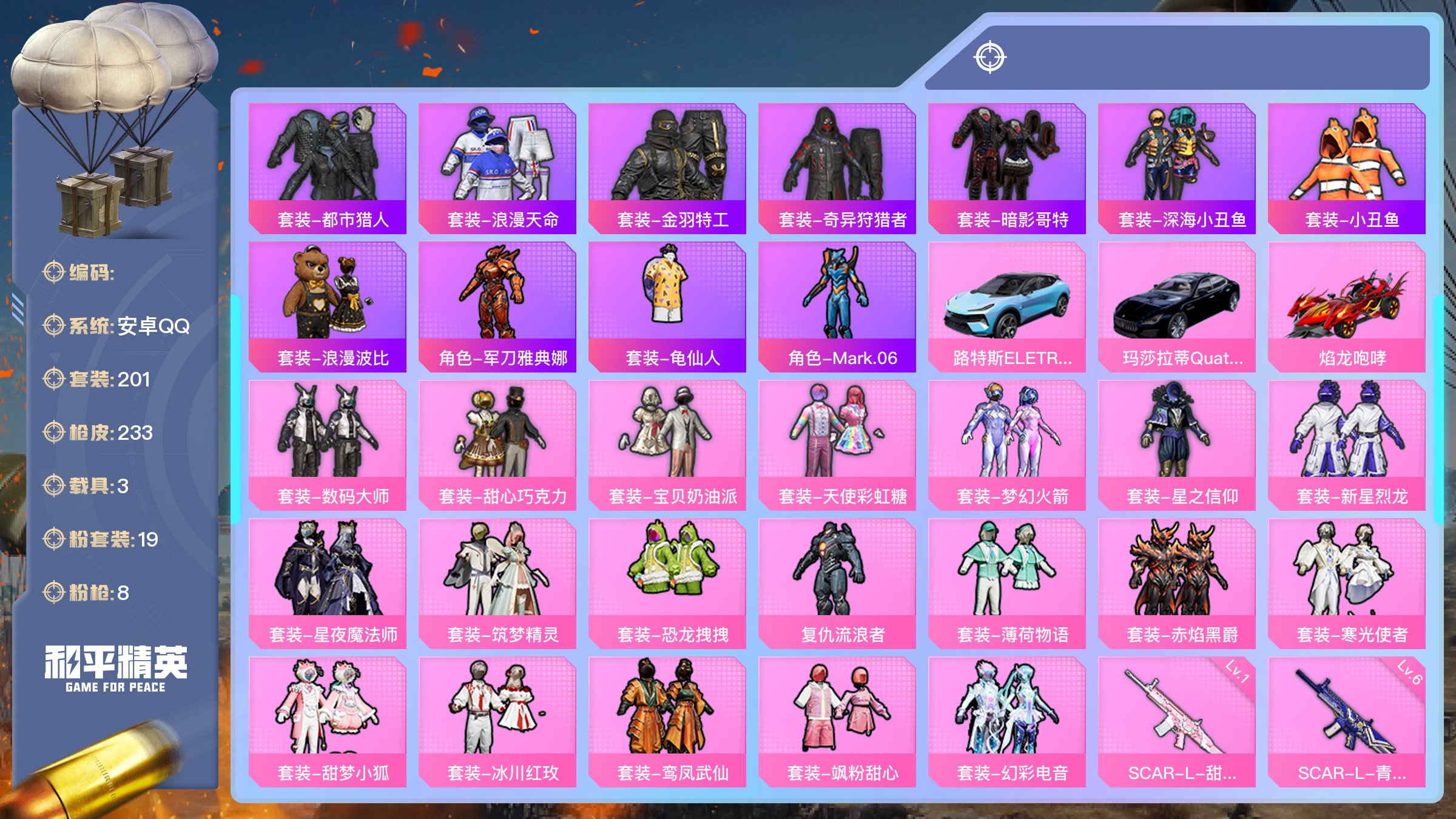 【游戏多多】 【0t68mgcgd】热力值:88858,19粉装,8粉呛,3载具,29粉色战备,201套装,233呛械,313装备,6滑翔尾翼,75降落伞;等级:lv.67 历史最高段位:传奇王牌11星 当前段位:不朽.星钻ⅱ;王牌印记10次 卓越印记1次 传奇印记1次; 【热门套装】:套装-都市猎人,套装-浪漫天命,套装-金羽特工,套装-奇异狩猎者,套装-暗影哥特,套装-深海小丑鱼,套装-小丑鱼,套装-浪漫波比,角色-军刀雅典娜,套装-龟仙人,角色-mark.06;【粉色套装】:粉装-数码大师,粉装-甜心巧克力,粉装-宝贝奶油派,粉装-天使彩虹糖,粉装-梦幻火箭,粉装-星之信仰,粉装-新星烈龙,粉装-星夜魔法师,粉装-筑梦精灵,粉装-恐龙拽拽,粉装-复仇流浪者,粉装-薄荷物语,粉装-赤焰黑爵,粉装-寒光使者,粉装-甜梦小狐,粉装-冰川红玫,粉装-鸾凤武仙,粉装-飒粉甜心,粉装-幻彩电音;【粉色呛械】:scar-l-甜梦小狐[1级],scar-l-青春物语[6级],m416-暖熊萌萌[1级],m416-五爪金龙[6级],akm-甜心宝贝[2级],m24-星之信仰[1级],kar98k-巳巳如意[5级],uzi-筑梦精灵[1级];【粉色载具】:路特斯eletre(冰川蓝),玛莎拉蒂quattropte(夜幕蓝),焰龙咆哮;【粉色滑翔尾翼】:太空嘟嘟飞行器,梦幻火箭飞行器,星夜魔法师飞行翼,青春物语飞行器;【粉色降落伞】:烈焰拳霸降落伞,梦之光华降落伞,恐龙拽拽降落伞,幽焰骑士降落伞,粉色回忆降落伞,炙焰牛王降落伞,垂柳戏鸭降落伞,青春物语降落伞,鬼刀降落伞,圣堂之誓降落伞,忍者神龟降落伞,甜心宝贝降落伞,未来歌姬降落伞,呛炮玫瑰降落伞,暖熊萌萌降落伞,幻影战神降落伞,圣光天使降落伞,筑梦精灵降落伞,梦幻火箭降落伞,甜梦小狐降落伞,流星咚咚降落伞,星夜魔法师降落伞,星之信仰降落伞,太空嘟嘟降落伞,环太平洋降落伞;【其他套装】:套装-猎鹰,套装-橘黑制服,套装-蓝色运动,套装-白色伏地魔,套装-黑色伏地魔,套装-骑行爱好者,套装-竞技名士,套装-湖蓝色名流,套装-黄色名流,套装-猛禽,套装-长空猛禽,套装-漫步者,套装-海岛探路者,套装-雨林探路者,套装-六六大吉,套装-冷焰舞者,套装-青羽突袭者,套装-特战装甲,套装-贵族骑装,套装-灰色格斗者,套装-甜蜜告白,套装-滨海假日,套装-沙漠毒蛇,套装-鹰眼刺客,套装-冰冻风暴,套装-幻影武者,套装-摇滚战魂,套装-特战英豪,套装-千禧之恋,套装-神秘领域,套装-怒火燎原,套装-魅力单车,套装-绮丽涂鸦,套装-超能勇士,套装-狂沙舞者,套装-破晓战魂,套装-森林游猎者,套装-荣耀,套装-热血青春,套装-沙漠兵团,套装-派对绅士,套装-极地朋克,套装-幻世战舞者,套装-甜蜜菠萝,套装-金耀舞者,套装-蓝调潮人,套装-弄潮海豚,套装-迅捷狂鲨,套装-呆萌铁蟹,套装-甜蜜熊情侣,套装-缤纷果语,套装-龙魂突击队,套装-冰川特警,套装-格斗先锋,套装-麻辣教官,套装-初雨海棠,套装-淡雅花蕊,套装-核芯基因,套装-精神漫游,套装-闪耀星光,套装-鹤鸣,套装-霓虹街区,套装-暴走罗小黑,套装-夏日音浪,套装-探宝勇士,套装-牛气满满,套装-特种颜团子,套装-战术大师,套装-牛气冲天,套装-ss18特训,套装-飞行日记,套装-双棍侠客,套装-天籁歌者,套装-电音精灵,角色-捷德奥特曼,套装-吉莉礼服,套装-ss15特训,套装-ss16特训,套装-暴风机械师,套装-时空追击者,套装-星辰守护者,套装-ss17特训,套装-水晶王族,套装-智慧隐士,套装-瑞龙福将,套装-团圆交子,套装-冰川谧蓝,套装-福星高照,套装-豚鼠丹丹,套装-雪兔飞飞,套装-虎虎生威吉莉,套装-异彩先驱,套装-霓虹极客,套装-空投萌叽,套装-ss19特训,套装-兔兔白日梦,套装-浓情蜜辣,套装-极速竞梦,套装-飞驰魅影,套装-音速流光,套装-炫蓝之夏,套装-ss20特训,套装-浑天鲲鹏,套装-覆海蛟龙,套装-粉团憨憨,套装-软羊咩咩,套装-王牌投手,套装-奶芙汪汪,套装-恶魔喵喵,套装-猎梦纪元,套装-甜心亚梦,套装-虚音幻奏,套装-ss21特训,套装-萌趣咩咩,套装-娇憨猪猪,套装-荷畔雨呱,套装-俏皮奶喵,套装-酸甜橘柚,角色-李逍遥,套装-玉兔迎春,套装-ss22特训,套装-和煦暖阳,套装-田园牧歌,套装-轻风白浪,套装-熠彩粉晶,套装-光之冒险,套装-绯格组合,套装-ss23特训,套装-神气柴柴,套装-懵萌河马,套装-王牌教练,套装-柠萌假日,套装-ss24特训,套装-绚紫流光,套装-彩虹嘻嘻猴,套装-涂山之恋,套装-ss25特训,套装-香桃花海,套装-龙的传人,套装-冰河战士,套装-ss26特训,套装-快闪甜心,套装-春光漫游,套装-空岛之星,套装-ss27特训,套装-恋语绒绒,套装-老实芭蕉,套装-ss28特训,角色-达芬奇,套装-蝶变,套装-小熊娃娃,套装-ss29特训,套装-雏菊兔兔,套装-萝兰蝴蝶,套装-鹿角斗士,角色-摩登魅猫,套装-星途旅人,套装-ss30特训,套装-青团波波,套装-棉花软糖,套装-糖糖葫芦,套装-ss31特训,套装-鱼渊荷华,套装-燕燕于飞,套装-ss33特训,套装-巳巳如意,套装-ss32特训,套装-顶瓜瓜,套装-大橘大利,套装-元气之梦,套装-ss34特训;其他呛械:scar-l-红色方程式,scar-l-黄金龙骨,scar-l-玉兔迎春,scar-l-炫彩节奏,scar-l-海盐豹豹,scar-l-星途旅人,g36c-星穹咏叹调,g36c-时空追击者,g36c-懵萌河马,g36c-冷魅冰骑,g36c-乌木金纹,g36c-炙焰牛王,m16a4-千金淑猫,m16a4-幻世战舞者,m16a4-甜心亚梦,m16a4-冰河战士,m762-瑞龙福将,m762-天降萌叽,m762-奇异狩猎者,m762-呛炮玫瑰,m762-暖熊萌萌,m762-橘柚倾心,m762-雏菊兔兔,m762-甜心宝贝,groza-异彩先驱,groza-海盐豹豹,groza-懵萌河马,groza-青春物语,groza-紫翼圣骑,groza-田园牧歌,groza-蓝莓炮弹,groza-影袭,groza-恐龙拽拽,蜜獾-糖糖