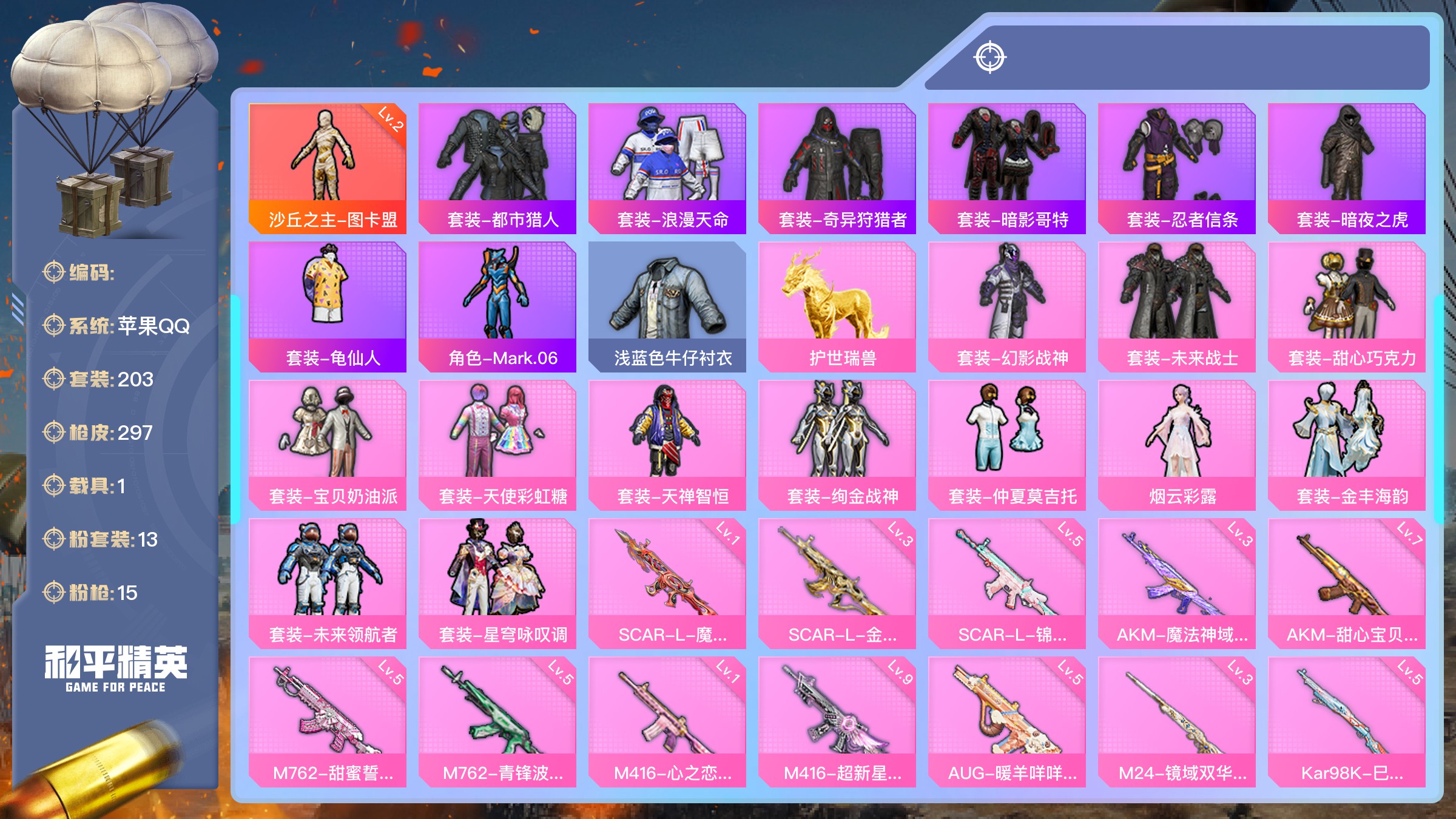【游戏多多】 【0t68mcbhd】热力值:99779,13粉装,15粉呛,1载具,28粉色战备,203套装,297呛械,354装备,13滑翔尾翼,92降落伞;等级:lv.67 历史最高段位:超级王牌12星 当前段位:不朽.星钻ⅲ;王牌印记13次 卓越印记2次 传奇印记1次; 【热门套装】:沙丘之主-图卡盟[2级],套装-都市猎人,套装-浪漫天命,套装-奇异狩猎者,套装-暗影哥特,套装-忍者信条,套装-暗夜之虎,套装-龟仙人,角色-mark.06,浅蓝色牛仔衬衣;【红色套装】:沙丘之主-图卡盟[2级];【粉色套装】:粉装-幻影战神,粉装-未来战士,粉装-甜心巧克力,粉装-宝贝奶油派,粉装-天使彩虹糖,粉装-天禅智恒,粉装-绚金战神,粉装-仲夏莫吉托,粉装-烟云彩露,粉装-金丰海韵,粉装-未来领航者,粉装-星穹咏叹调;【粉色呛械】:scar-l-魔童闹海哪吒[1级],scar-l-金蛇镇世[3级],scar-l-锦绣绵绵[5级],akm-魔法神域[3级],akm-甜心宝贝[7级],m762-甜蜜誓约[5级],m762-青锋波束[5级],m416-心之恋语[1级],m416-超新星[9级],aug-暖羊咩咩[5级],m24-镜域双华[3级],kar98k-巳巳如意[5级],ump45-量子极限[5级],dp-28-豹影疾电[5级],破片手留单-热量炸弹[6级];【粉色载具】:护世瑞兽;【粉色滑翔尾翼】:祥瑞起舞飞行器,万象金身飞行器,深渊漩涡飞行器,幻海精灵飞行器[1级],牡丹亭・游园飞行器,飞天猪飞行器[1级],繁龙极客飞行器,酣梦熊熊飞行器,沙丘之主天马[1级];【粉色降落伞】:星梦奇缘降落伞,百万伏特降落伞,极限特训降落伞,金丰海韵降落伞,守护天翼降落伞,炙焰牛王降落伞,异瞳寒姬降落伞,圣堂之誓降落伞,星穹咏叹调降落伞,镜光幻境降落伞,金蛇镇世降落伞,莲影清波降落伞,甜蜜誓约降落伞,甜心宝贝降落伞,江南烟雨降落伞,千金淑猫降落伞,闲梦青缨降落伞,鬼刀降落伞,幻影战神降落伞;【其他套装】:套装-黄色运动,套装-蓝色运动,套装-白色伏地魔,套装-黑色伏地魔,套装-竞技名士,套装-湖蓝色名流,套装-黄色名流,套装-猛禽,套装-长空猛禽,套装-沙漠雄狮,套装-漫步者,套装-黎明保卫者,套装-雪鹰学院,套装-蓝色守护者,套装-海岛探路者,套装-雨林探路者,套装-旭日情侣,套装-六六大吉,套装-灼焰舞者,套装-水银刺客,套装-特战装甲,套装-贵族骑装,套装-战地督导,套装-迎春赐吉,套装-龙腾端午,套装-滨海假日,套装-鹰眼刺客,套装-冰冻风暴,套装-冷酷挑战者,套装-完美偶像,套装-幻影武者,套装-摇滚战魂,套装-特战英豪,套装-街头潮人,套装-红潮炫舞,套装-暗金炫舞,套装-怒火燎原,套装-魅力单车,套装-绮丽涂鸦,套装-野性战心,套装-荣耀,套装-热血青春,套装-沙漠兵团,套装-幻世战舞者,套装-甜蜜菠萝,套装-清新柠檬,套装-蓝调潮人,套装-血色贵族,套装-迅捷狂鲨,套装-甜蜜熊情侣,套装-缤纷果语,套装-滨海厨神,套装-alanwalker,套装-龙魂突击队,套装-冰川特警,套装-格斗先锋,套装-麻辣教官,套装-初雨海棠,套装-破蛋小黄鸡,套装-阳光火鸡,套装-军械专家,套装-鹤鸣,套装-霓虹街区,套装-纯白誓言,套装-白熊同盟,套装-萌黄之夏,套装-夏日音浪,套装-探宝勇士,套装-jde战队服,套装-牛气满满,套装-萌趣颜团子,套装-战术大师,套装-牛气冲天,套装-ss18特训,套装-飞行日记,套装-wbg战队服,套装-热情海星,套装-纯真浪花,套装-wbg追光队服,套装-ss16特训,套装-ss17特训,套装-水晶王族,套装-瑞龙福将,套装-团圆交子,套装-虎虎生威吉莉,套装-异彩先驱,套装-霓虹极客,套装-空投萌叽,套装-ss19特训,套装-极速竞梦,套装-飞驰魅影,套装-音速流光,套装-炫蓝之夏,套装-ss20特训,套装-浑天鲲鹏,套装-覆海蛟龙,套装-猎梦纪元,套装-甜心亚梦,套装-虚音幻奏,套装-ss21特训,套装-萌趣咩咩,套装-娇憨猪猪,套装-玉兔迎春,套装-ss22特训,套装-和煦暖阳,套装-田园牧歌,套装-轻风白浪,套装-光之冒险,套装-绯格组合,套装-ss23特训,套装-灵蜜圈圈,套装-妙红点点,套装-幻彩翩翩,套装-王牌教练,套装-柠萌假日,套装-ss24特训,套装-涂山之恋,套装-ss25特训,套装-惊鸿侠骨,套装-锦衣飞扬,套装-香桃花海,套装-果汁能量,套装-龙的传人,套装-冰河战士,套装-ss26特训,套装-快闪甜心,套装-春光漫游,套装-空岛之星,套装-无暇誓言,套装-焰鹰斗篷,套装-幻羽潜行,套装-ss27特训,套装-恋语绒绒,套装-ss28特训,套装-铁血战翼,角色-粉雾星云,角色-白光莹,套装-街头风暴,套装-海盐绵绵冰,套装-蝶变,套装-湖畔霞光,套装-粉日山川,套装-原力风暴,套装-小熊娃娃,套装-ss29特训,套装-雏菊兔兔,套装-萝兰蝴蝶,套装-异域银装,角色-蜜桃派对,角色-都市丽猫,套装-星途旅人,角色-怀庆长公主,套装-ss30特训,套装-青团波波,套装-棉花软糖,角色-夜瞳黯灵,角色-绛羽幽主,套装-糖糖葫芦,套装-小鸟芋圆,套装-诡诞巡游,套装-ss31特训,套装-鱼渊荷华,套装-燕燕于飞,套装-智谋强哥,角色-海琴烟,套装-紫幽梦,套装-粉恋花,套装-ss33特训,套装-云朵鹅,套装-巳巳如意,套装-ss32特训,套装-蓝冰羽,套装-顶瓜瓜,套装-雪绒豹,套装-大橘大利,套装-极速光影,套装-星影赞美诗,套装-元气之梦,套装-ss34特训,套装-朱霞炽焰,角色-申公豹,套装-凌霄紫焰,套装-ss35特训;其他呛械:ac-val-乌木金纹,ac-val-魅影蝠王,ac-val-天降萌叽,ac-val-甜心亚梦,ac-val-宇宙意志,ac-val-快闪甜心,g36c-星穹咏叹调,g36c-镜域双华,g36c-炙焰牛王,g36c-乌木金纹,g36c-桃粉嫣然,scar-l-甜蜜誓约,scar-l-未来战士,scar-l-龙宫之主,scar-l-星途旅人,scar-l-黄金龙骨,scar-l-海盐豹豹,scar-l-粉锦千层,scar-l-玉兔迎春,akm-灼热熔岩,akm-破晓战魂,