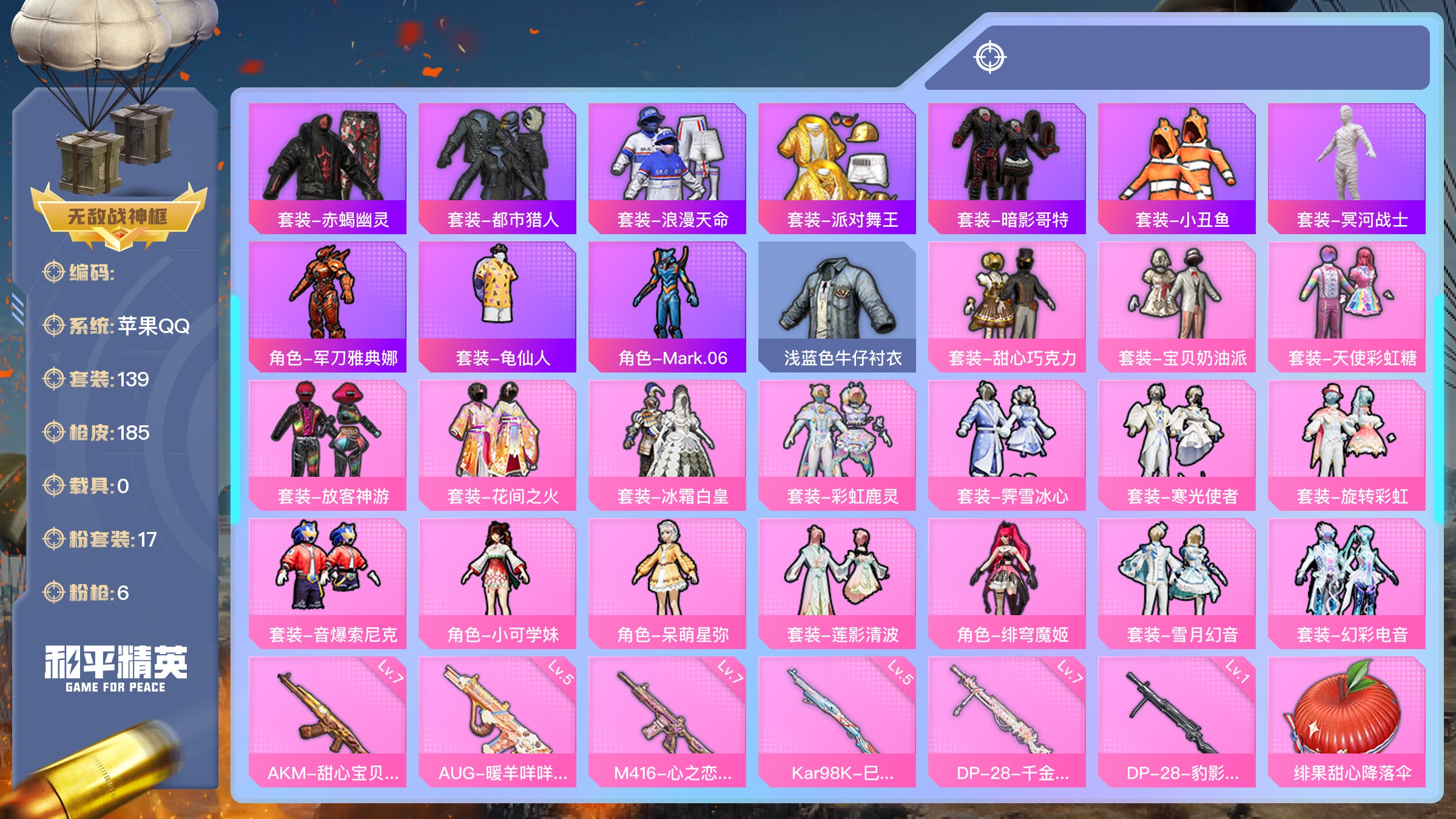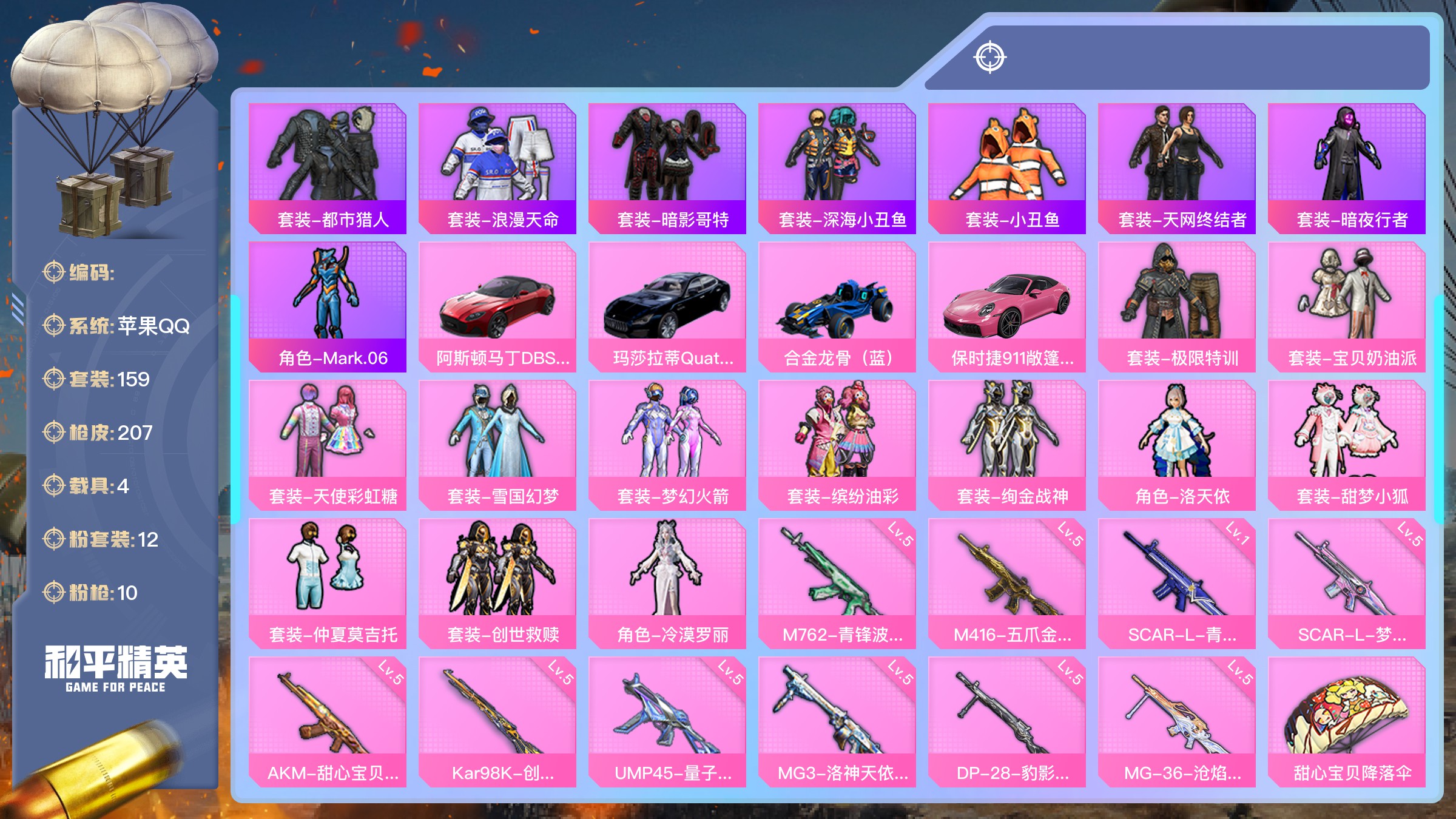 【游戏多多】 【可二次实名】1561088-(可二次实名)苹果q-116251热力值16王牌印记历史卓越王牌18星252套装333呛皮【3载具】路特斯el灰色玛莎拉蒂q蓝色星梦玉骢【4稀有】akm-缤纷海域akm-百万伏特都市猎人浪漫天命【23粉装】梦幻火箭宝贝奶油派天使彩虹糖深海曼妙幻影战神放客神游橘柚倾心闪耀律动数码大师未来战士天禅智恒冰川幽秘灵感创作师冰霜白皇炙焰红王霁雪冰心王牌四分卫彩虹甜喵蜜桃特工海盐物语山涧鹿灵彩虹鹿灵复仇流浪者【12特效呛】m416-五爪金龙(5级)scar-l-锦绣绵绵(5级)akm-甜心宝贝(7级)m762-甜蜜誓约(5级)scar-l-童趣迷兔(7级)uzi-绮梦青鸾(6级)ump45-相思残雪(7级)m416-至情至圣(9级)dp-28-幻梦音符(4级)slr-暗夜玫瑰(5级)mg3-洛神天依(4级)vect-环太平洋(4级)【4飞行器】四圣焕新飞行器深海曼妙飞行器千面幻镜飞行器冷魅冰骑飞行器【42热门】雪山精英东方飞龙动感兔斯基梦魇先生万圣娃娃鹰眼刺客好奇恐龙奇迹天团激萌罗小黑迅捷狂鲨深海小丑鱼金羽特工山经魅狐怪兽之王梦起落英神秘黑猫暗夜契约醒狮腾龙团圆交子瑞龙福将纯白誓言豚鼠丹丹忍者信条狂沙舞者漫步者冰爽海盐爱神风华少年志黑色刀锋军刀雅典娜英勇保护者弄潮海豚akm-奇异狩猎者m762-奇异狩猎者m762-瑞龙福将m249-古堡领主kar98k-深海曼妙m24-香水柠檬akm-山经魅狐mini14-林间仙鹿汤姆逊-林间仙鹿groza-林间仙鹿【7头盔】精灵迷巫头盔梦幻火箭头盔甜心宝贝头盔百万伏特头盔幻影战神头盔深海小丑鱼头盔夏日绵绵冰头盔【5背包】梦幻火箭背包甜心宝贝背包百万伏特背包幻影战神背包甜蜜誓约背包营地id:416336994