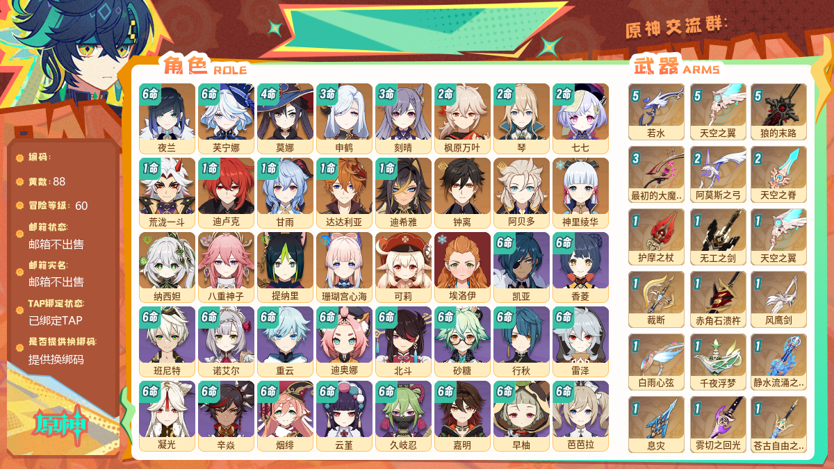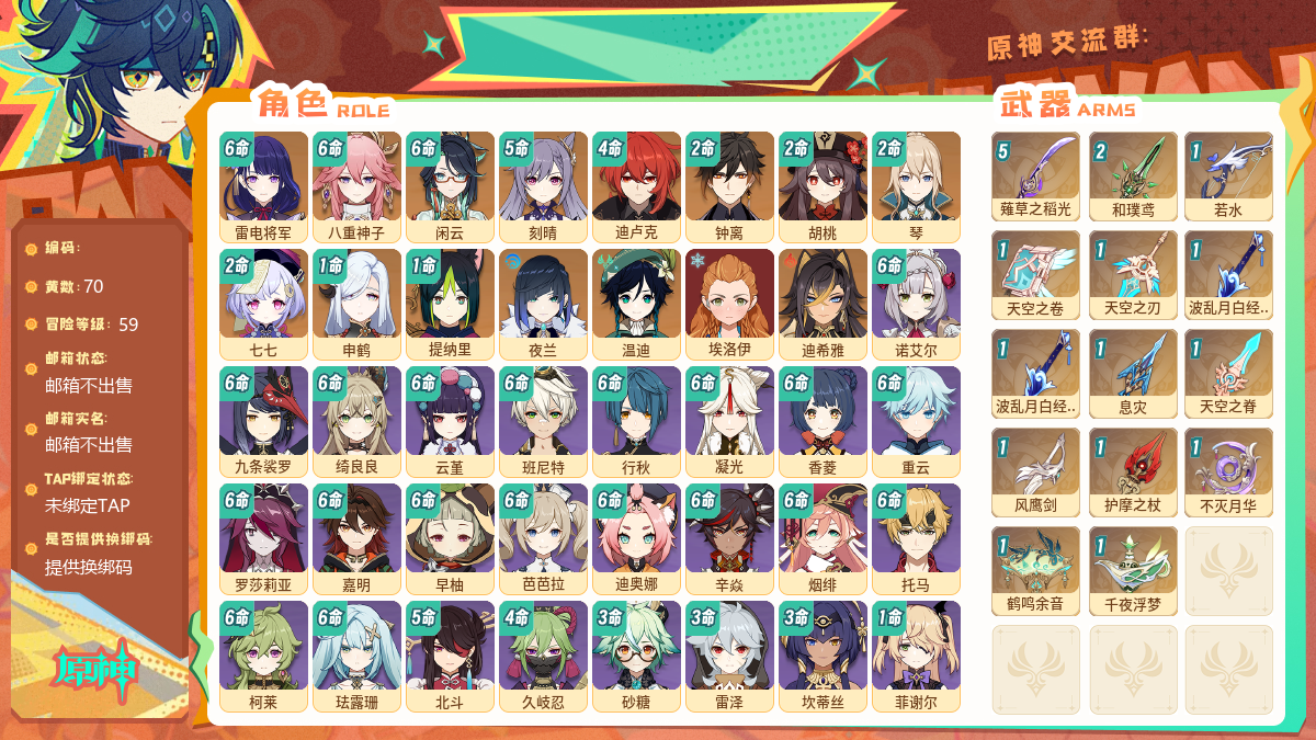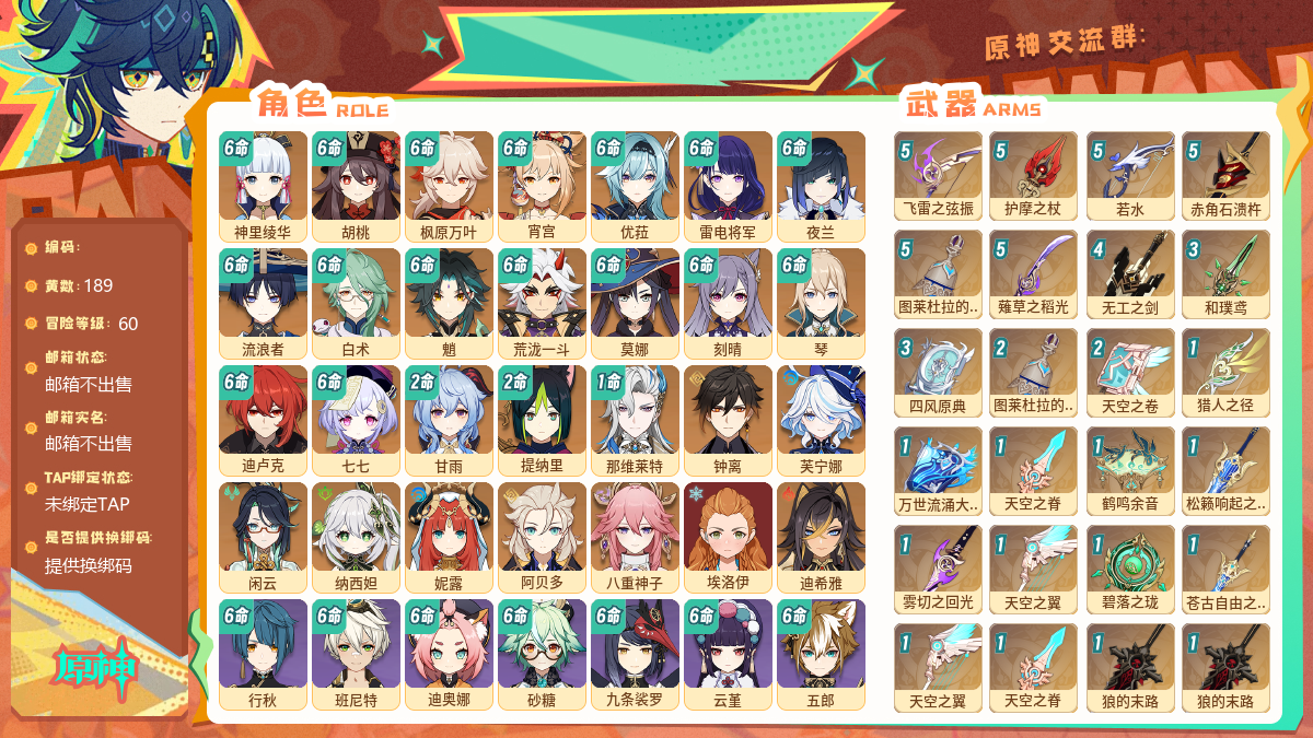【游戏多多】 【i90roh2bh】60级,81黄,女主,29个五星角色:满命恰斯卡 满命提纳里 3命七七 2命纳西妲 2命芙宁娜 2命夜兰 2命迪希雅 2命莫娜 2命迪卢克 1命菲林斯 1命枫原万叶 1命琴 1命爱可菲 希诺宁 钟离 丝柯克 茜特菈莉 克洛琳德 八重神子 雷电将军 菈乌玛 艾梅莉埃 那维莱特 妮露 神里绫人 宵宫 流浪者 梦见月瑞希 刻晴,20个五星武器:精2四风原典 精1星鹫赤羽 精1和璞鸢 精1天空之刃 精1猎人之径 精1天空之脊 精1若水 精1飞雷之弦振 精1岩峰巡歌 精1血染荒城 精1若水 精1赦罪 精1阿莫斯之弓 精1千夜浮梦 精1圣显之钥 精1风鹰剑 精1波乱月白经津 精1天空之傲 精1天空之卷 精1苍古自由之誓,时装:岁夜欢哗 静暇雅宴 叶隐芳名 倩影游侠 雨化竹身 帆影游风 炽绘奇旅 莎邦之息,纠缠之源 2,原石 200,圣遗物 891【邮箱未实名】【网易邮箱出售】【官方截图】