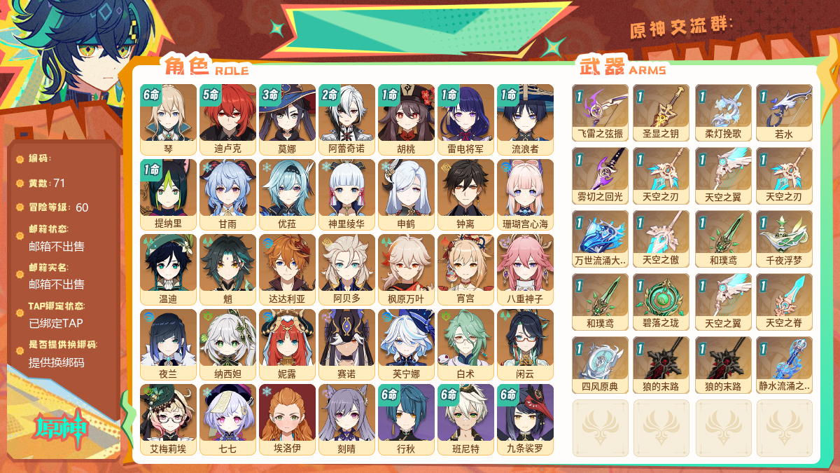 【游戏多多】 【i90ro2b1a】60级,71黄,女主,25个五星角色:4命夜兰 4命刻晴 3命迪卢克 3命芙宁娜 2命七七 2命莫娜 2命提纳里 1命琴 1命达达利亚 1命玛薇卡 1命迪希雅 神里绫华 温迪 钟离 胡桃 枫原万叶 雷电将军 珊瑚宫心海 申鹤 纳西妲 希诺宁 八重神子 那维莱特 茜特菈莉 埃洛伊,17个五星武器:精3天空之脊 精2和璞鸢 精2护摩之杖 精2四风原典 精2天空之傲 精1最初的大魔术 精1岩峰巡歌 精1神乐之真意 精1若水 精1天空之翼 精1万世流涌大典 精1焚曜千阳 精1千夜浮梦 精1雾切之回光 精1薙草之稻光 精1天空之刃 精1息灾,时装:叶隐芳名 极夜真梦 倩影游侠 雨化竹身 帆影游风 炽绘奇旅 闪耀协奏 岁夜欢哗 纱中幽兰 花时来信,纠缠之源 0,原石 1764,圣遗物 475【邮箱不出售】【邮箱不出售】【官方截图】