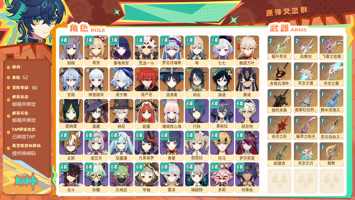【游戏多多】 【iwnk7c1ha】60级,81黄,男主,26个五星角色:满命七七 满命玛薇卡 满命丝柯克 满命恰斯卡 5命莫娜 2命琴 2命茜特菈莉 2命迪希雅 1命刻晴 1命夜兰 1命提纳里 1命梦见月瑞希 神里绫华 迪卢克 钟离 胡桃 枫原万叶 雷电将军 珊瑚宫心海 纳西妲 那维莱特 芙宁娜 闲云 阿蕾奇诺 瓦雷莎 伊涅芙,16个五星武器:精1星鹫赤羽 精1狼的末路 精1天空之刃 精1若水 精1苍耀 精1风鹰剑 精1天空之卷 精1雾切之回光 精1支离轮光 精1天空之刃 精1天空之脊 精1风鹰剑 精1护摩之杖 精1天空之翼 精1焚曜千阳 精1天空之脊,时装:岁夜欢哗 殷红终夜 帆影游风 叶隐芳名 倩影游侠 雨化竹身 炽绘奇旅 极夜真梦,纠缠之源 0,原石 705,圣遗物 1680【邮箱未绑定】【邮箱未绑定】【官方截图】