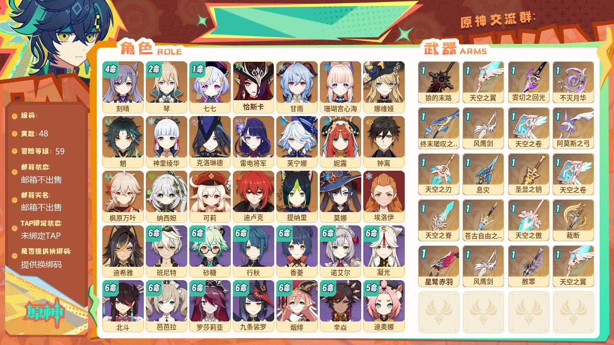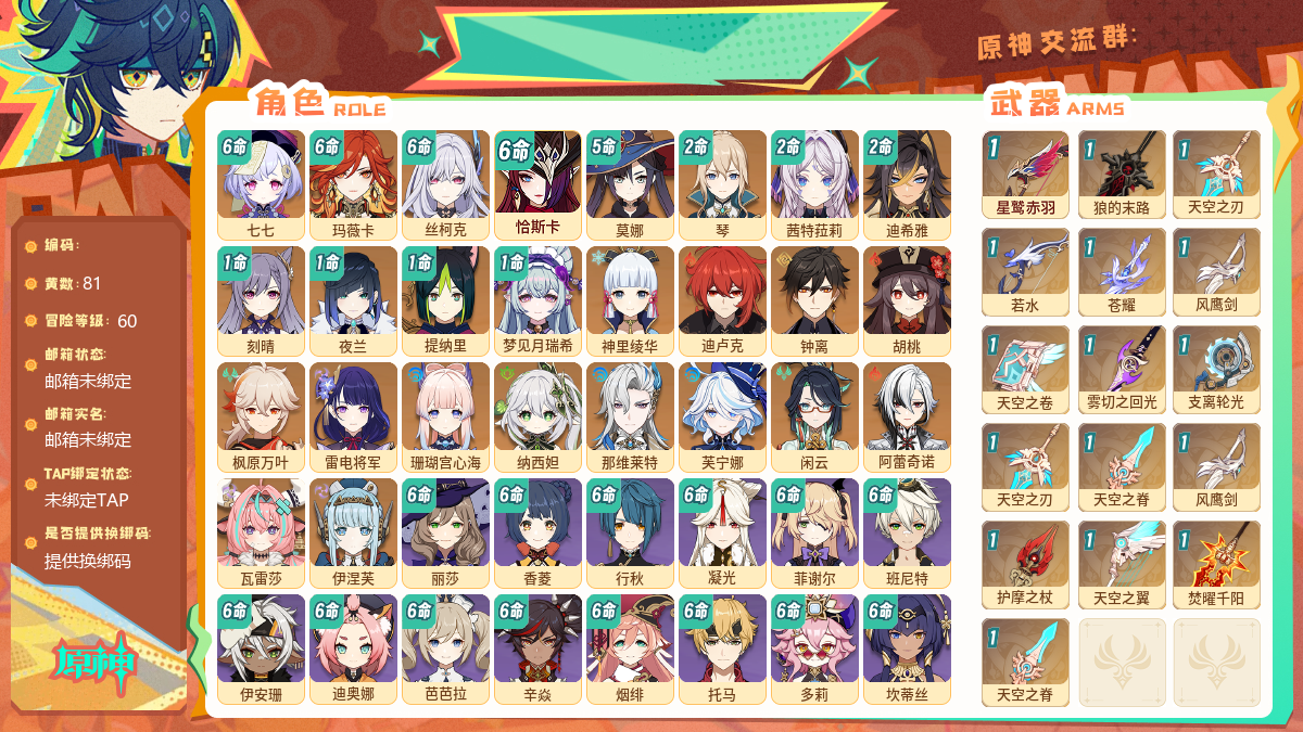 【游戏多多】 【iwnk7c1ha】60级,81黄,男主,26个五星角色:满命七七 满命玛薇卡 满命丝柯克 满命恰斯卡 5命莫娜 2命琴 2命茜特菈莉 2命迪希雅 1命刻晴 1命夜兰 1命提纳里 1命梦见月瑞希 神里绫华 迪卢克 钟离 胡桃 枫原万叶 雷电将军 珊瑚宫心海 纳西妲 那维莱特 芙宁娜 闲云 阿蕾奇诺 瓦雷莎 伊涅芙,16个五星武器:精1星鹫赤羽 精1狼的末路 精1天空之刃 精1若水 精1苍耀 精1风鹰剑 精1天空之卷 精1雾切之回光 精1支离轮光 精1天空之刃 精1天空之脊 精1风鹰剑 精1护摩之杖 精1天空之翼 精1焚曜千阳 精1天空之脊,时装:岁夜欢哗 殷红终夜 帆影游风 叶隐芳名 倩影游侠 雨化竹身 炽绘奇旅 极夜真梦,纠缠之源 0,原石 705,圣遗物 1680【邮箱未绑定】【邮箱未绑定】【官方截图】