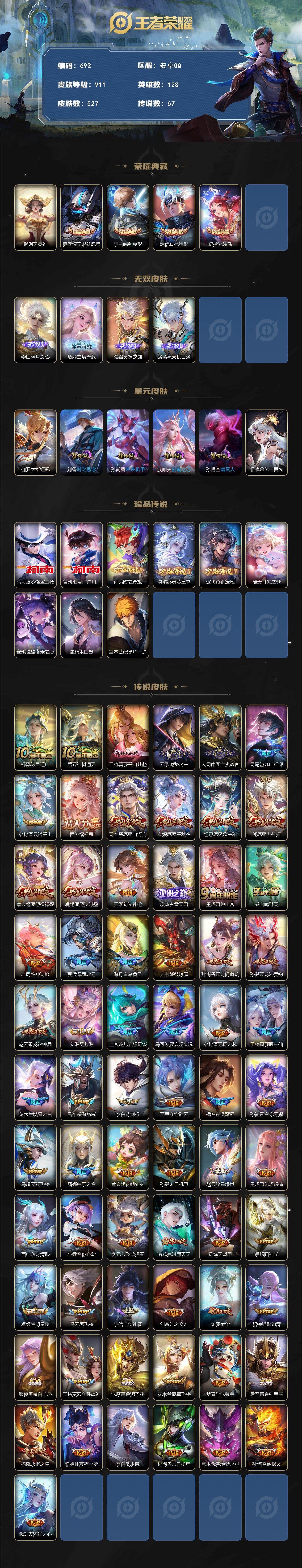 【游戏多多】【王者荣耀】【编号:3342074】【可二次实名】R50132 可二次安卓Q【营地:459405823】-无双贵10-最强王者段位-128英雄-527皮肤-4典藏皮肤-1典藏英雄-4无双-9珍品传说-67传说-168史诗【英雄全皮】:嬴政全皮,刘禅全皮,元歌全皮,李白全皮,达摩全皮,司马懿全皮,刘邦全皮,孙权全皮,艾琳全皮,橘右京全皮,哪吒全皮,鬼谷子全皮,黄忠全皮,狂铁全皮,大司命全皮,蒙犽全皮,阿古朵全皮,司空震全皮,暃全皮,戈娅全皮,空空儿全皮,影全皮,少司缘全皮【荣耀典藏】:武则天英雄,夏侯惇无限飓风号,李白鸣剑曳影,韩信弑枪猎影,瑶拾光映像【无双皮肤】:李白碎月剑心,甄姬雪境奇遇,曜器灵螭龙剑,诸葛亮天机白泽【珍品传说】:马可波罗怪盗基德,鲁班七号江户川柯南,孙策时之奇旅,嫦娥器灵落星盏,张飞兔狲蓬尾,瑶大耳狗之梦,安琪拉酷洛米之心,暃朽木白哉,宫本武藏黑崎一护【传说皮肤】:杨戬纵目迁山,后羿神树通天,干将莫邪千山共赴,元歌诡秘之主,大司命死亡执政官,司马懿九山相柳,公孙离云诺千山,西施续相思,司空震愿照山河定,女娲愿照千秋盛,妲己愿照众生和,澜愿照九州拓,蔡文姬愿照福禄聚,虞姬愿照岁时盈,云缨幻光神枪,嬴政玄雷天君,王昭君映山客,桑启鸣野蒿,庄周牧神诗旅,夏侯惇霜北刀,海月金乌负日,典韦战鼓燎原,孙尚香乘龙问璇玑,孙策乘龙淬吴钩,赵云乘龙铭钟鼎,艾琳觅芳踪,上官婉儿妄想奇谈,马可波罗妄想实况,公孙离记忆之芯,干将莫邪画中仙,花木兰燃星之曲,吕布怒海麟威,李白诗剑行,百里守约碎云,橘右京枫霜尽,孙尚香音你闪耀,马超无双飞将,露娜启示之音,蔡文姬花朝如约,孙策末日机甲,赵云淬星耀世,王昭君乞巧织情,西施游龙清影,小乔音你心动,李元芳飞鸢探春,诸葛亮时雨天司,铠绛天战甲,镜炽阳神光,虞姬启明星使,曜云鹰飞将,李信一念神魔,刘备时之恋人,伽罗太华,貂蝉猫影幻舞,张良黄金白羊座,干将莫邪久胜战神,达摩黄金狮子座,花木兰冠军飞将,梦奇胖达荣荣,后羿黄金射手座,杨戬永曜之星,貂蝉仲夏夜之梦,李白凤求凰,孙尚香末日机甲,宫本武藏地狱之眼,孙悟空地狱火,武则天海洋之心【限定皮肤】:白起狰,夏侯惇霜北刀,暃埋骨钱,蒙犽顽岩魄,蔡文姬夏日便利店,大乔绒语心约,虞姬夏日便利店,姜子牙天穹之誓,李白谪仙醉月,狄仁杰阴阳师,赵云皇家上将,赵云百木心枪,墨子神迹守卫,妲己时之彼端,妲己时之奇旅,嬴政优雅恋人,嬴政白昼王子,庄周高山流水,高渐离死亡摇滚,高渐离玩趣恶龙,阿轲迷踪丽影,钟无艳超时空战士,吕布御风骁将,周瑜赤莲之焰,元歌无心,夏侯惇朔风刀,甄姬游园惊梦,甄姬落雪兰心,曹操烛龙,典韦穷奇,马可波罗妄想实况,狄仁杰魔术师,关羽冰锋战神,程咬金演武夺筹,露娜一生所爱,露娜启示之音,刘邦夺宝奇兵,韩信飞衡,王昭君凤凰于飞,王昭君午后时光,兰陵王驯魔猎人,兰陵王金庭之子,花木兰瑞麟志,花木兰默契交锋,花木兰燃星之曲,橘右京枫霜尽,亚瑟潮玩骑士王,孙悟空至尊宝,牛魔御旌,后羿辉光之辰,后羿圣弓游侠,李元芳银河之约,李元芳云中旅人,虞姬启明星使,钟馗驱傩正仪,杨玉环遇见飞天,杨戬永曜之星,杨戬潮玩骑兵,哪吒逐梦之翼,干将莫邪真爱魔法,干将莫邪画中仙,雅典娜黎明之约,太乙真人饕餮,鬼谷子原初探秘者,鬼谷子五谷丰年,诸葛亮时雨天司,黄忠烈魂,黄忠火炮绅士,苏烈千军破阵,百里玄策原初追逐者,弈星混沌棋,梦奇顽趣,沈梦溪星空之诺,沈梦溪大漠名商,明世隐疑决卦,裴擒虎李小龙,裴擒虎擒涛扼浪,狂铁御狮,狂铁电玩高手,米莱狄御霄,米莱狄胡桃异想国,云中君纤云弄巧,伽罗太华,盾山御銮,猪八戒猪悟能,上官婉儿梁祝,上官婉儿天狼绘梦者,上官婉儿神器万象笔,上官婉儿妄想奇谈,嫦娥拒霜思,嫦娥暖冬兔眠,西施玲珑珍味,蒙犽狂想玩偶喵,鲁班大师探海日志,桑启海盐诗旅,暃星界游侠,戈娅驭风魔法,艾琳女武神,艾琳流音漫舞,司空震地狱燃心,阿古朵江河有灵,张良古海寻踪,蒙犽百解令,艾琳觅芳踪,蒙恬荣光圣徽,高渐离燃音魔法,妲己灵卜魔法,鬼谷子天穹祈灯,李白碎月剑心,伽罗琥珀纪元,大乔乘龙忆丹青,安琪拉乘龙聚宝船,孙尚香乘龙问璇玑,孙策乘龙淬吴钩,赵云乘龙铭钟鼎,沈梦溪龙舞盛年,鲁班七号蔬乡物语,李元芳蔬乡物语,海月金乌负日,刘邦剑破天穹,程咬金群星魔术团,镜青焰无极,项羽苍威无极,芈月浮光幕影,周瑜熔金海岸【年限皮肤】:花木兰瑞麟志,王昭君凤凰于飞,李白凤求凰,杨戬永曜之星,后羿辉光之辰,吕布御风骁将,诸葛亮时雨天司,伽罗太华,韩信飞衡,马超神威,黄忠烈魂,大乔乘龙忆丹青,安琪拉乘龙聚宝船,孙尚香乘龙问璇玑,孙策乘龙淬吴钩,赵云乘龙铭钟鼎,各种道具详情看截图、低价出售找回包 赔、截图展示段位不代 表实际段位,如赛季更新等不可抗拒因素发生变化、时限道具不保证所剩时间、标题未写送点劵默认不送【卖号买号首选亿梦】