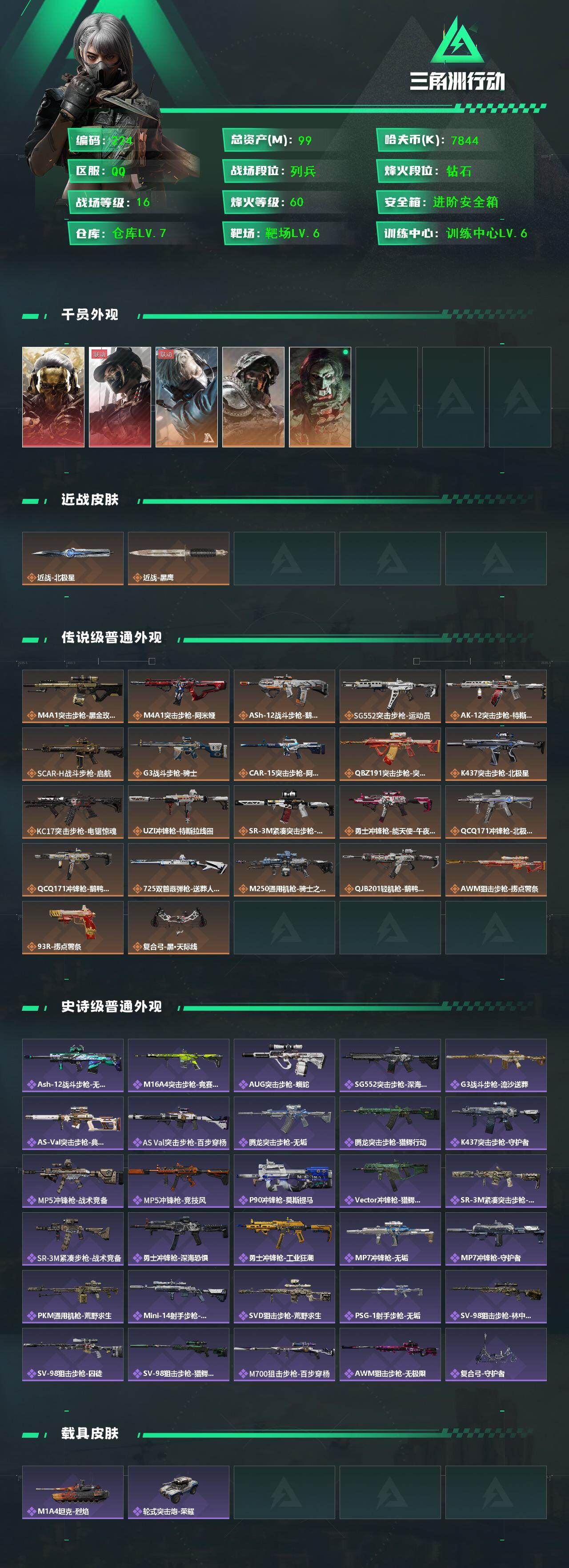 【游戏多多】【三角洲行动】【编号:17238】R49604 可二次QQ 【S7赛季6格】99m总资产-7844k哈伏币-60烽火等级-钻石-16战场等级-列兵【指挥中心5级+训练中心6级+靶场6级+收藏室1级】【2组红弹】【干员外观】:红狼-蚀金玫瑰,露娜-黑·天际线,蜂医-送葬人·无题密令,深蓝-不破誓约,红狼-电锯惊魂【近战皮肤】:近战-北极星,近战-黑鹰【传说外观】:M4A1突击步枪-蚀金玫瑰,M4A1突击步枪-阿米娅,ASh-12战斗步枪-鹅鸭杀,SG552突击步枪-运动员,AK-12突击步枪-特斯拉线圈,SCAR-H战斗步枪-启航,G3战斗步枪-骑士,CAR-15突击步枪-阿米娅,腾龙突击步枪-捞点薯条,K437突击步枪-北极星,KC17突击步枪-电锯惊魂,UZI冲锋枪-特斯拉线圈,SR-3M紧凑突击步枪-特斯拉线圈,勇士冲锋枪-能天使-午夜邮差,QCQ171冲锋枪-北极星,QCQ171冲锋枪-鹅鸭杀,725双管霰弹枪-送葬人-无题密令,M250通用机枪-骑士之心,QJB201轻机枪-鹅鸭杀,AWM狙击步枪-捞点薯条,93R-捞点薯条,复合弓-黑·天际线,各种道具详情看截图、低价出售找回包 赔、截图展示段位不代 表实际段位,如赛季更新等不可抗拒因素发生变化、时限道具不保证所剩时间、标题未写送点劵默认不送【卖号买号首选亿梦】