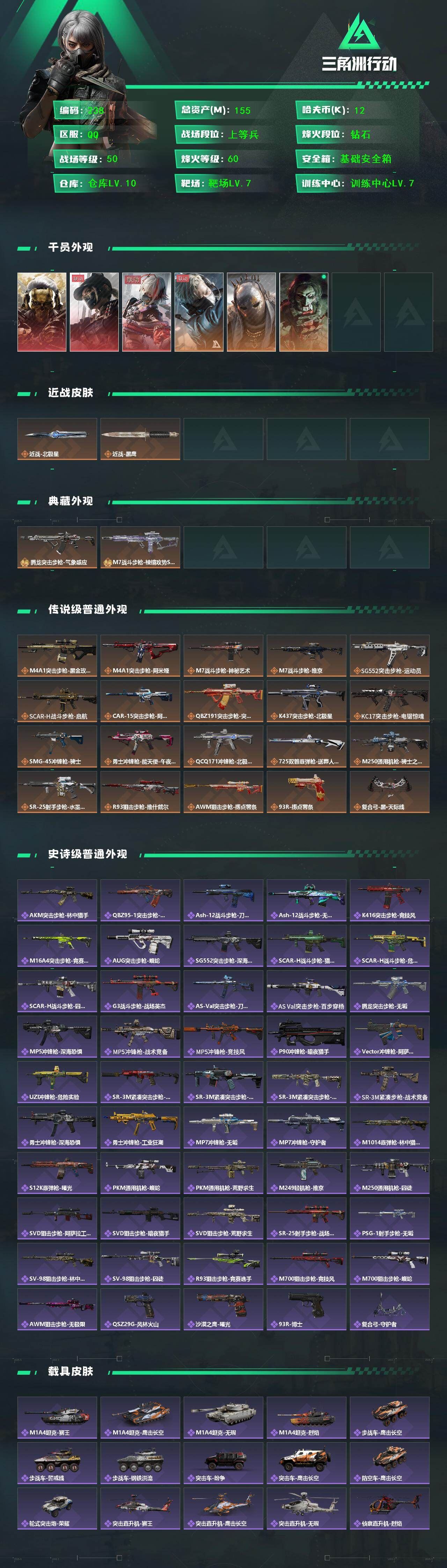 【游戏多多】【三角洲行动】【编号:17267】R49866 可二次QQ 155m总资产-12k哈伏币-60烽火等级-钻石-50战场等级-上等兵【典藏外观】:腾龙突击步枪-气象感应优品B,M7战斗步枪-棱镜攻势S2*2(优品S/优品C)【仓库10级+指挥中心6级+训练中心7级+靶场7级+潜水中心3级+收藏室2级】【挂饰】:挂饰-毁灭之源,【干员外观】:红狼-蚀金玫瑰,露娜-黑·天际线,骇爪-维什戴尔,蜂医-送葬人·无题密令,牧羊人-街头之王,红狼-电锯惊魂【近战皮肤】:近战-北极星,近战-黑鹰【传说外观】:M4A1突击步枪-蚀金玫瑰,M4A1突击步枪-阿米娅,M7战斗步枪-神秘艺术,M7战斗步枪-维京,SG552突击步枪-运动员,SCAR-H战斗步枪-启航,CAR-15突击步枪-阿米娅,腾龙突击步枪-捞点薯条,K437突击步枪-北极星,KC17突击步枪-电锯惊魂,SMG-45冲锋枪-骑士,勇士冲锋枪-能天使-午夜邮差,QCQ171冲锋枪-北极星,725双管霰弹枪-送葬人-无题密令,M250通用机枪-骑士之心,SR-25射手步枪-水墨云图,R93狙击步枪-维什戴尔,AWM狙击步枪-捞点薯条,93R-捞点薯条,复合弓-黑·天际线,各种道具详情看截图、低价出售找回包 赔、截图展示段位不代 表实际段位,如赛季更新等不可抗拒因素发生变化、时限道具不保证所剩时间、标题未写送点劵默认不送【卖号买号首选亿梦】