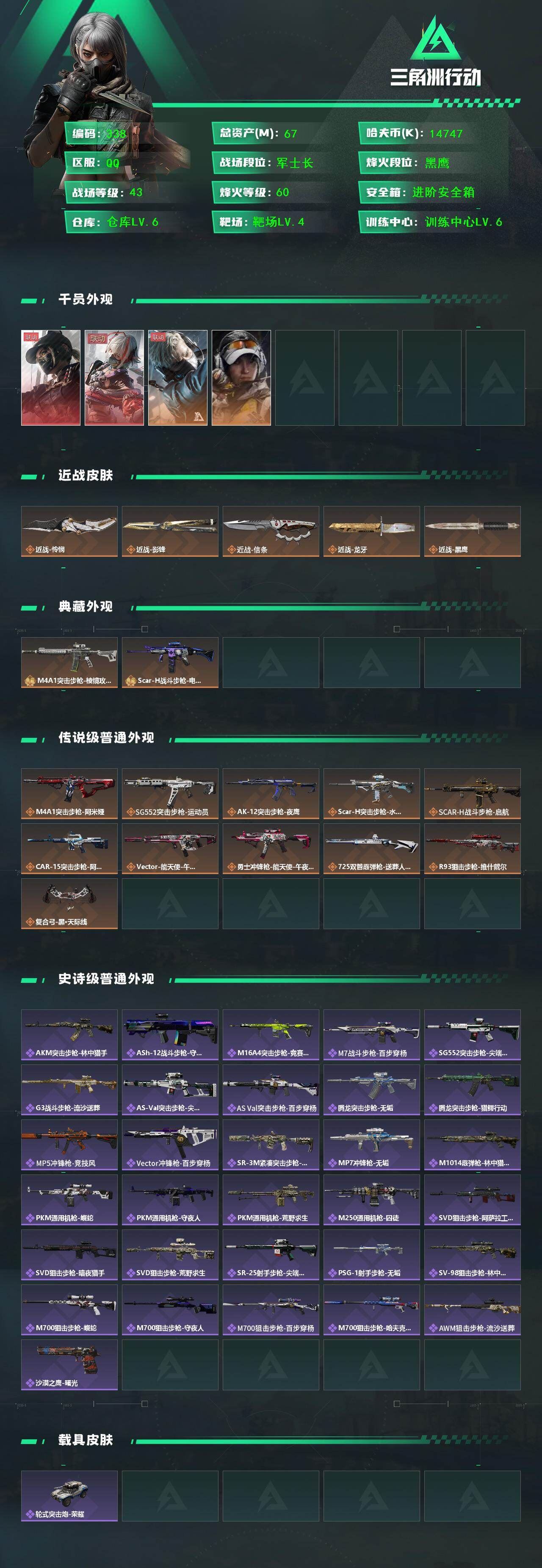 【游戏多多】【三角洲行动】【编号:17769】r50812 可二次qq,s7赛季安全箱6格,训练中心6级,67m总资产-14747k哈伏币-60烽火等级-黑鹰-43战场等级-军士长【干员外观】:露娜-黑·天际线,骇爪-维什戴尔,蜂医-送葬人·无题密令,露娜-金牌射手【近战皮肤】:近战-怜悯,近战-影锋,近战-信条,近战-龙牙,近战-黑鹰【典藏外观】:M4A1突击步枪-棱镜攻势,SCAR-H战斗步枪-电玩高手【传说外观】:M4A1突击步枪-阿米娅,SG552突击步枪-运动员,AK-12突击步枪-夜鹰,SCAR-H战斗步枪-水墨云图,SCAR-H战斗步枪-启航,CAR-15突击步枪-阿米娅,Vector冲锋枪-能天使-午夜邮差,勇士冲锋枪-能天使-午夜邮差,725双管霰弹枪-送葬人-无题密令,R93狙击步枪-维什戴尔,复合弓-黑·天际线【史诗外观】:AKM突击步枪-林中猎手,ASh-12战斗步枪-守夜人,M16A4突击步枪-竞赛选手,M7战斗步枪-百步穿杨,SG552突击步枪-尖端治疗,G3战斗步枪-流沙送葬,AS Val突击步枪-尖端治疗,AS Val突击步枪-百步穿杨,腾龙突击步枪-无垢,腾龙突击步枪-猎鳄行动,MP5冲锋枪-竞技风,Vector冲锋枪-百步穿杨,SR-3M紧凑突击步枪-荒野求生,MP7冲锋枪-无垢,M1014霰弹枪-林中猎手,PKM通用机枪-蝮蛇,PKM通用机枪-守夜人,PKM通用机枪-荒野求生,M250通用机枪-囚徒,SVD狙击步枪-阿萨拉工艺,SVD狙击步枪-暗夜猎手,SVD狙击步枪-荒野求生,SR-25射手步枪-尖端治疗,PSG-1射手步枪-无垢,SV-98狙击步枪-林中猎手,M700狙击步枪-蝮蛇,M700狙击步枪-守夜人,M700狙击步枪-百步穿杨,M700狙击步枪-哈夫克警备,AWM狙击步枪-流沙送葬,沙漠之鹰-曙光,各种道具详情看截图、低价出售找回包 赔、截图展示段位不代 表实际段位,如赛季更新等不可抗拒因素发生变化、时限道具不保证所剩时间、标题未写送点劵默认不送【卖号买号首选亿梦】