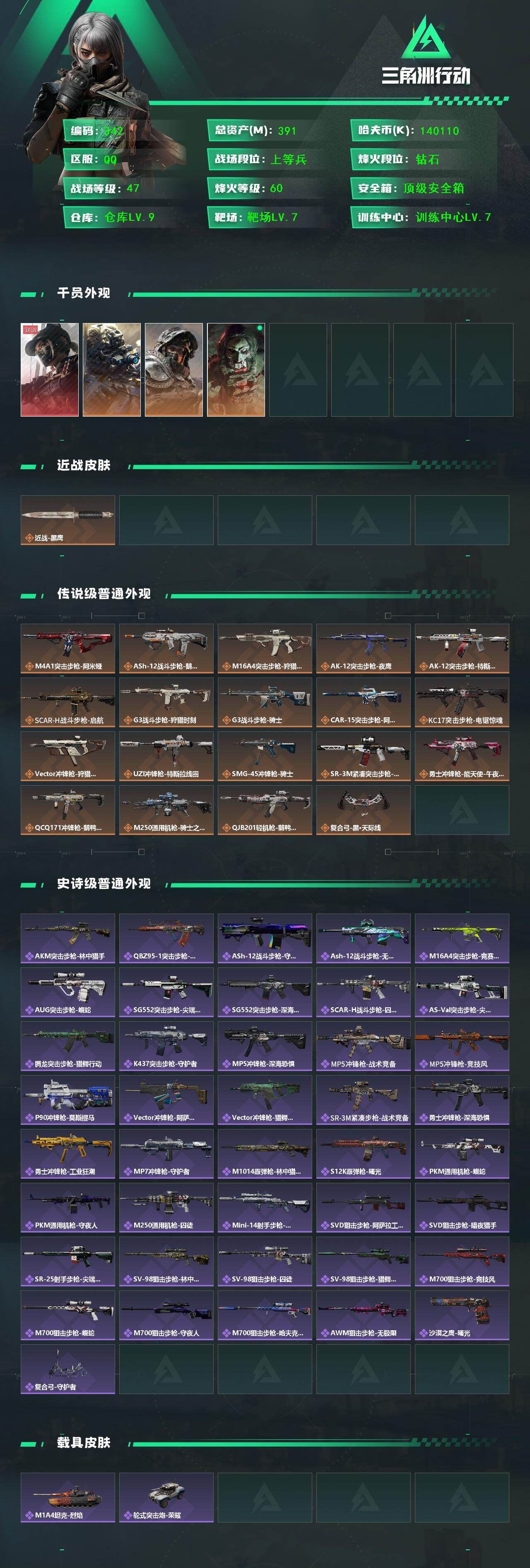 【游戏多多】【三角洲行动】【编号:17792】r50872 可二次qq,s7赛季安全箱9格,仓库9级,指挥中心6级,训练中心7级,靶场7级,收藏室2级,135发AWM子弹,391m总资产-140110k哈伏币-60烽火等级-钻石-47战场等级-上等兵【干员外观】:露娜-黑·天际线,无名-夜鹰,深蓝-不破誓约,红狼-电锯惊魂【近战皮肤】:近战-黑鹰【热门藏品】:非洲之心【挂饰】:挂饰-毁灭之源【传说外观】:M4A1突击步枪-阿米娅,ASh-12战斗步枪-鹅鸭杀,M16A4突击步枪-狩猎时刻,AK-12突击步枪-夜鹰,AK-12突击步枪-特斯拉线圈,SCAR-H战斗步枪-启航,G3战斗步枪-狩猎时刻,G3战斗步枪-骑士,CAR-15突击步枪-阿米娅,KC17突击步枪-电锯惊魂,Vector冲锋枪-狩猎时刻,UZI冲锋枪-特斯拉线圈,SMG-45冲锋枪-骑士,SR-3M紧凑突击步枪-特斯拉线圈,勇士冲锋枪-能天使-午夜邮差,QCQ171冲锋枪-鹅鸭杀,M250通用机枪-骑士之心,QJB201轻机枪-鹅鸭杀,复合弓-黑·天际线,各种道具详情看截图、低价出售找回包 赔、截图展示段位不代 表实际段位,如赛季更新等不可抗拒因素发生变化、时限道具不保证所剩时间、标题未写送点劵默认不送【卖号买号首选亿梦】