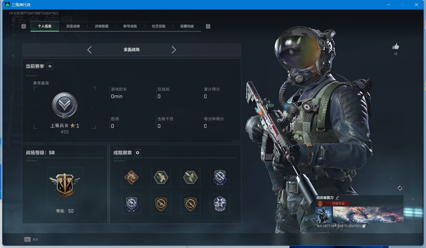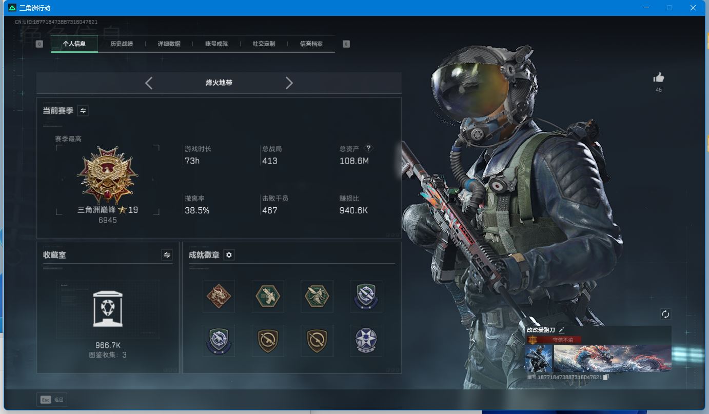 【游戏多多】【三角洲行动】【编号:17884】【赛季巅峰19星!行动等级60、战场等级50、总资产108.6M】威龙-壮志凌云、无名-夜鹰、骇爪-维什戴尔!部门:33333!特勤处:仓库9收藏室1其余全满